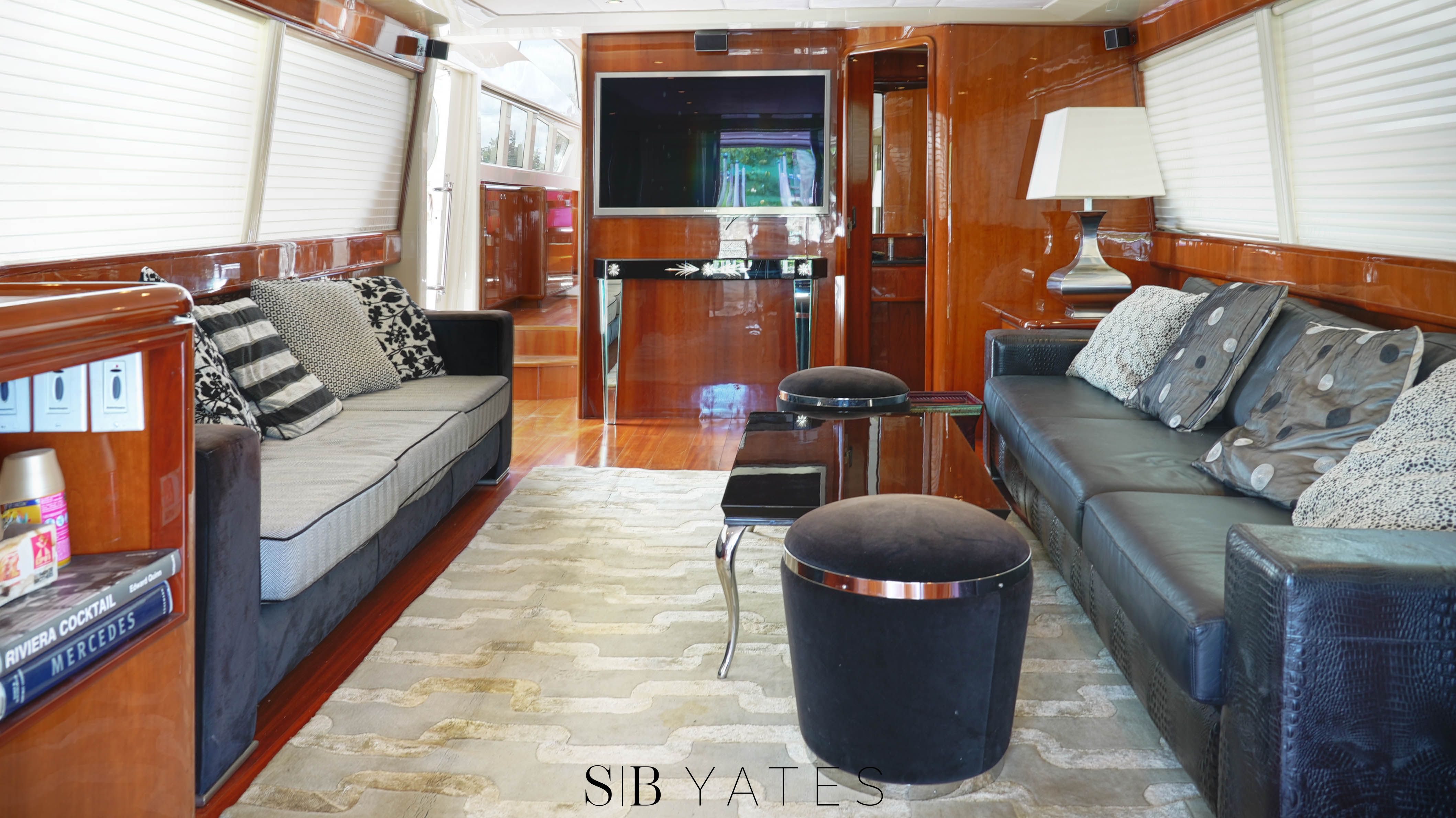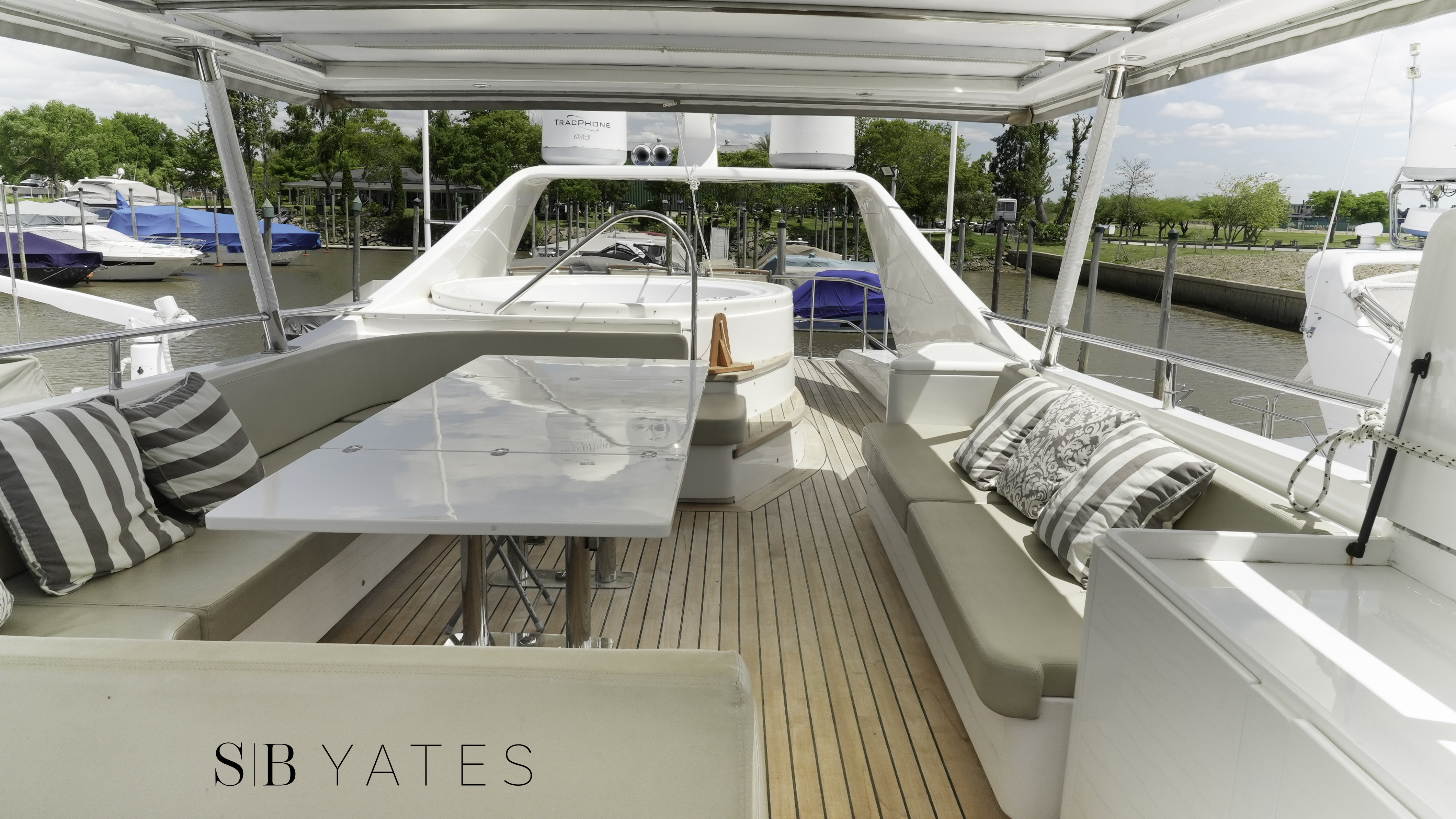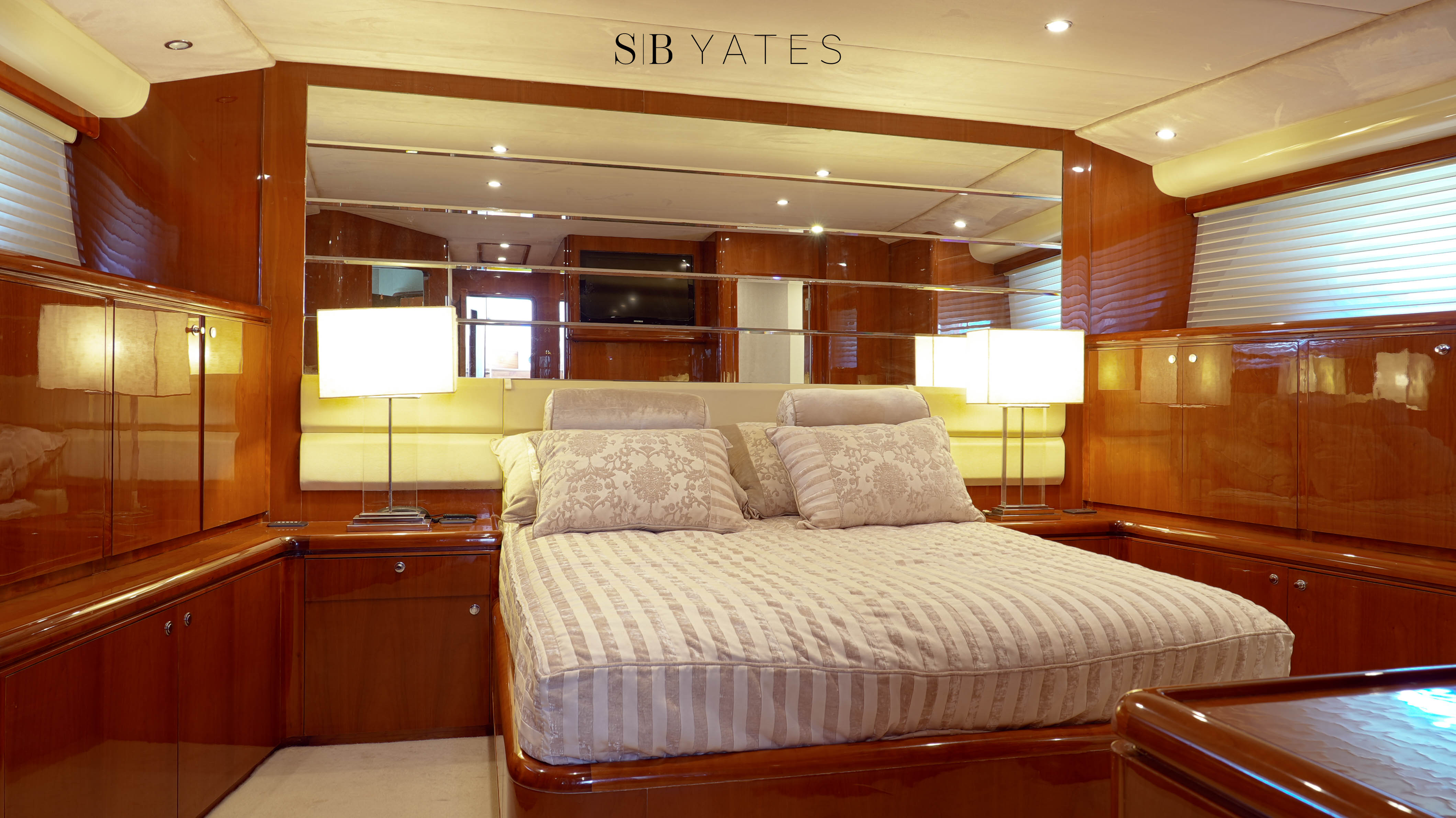 Salón principal: Dos sillones, bar empotrado, mueble con centro de música Yamaha, play station, Direct TV, Televisión Samsung 55´ - Camarote principal en popa: cama 2,00x1.80 mts, TV Samsung 32´, play station ,baño en suite con jacuzzi para dos personas con hidromasaje, inodoro y bidet, cuarto vestidor independiente - Camarote Estribor: cama 1,50 x 2,00 mts TV Samsung 28´, play station . baño en suite con yacuzi para 1 persona con hidromasaje, inodoro y bidet - Camarote babor: dos camas de 0.80x 2,00 mts, amplio baño en suite - Camarote Principal en proa: Cama de 2,00x1,80 mts, importantes placares, TV Samsung 32´, dos baños. Uno completo con jacuzzi con hidromasaje para una persona, y otro con toilette e inodoro. Todos los camarotes con TV leds 32” y 28”, con play station y Direct TV, incluido marinero. Salón principal. 2 juegos de sillones, TV Leds Smart TV de 55”, sistema de sonido home theatre Yamaha, play station y Direct TV,, bar incorporado dentro de mueble, toilette Comedor: mesa para 8 personas, vajillero y lugar de guarda mantelería.Fly Bridge: compuesto de comando, mueble porta vajilla y heladera bajo mesada, pileta y canillaría caliente, dinette para 14 personas, yacuzzi para 6 personas con iluminación, hidromasaje y aireadores con carga de agua potable fría, caliente y otra de agua de mar, solárium con 3 reposeras italianas, techo de fibra de vidrio y lona desmontable. Cerramiento transparente de todo el ambiente. Cockpit: Mesa para 10 personas en madera cherry, con 6 sillones italianos de exterior, y sillón en fibra incorporado para 4 personas, salidas de música parlantes marinos, Fabricadora de cubitos italiana. Camarote de marinero: con 2 camas de 0.70x2,00 mts, importantes placares y baño completo y cómodo.