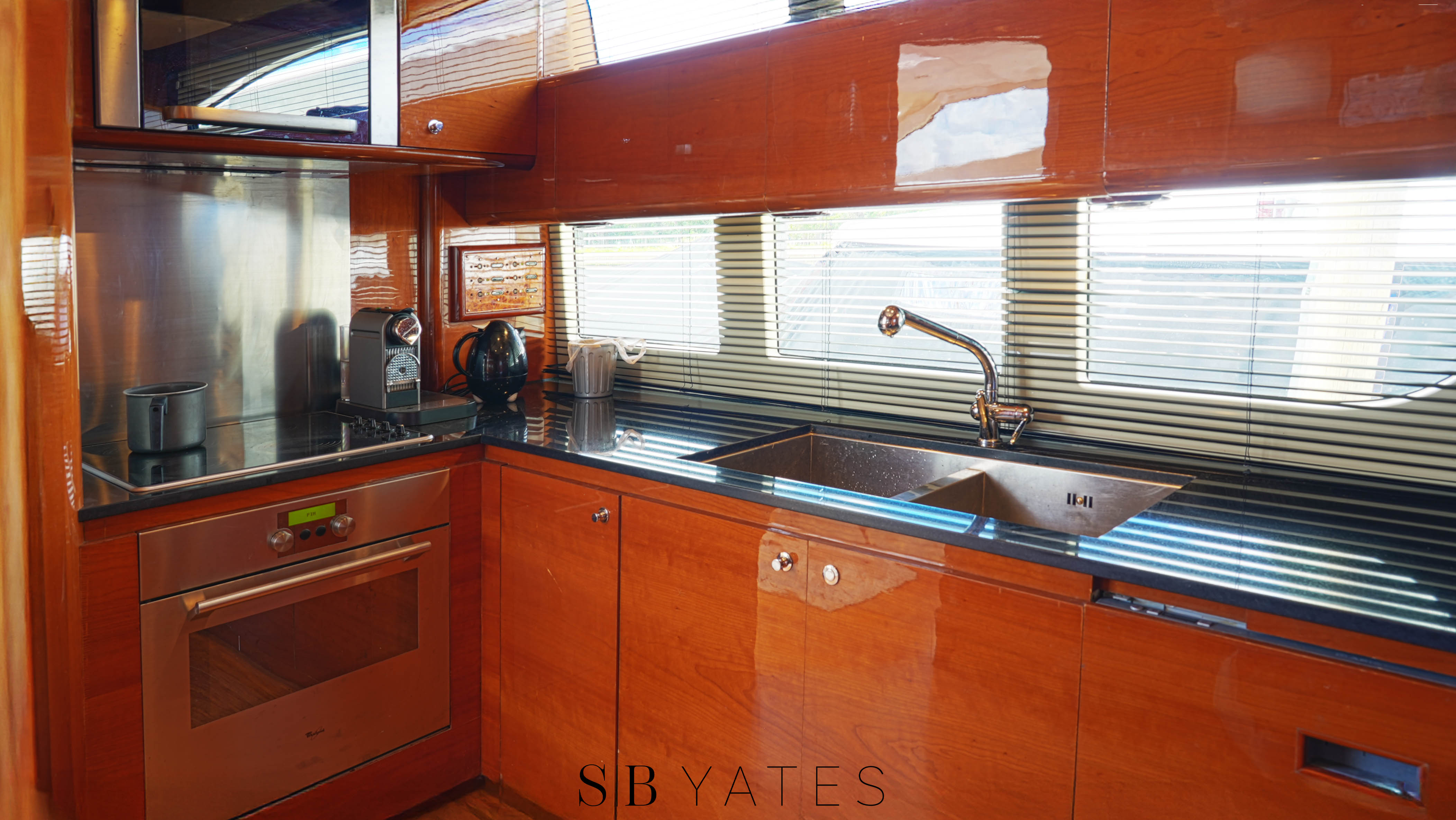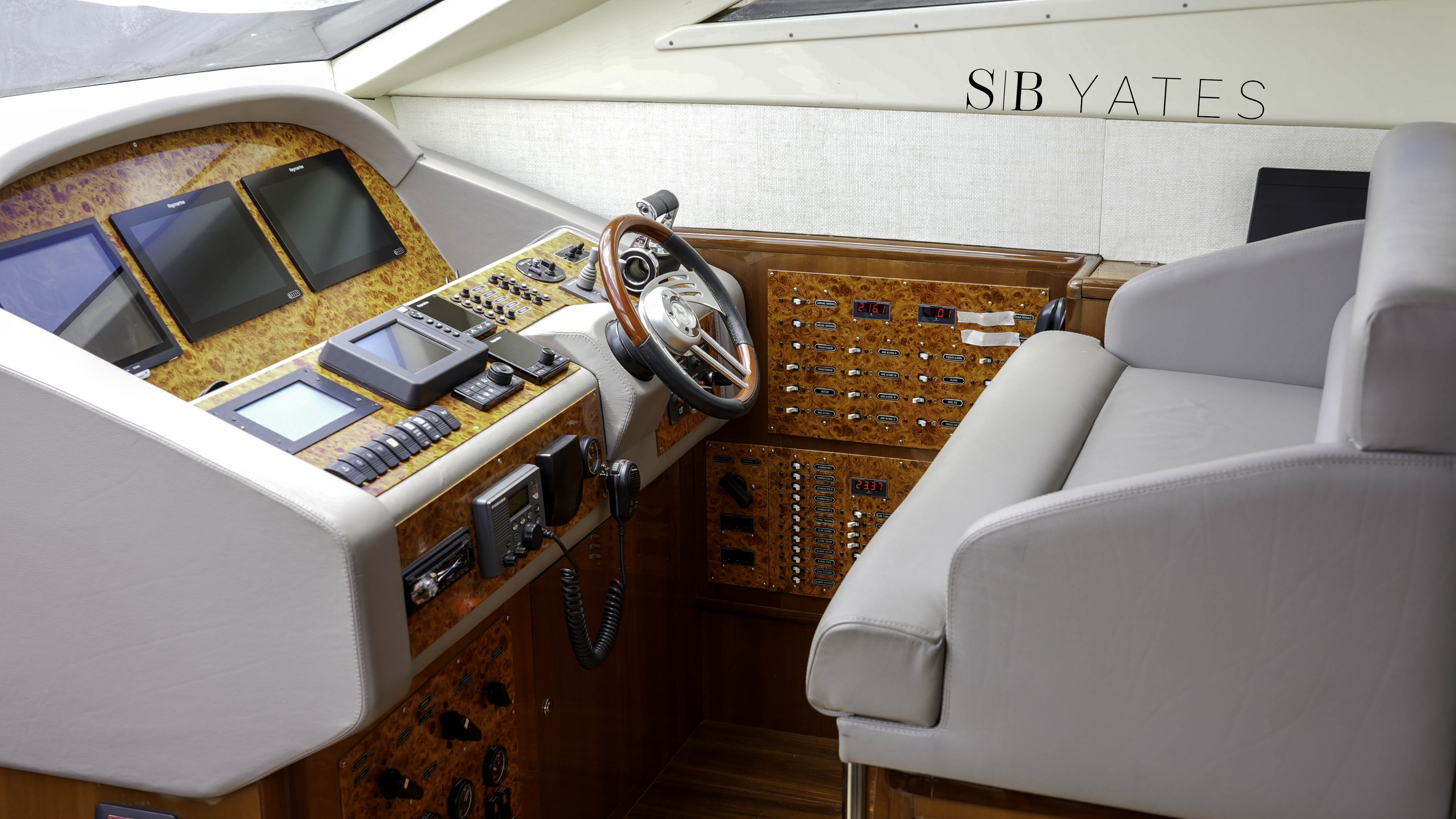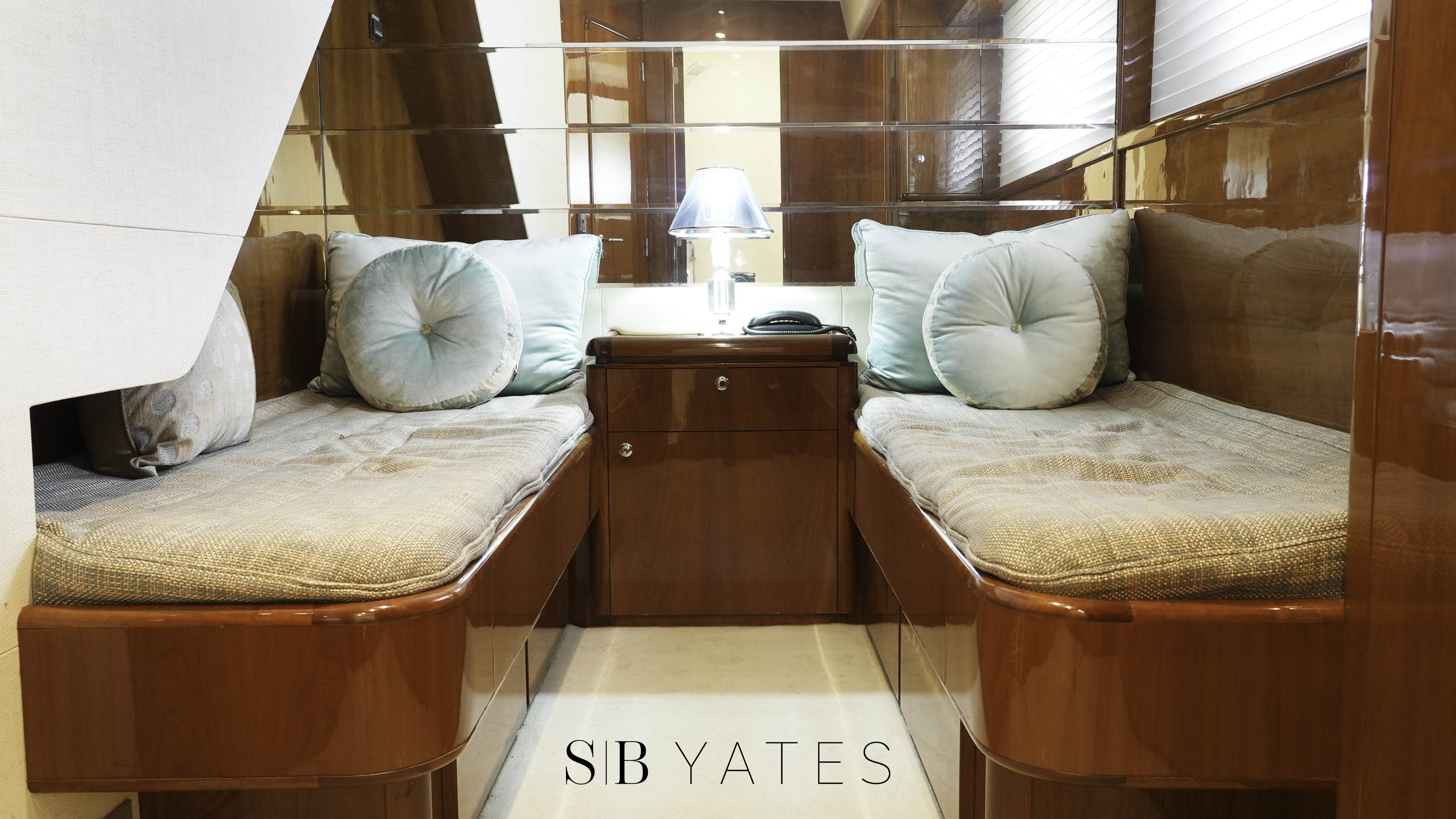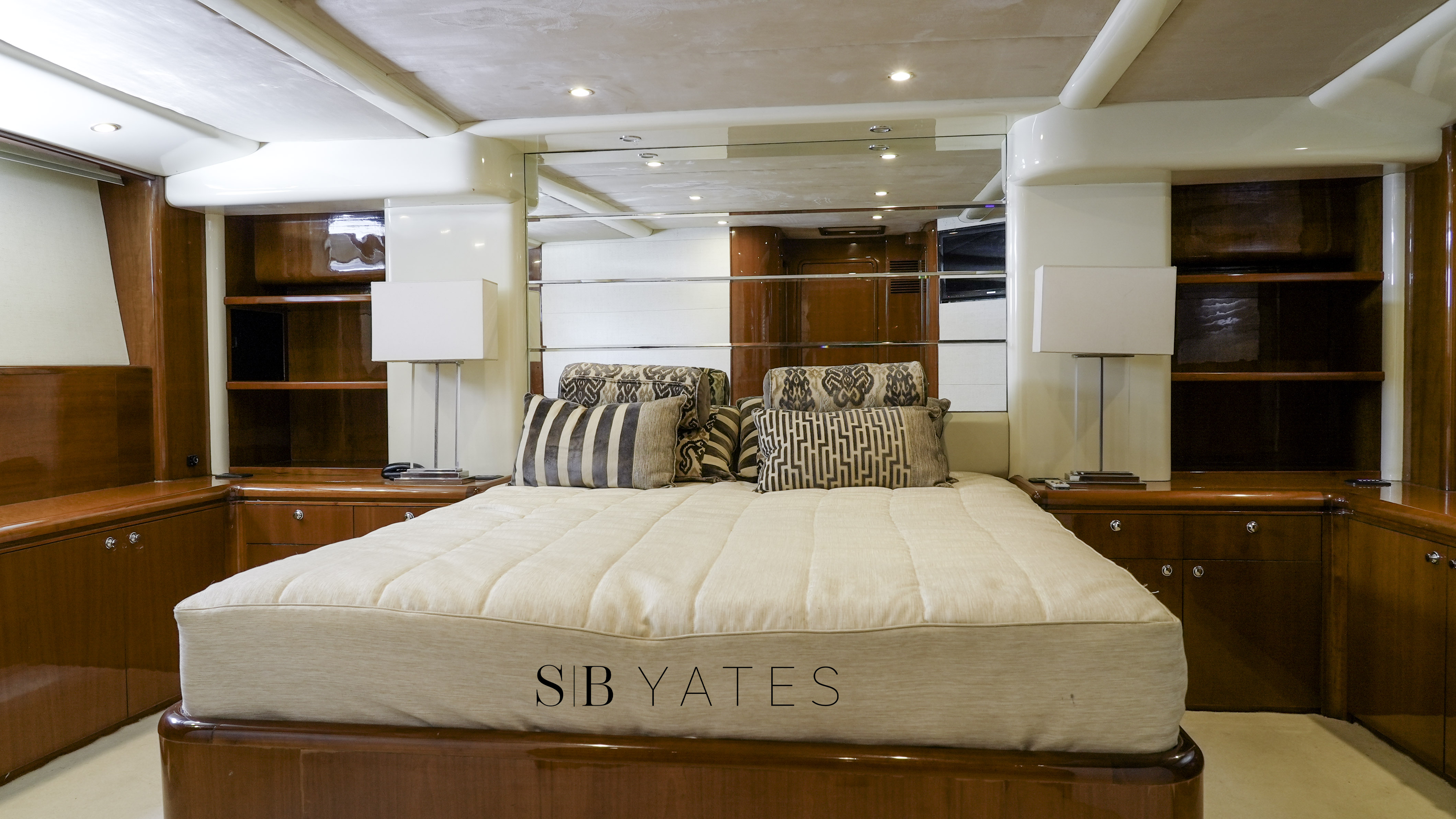 Salón principal: Dos sillones, bar empotrado, mueble con centro de música Yamaha, play station, Direct TV, Televisión Samsung 55´ - Camarote principal en popa: cama 2,00x1.80 mts, TV Samsung 32´, play station ,baño en suite con jacuzzi para dos personas con hidromasaje, inodoro y bidet, cuarto vestidor independiente - Camarote Estribor: cama 1,50 x 2,00 mts TV Samsung 28´, play station . baño en suite con yacuzi para 1 persona con hidromasaje, inodoro y bidet - Camarote babor: dos camas de 0.80x 2,00 mts, amplio baño en suite - Camarote Principal en proa: Cama de 2,00x1,80 mts, importantes placares, TV Samsung 32´, dos baños. Uno completo con jacuzzi con hidromasaje para una persona, y otro con toilette e inodoro. Todos los camarotes con TV leds 32” y 28”, con play station y Direct TV, incluido marinero. Salón principal. 2 juegos de sillones, TV Leds Smart TV de 55”, sistema de sonido home theatre Yamaha, play station y Direct TV,, bar incorporado dentro de mueble, toilette Comedor: mesa para 8 personas, vajillero y lugar de guarda mantelería.Fly Bridge: compuesto de comando, mueble porta vajilla y heladera bajo mesada, pileta y canillaría caliente, dinette para 14 personas, yacuzzi para 6 personas con iluminación, hidromasaje y aireadores con carga de agua potable fría, caliente y otra de agua de mar, solárium con 3 reposeras italianas, techo de fibra de vidrio y lona desmontable. Cerramiento transparente de todo el ambiente. Cockpit: Mesa para 10 personas en madera cherry, con 6 sillones italianos de exterior, y sillón en fibra incorporado para 4 personas, salidas de música parlantes marinos, Fabricadora de cubitos italiana. Camarote de marinero: con 2 camas de 0.70x2,00 mts, importantes placares y baño completo y cómodo.