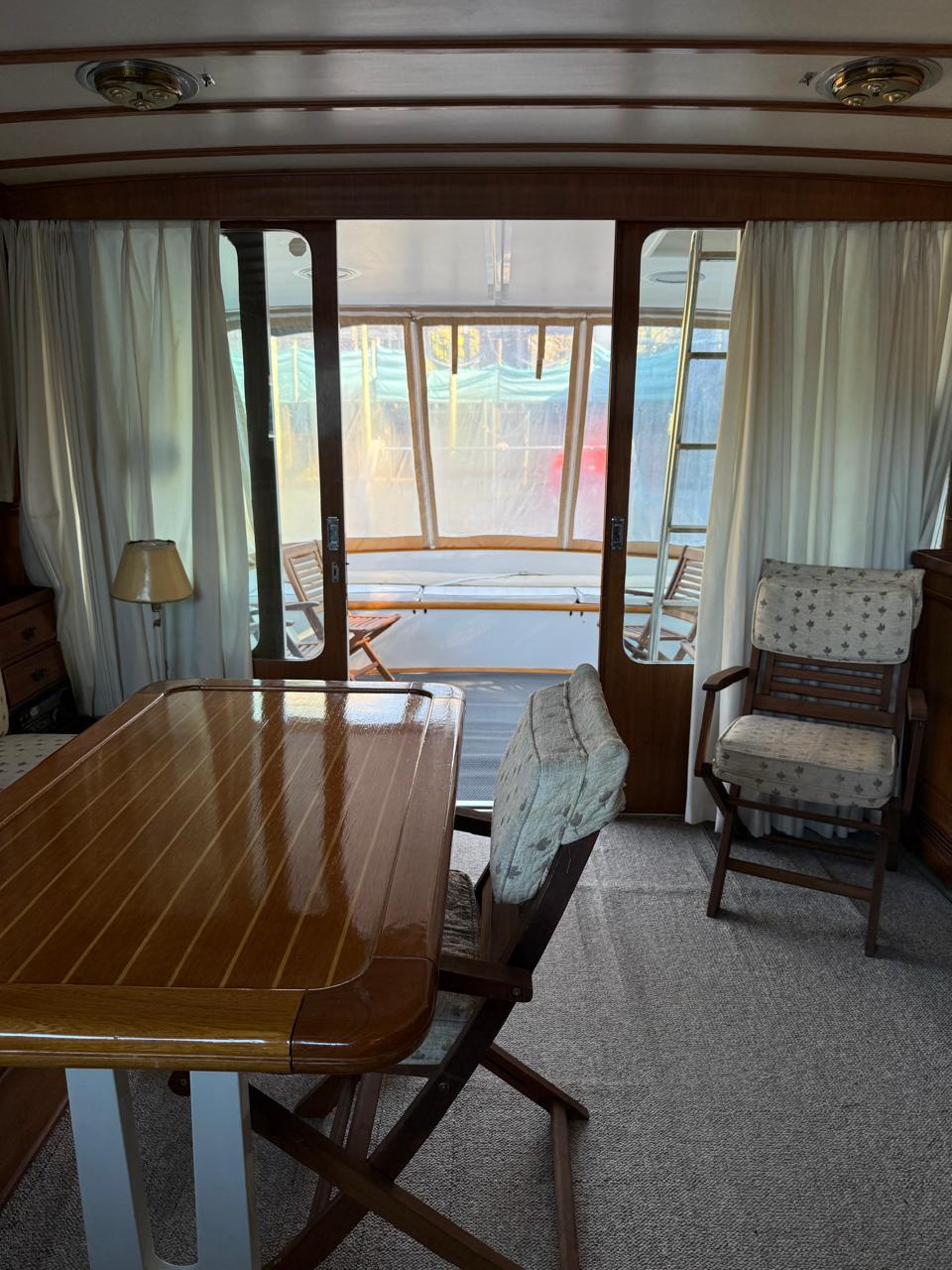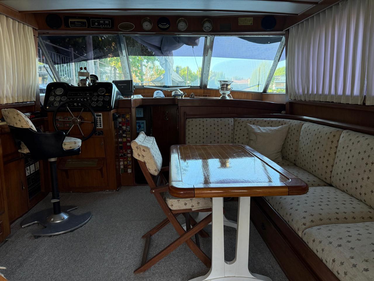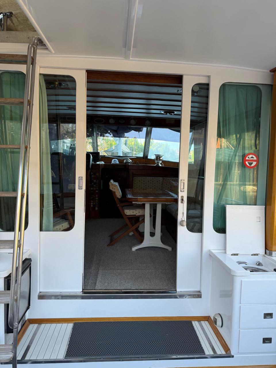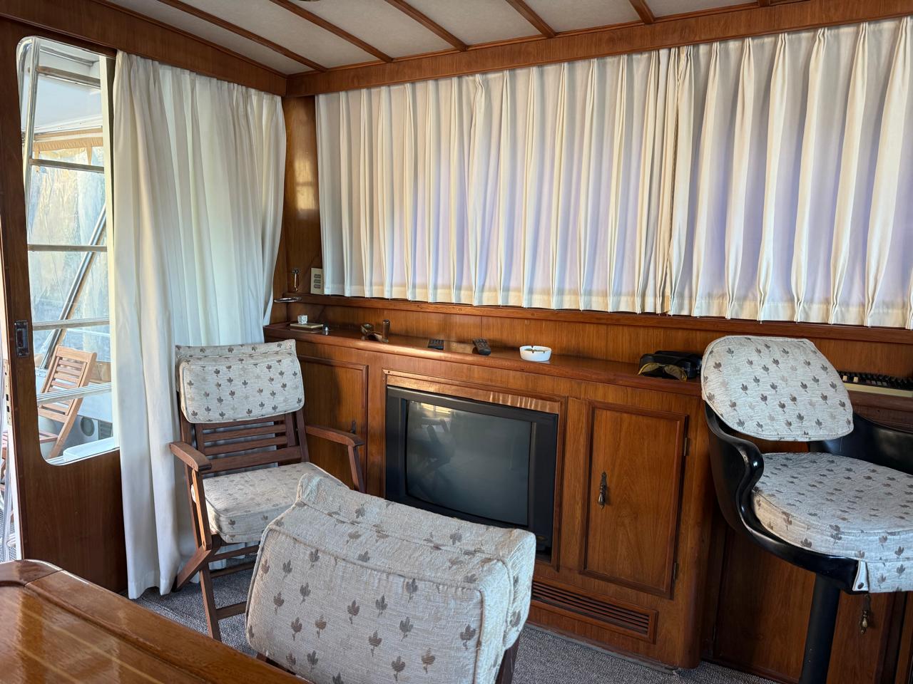 Salón y timonera con sillón, mesa, alfombra, TV y amplios espacios de guardado.