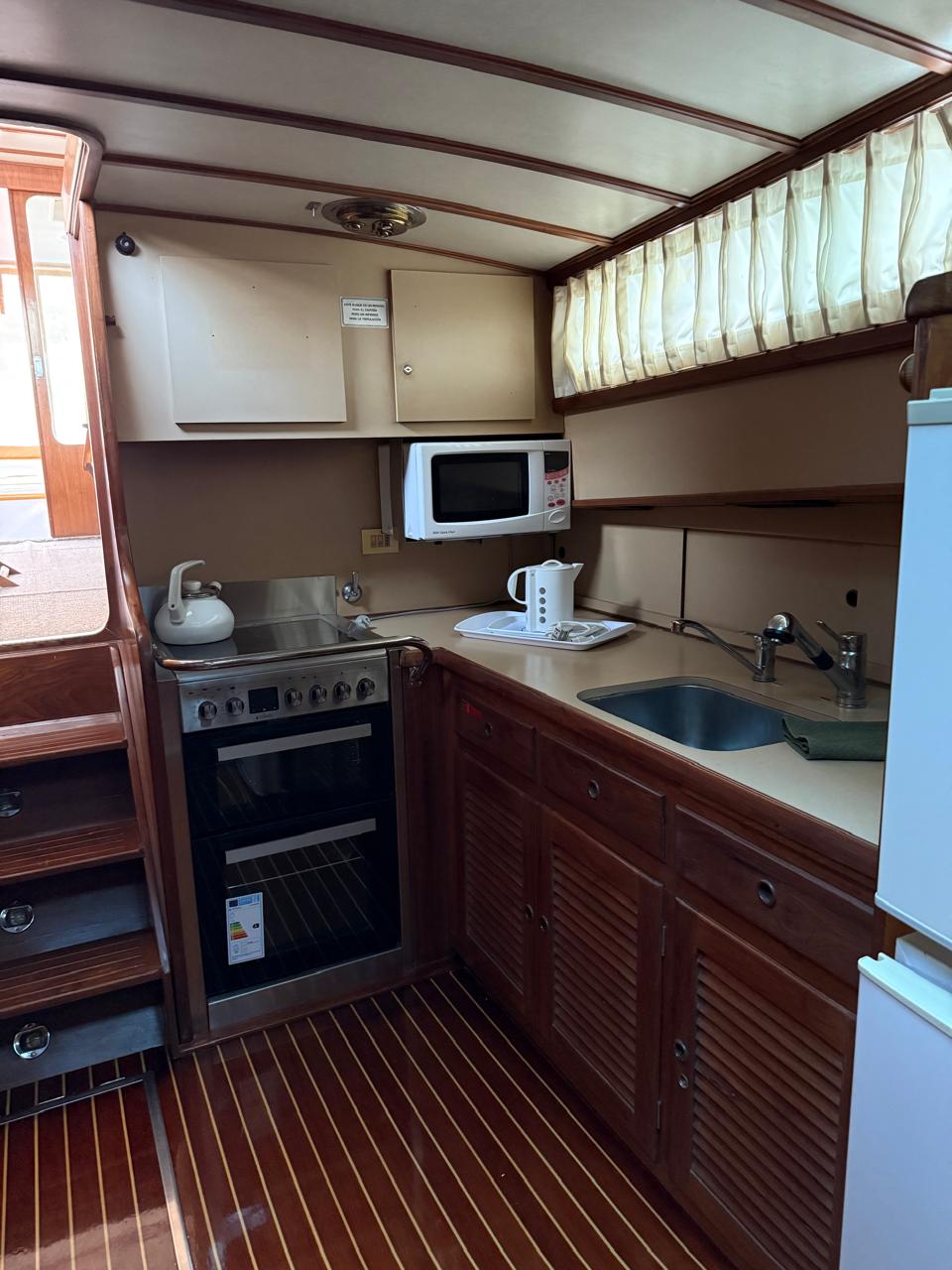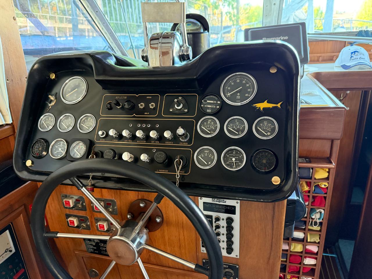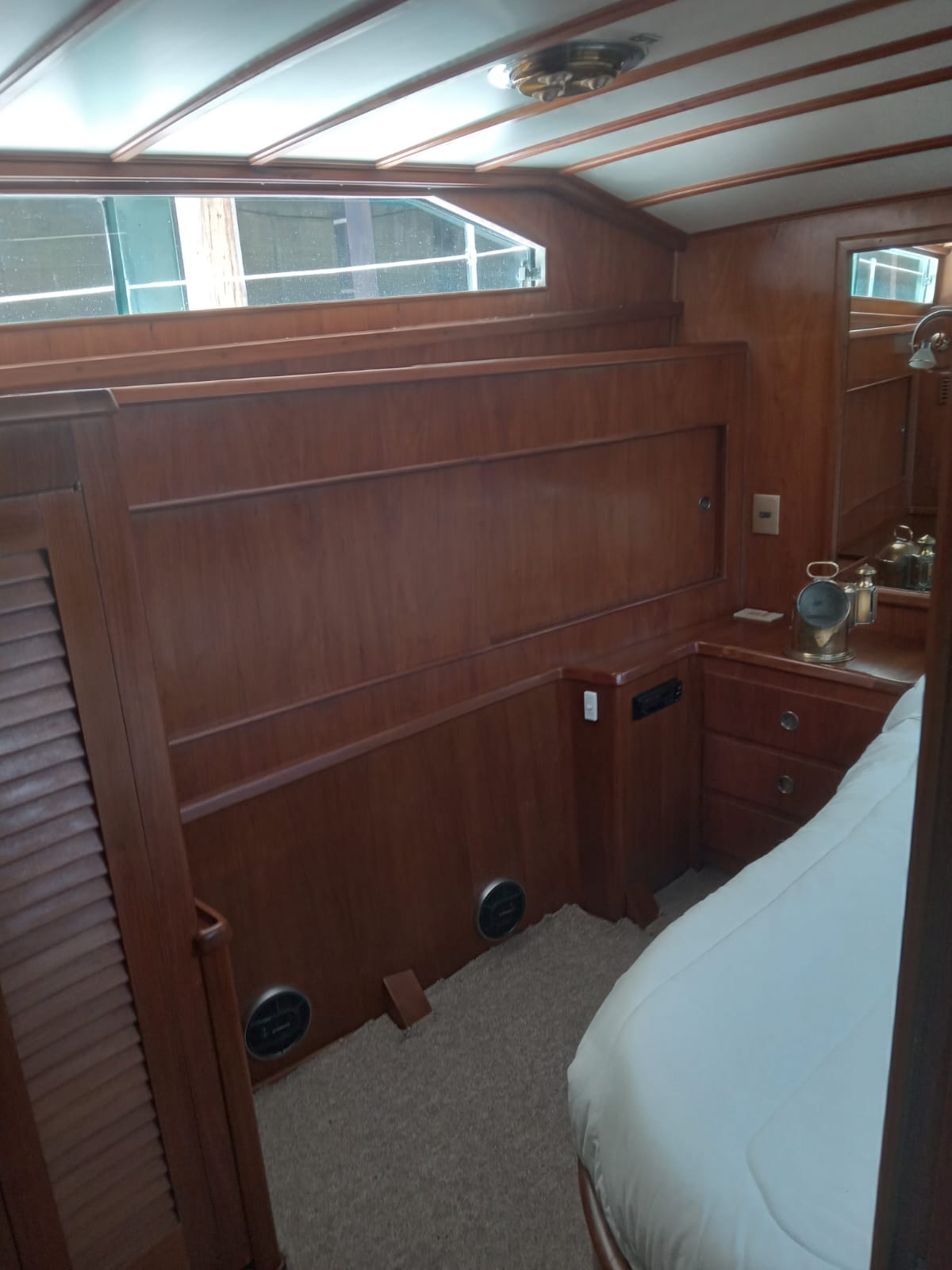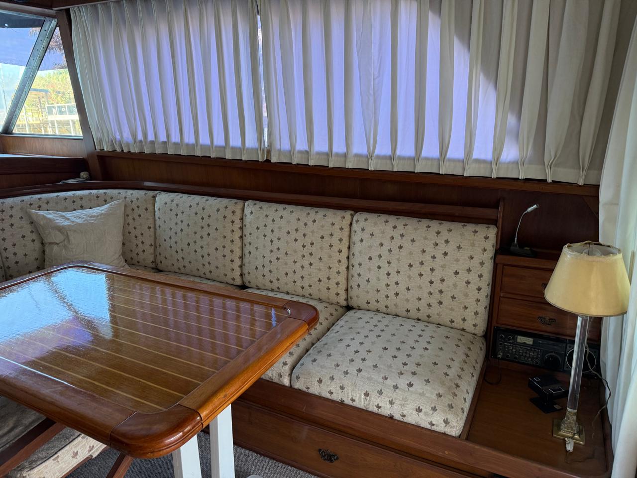 Salón y timonera con sillón, mesa, alfombra, TV y amplios espacios de guardado.