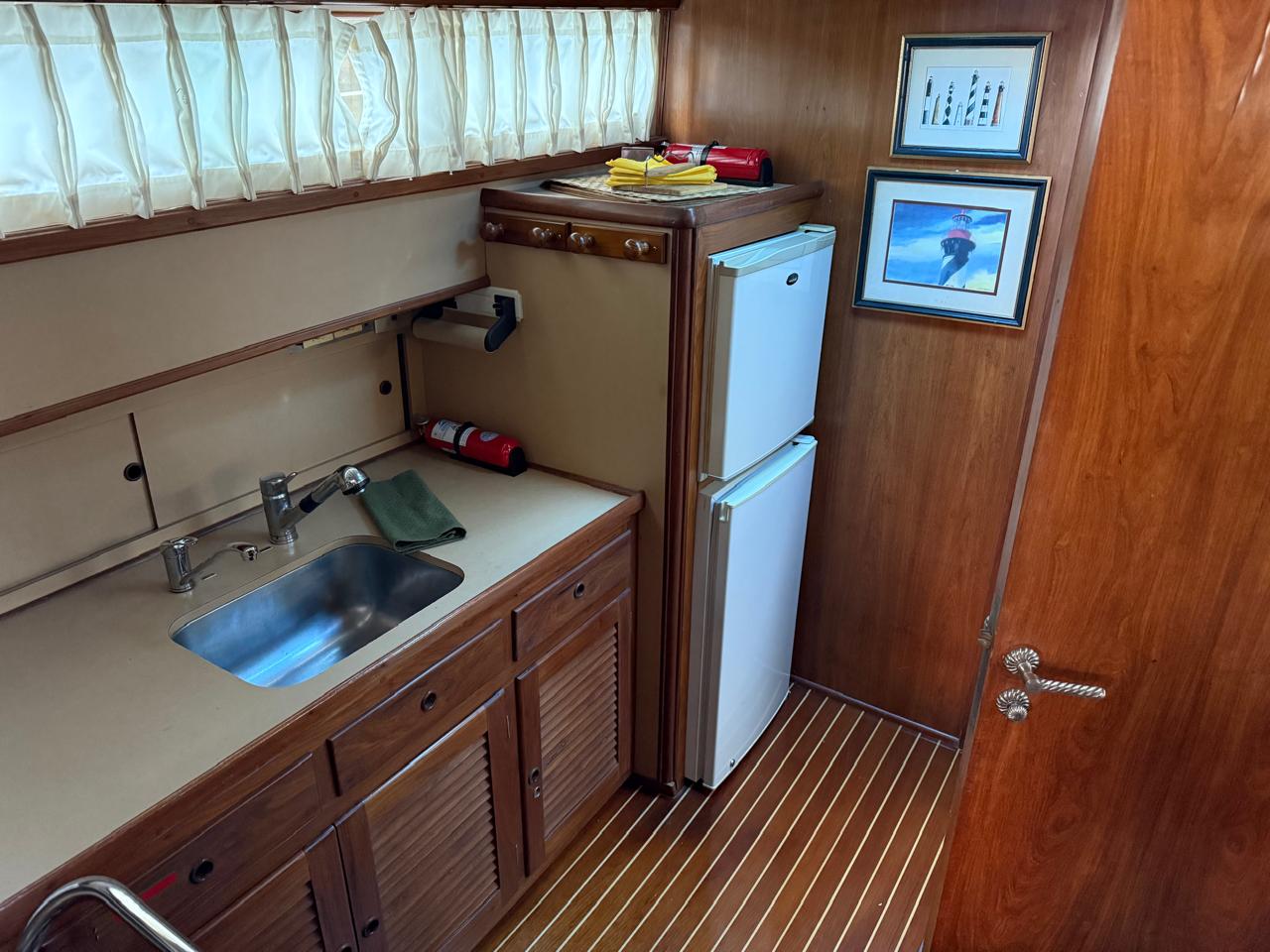 Cockpit con bacha, mesa, sillas, cerramiento transparente y acceso al fly por escalera.