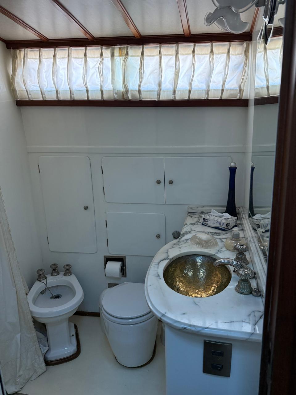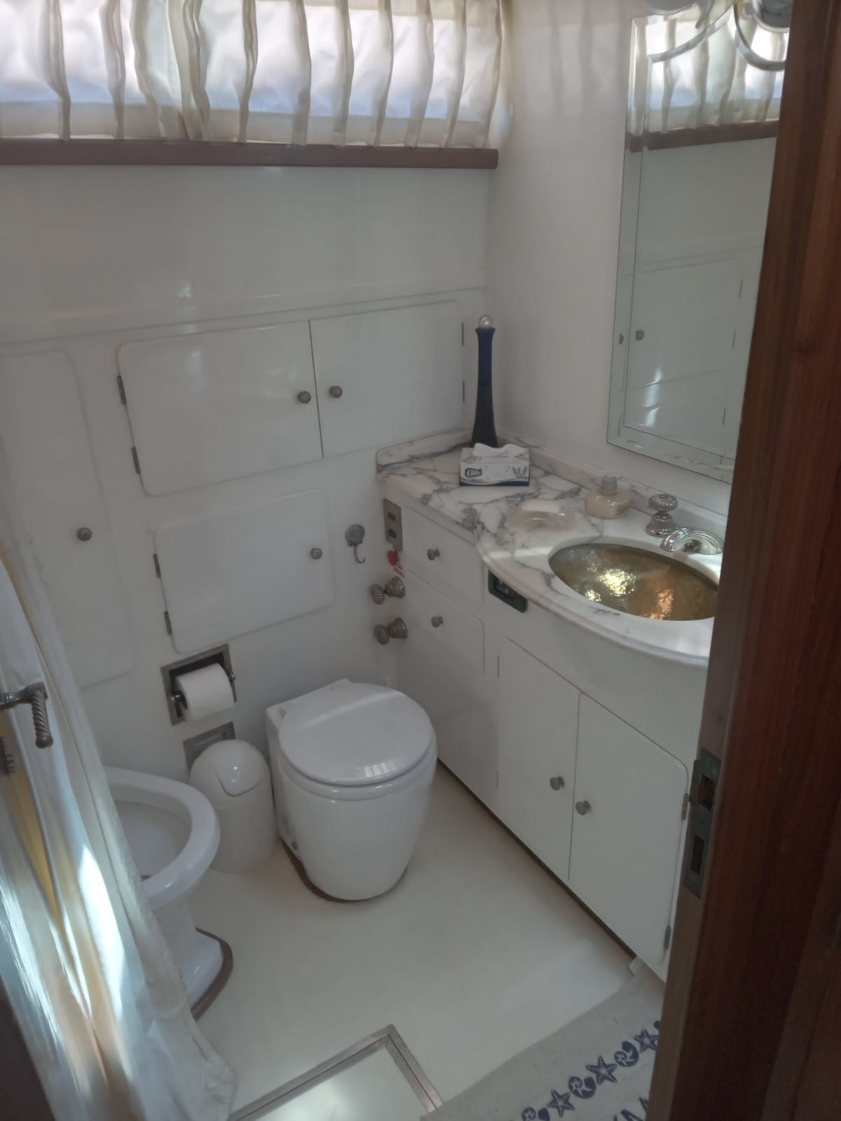 Baño completo con mesada de mármol en el lavabo.