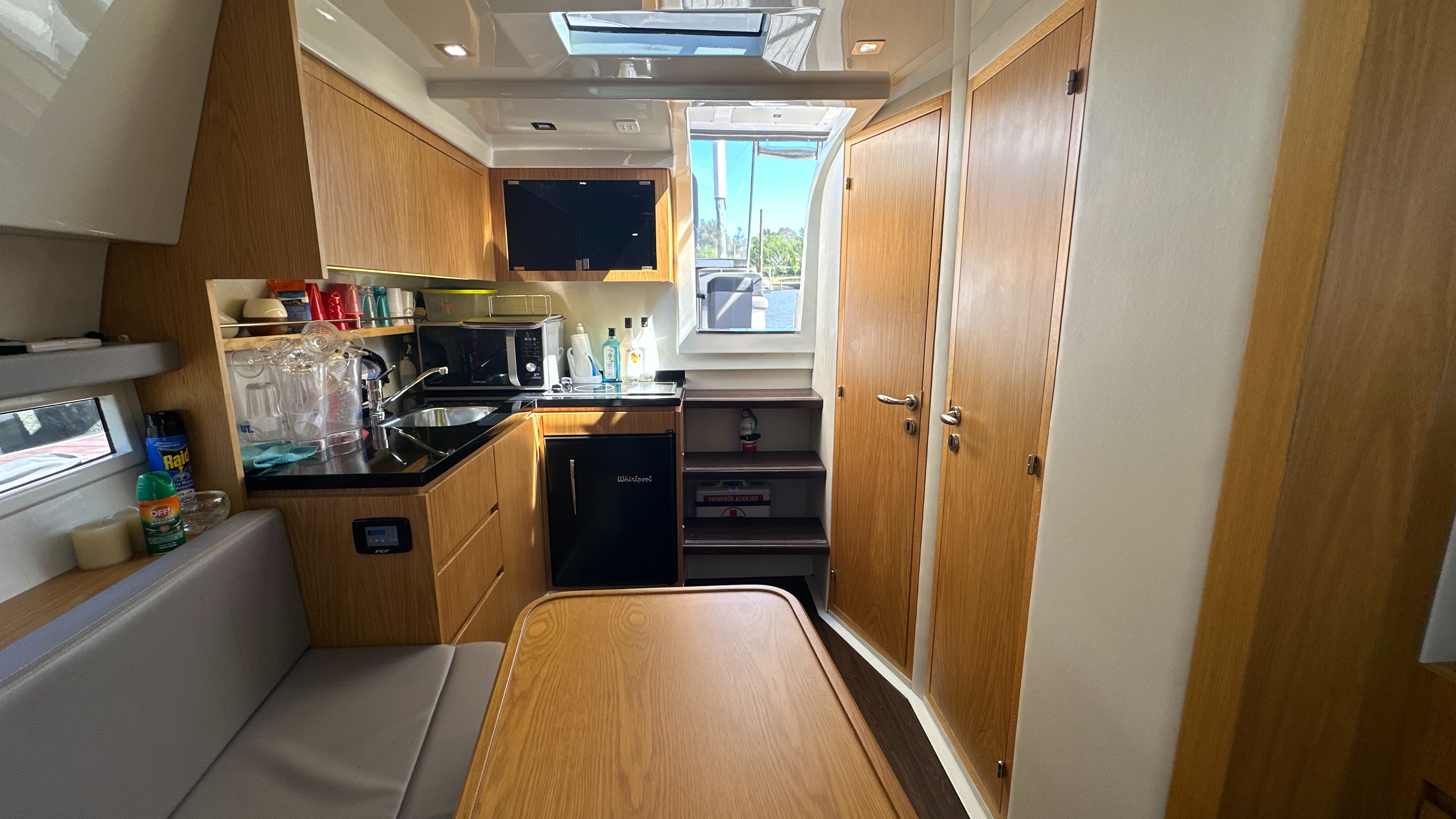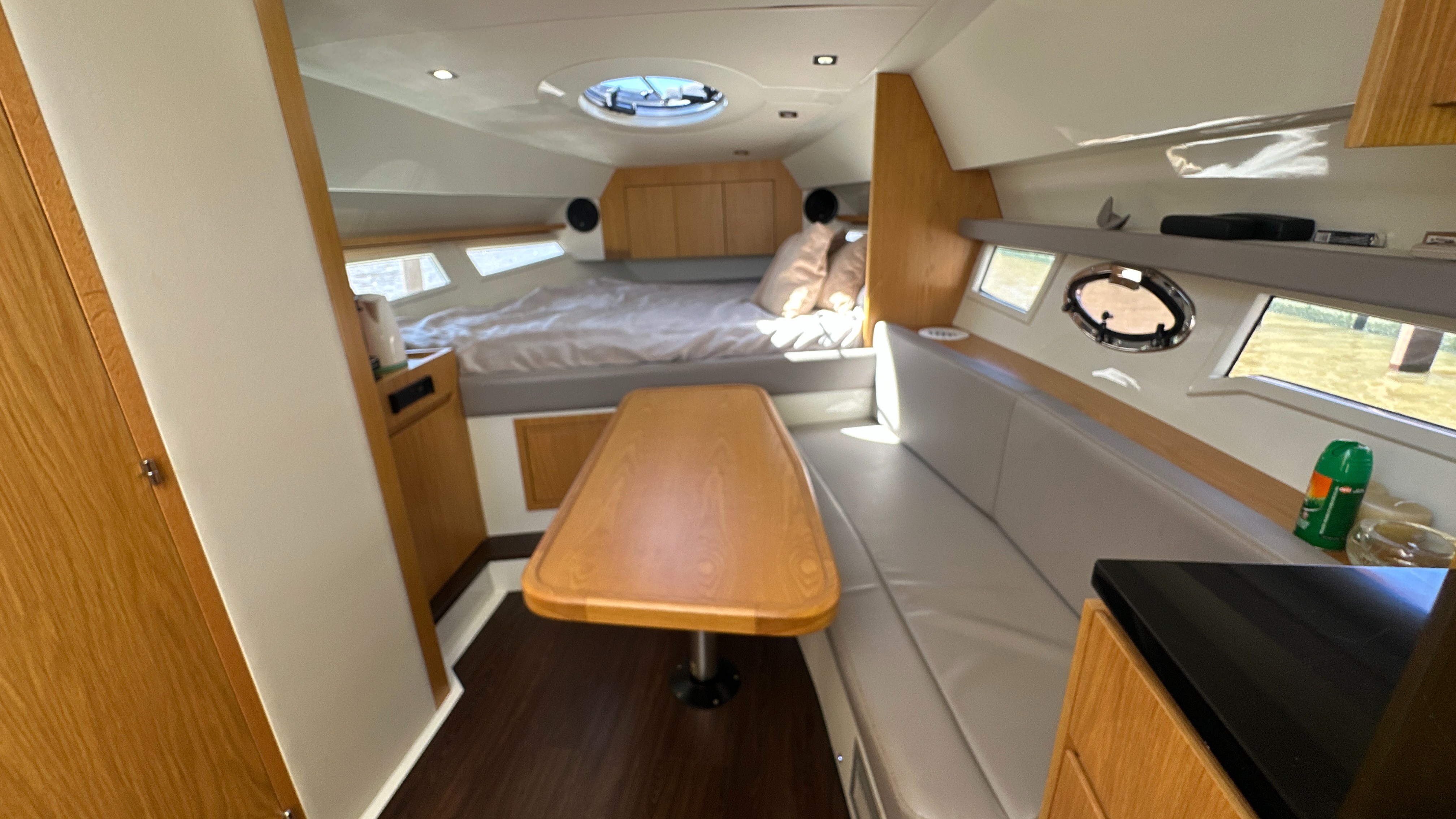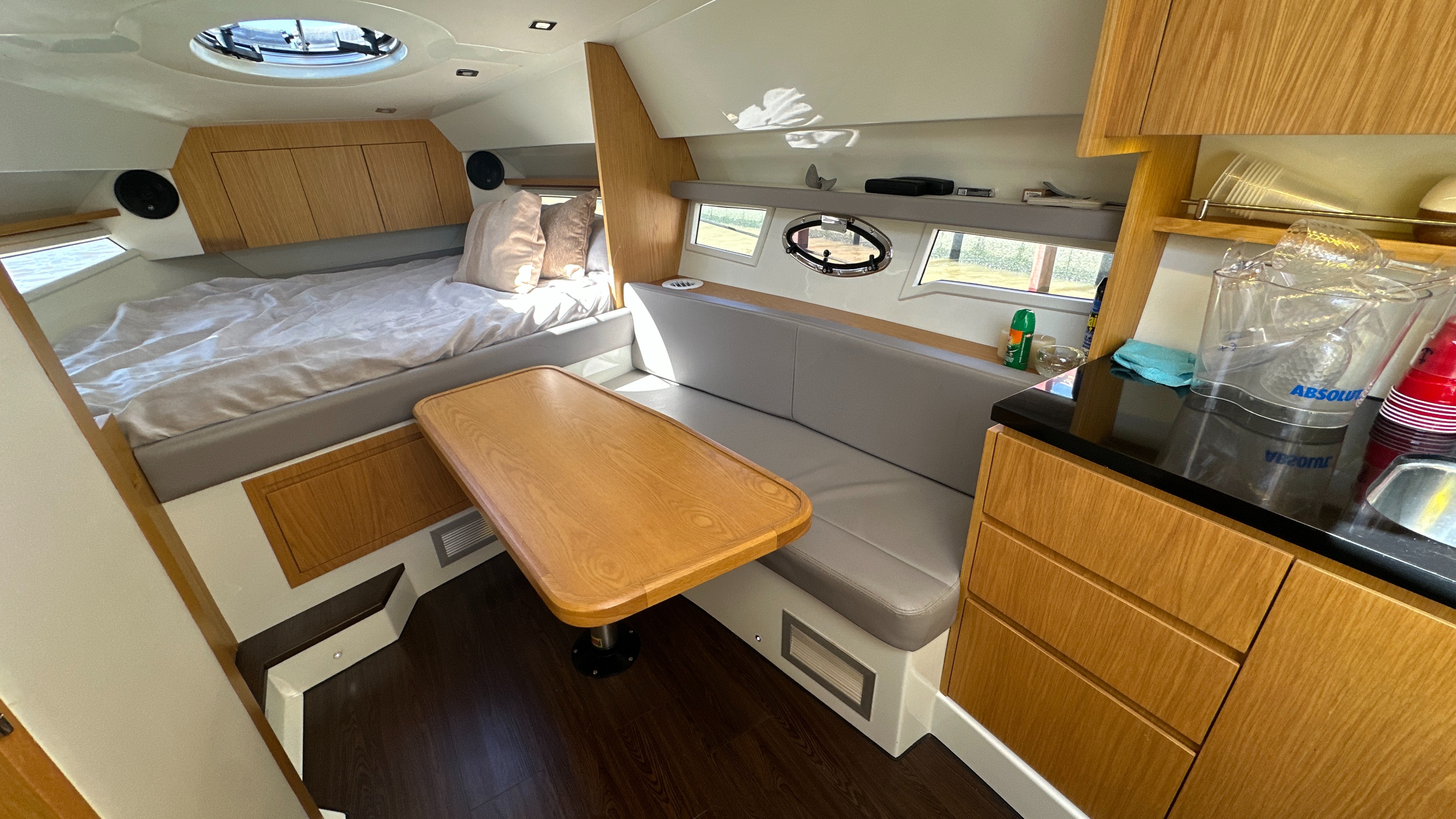 Cama doble en proa, sobre estribor mesa dinette y cocina, sobre babor baño con box de ducha y acceso a camarote de popa con cama doble.