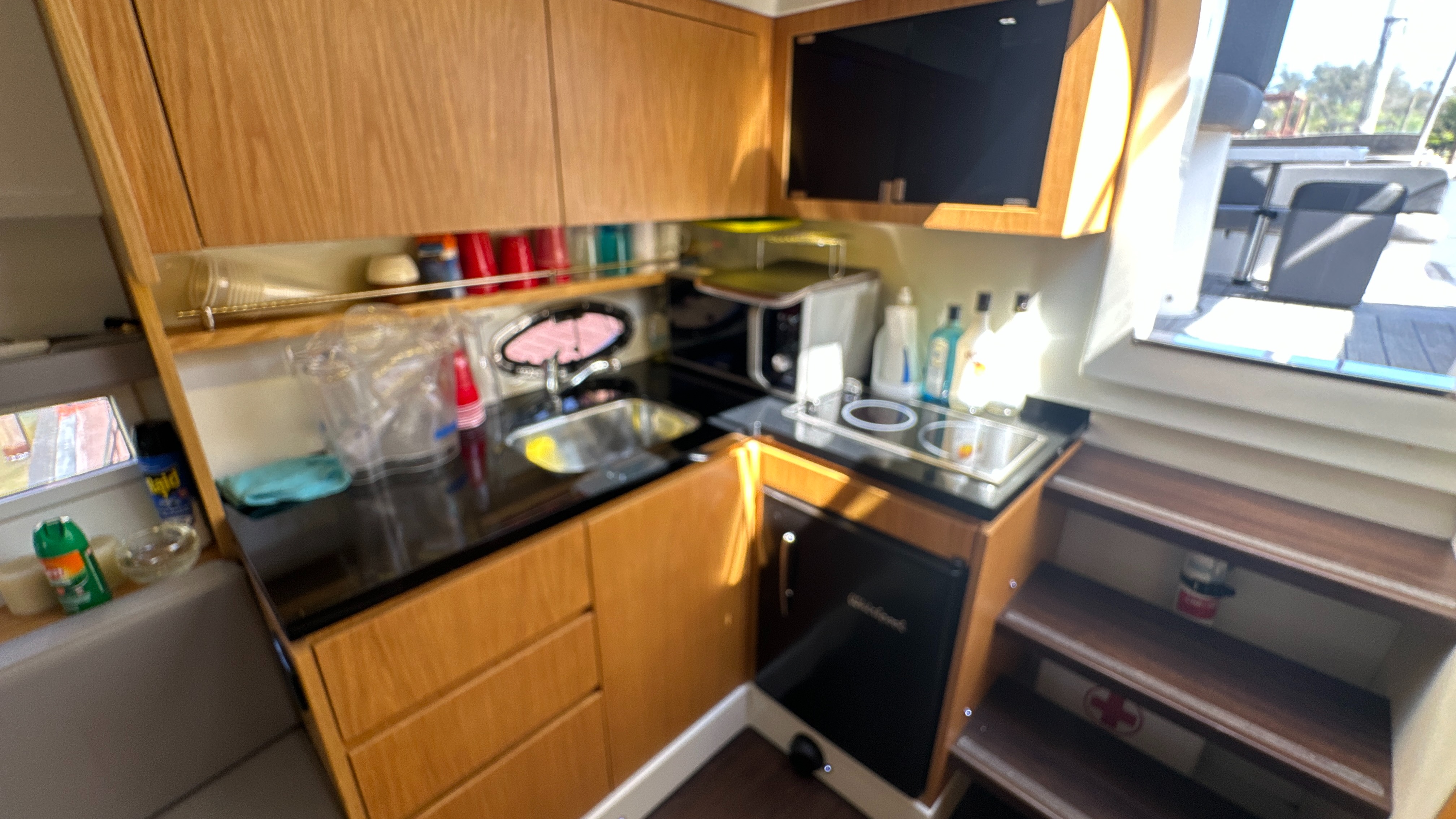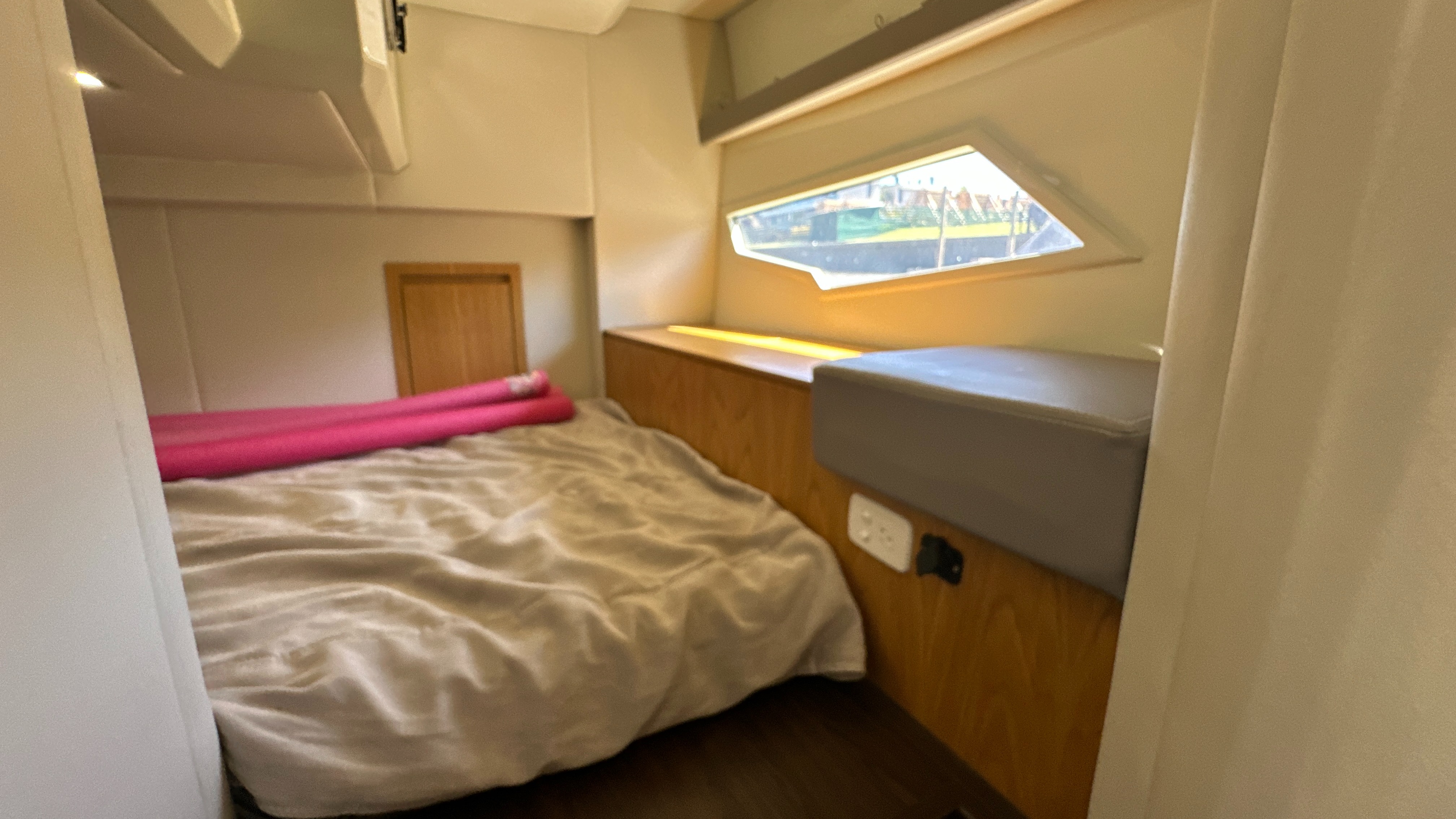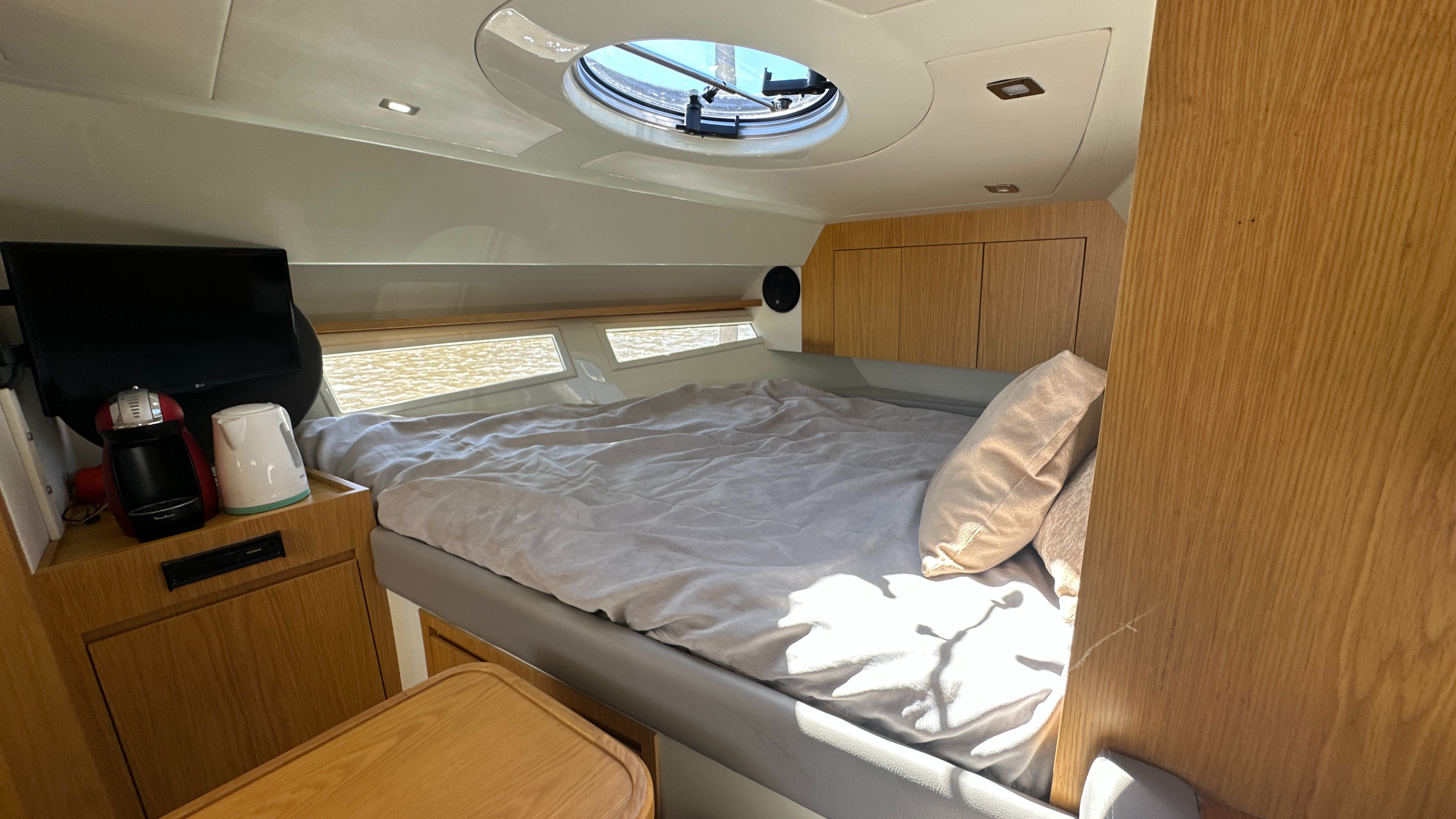 Cama doble en proa, sobre estribor mesa dinette y cocina, sobre babor baño con box de ducha y acceso a camarote de popa con cama doble.