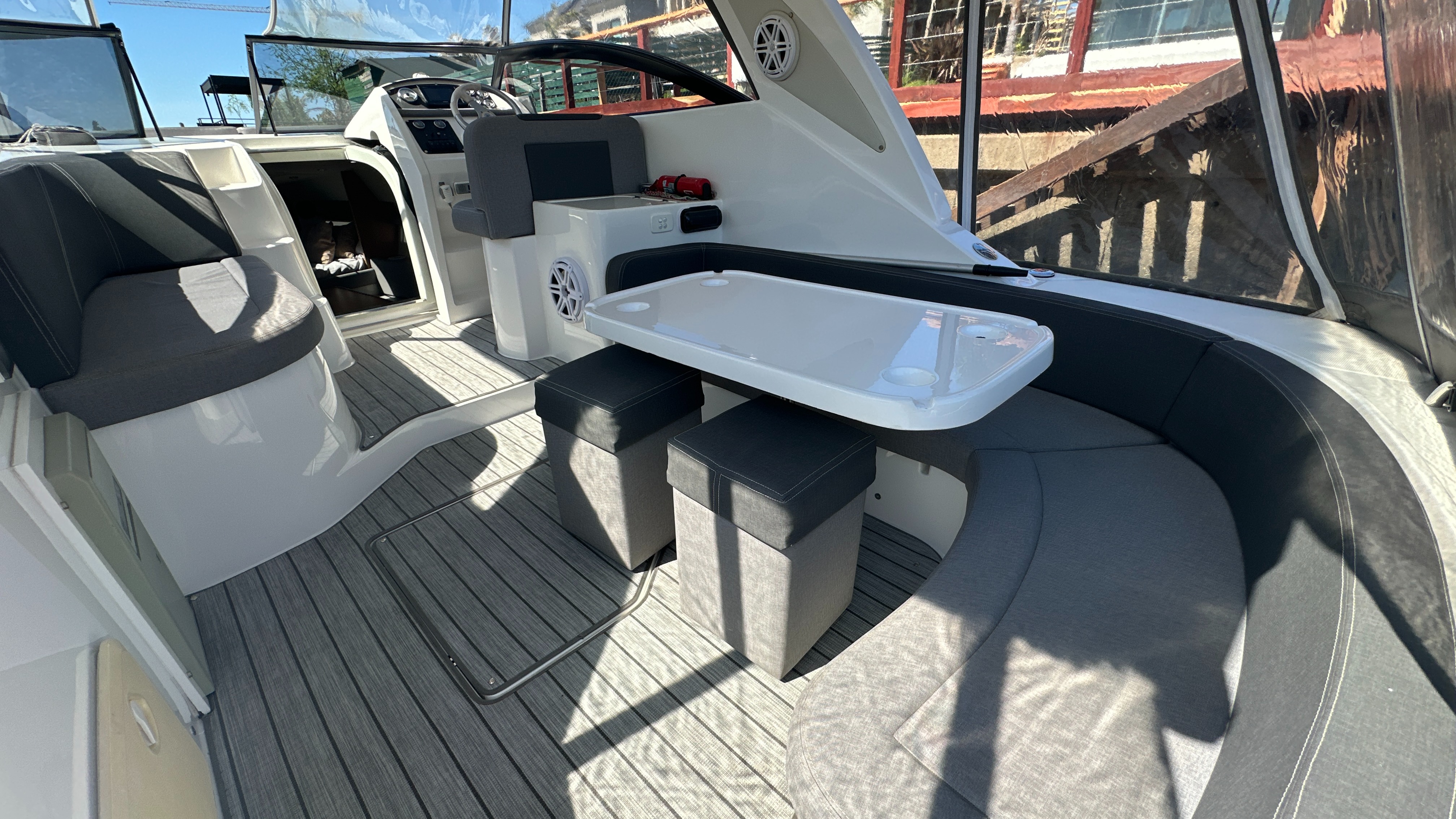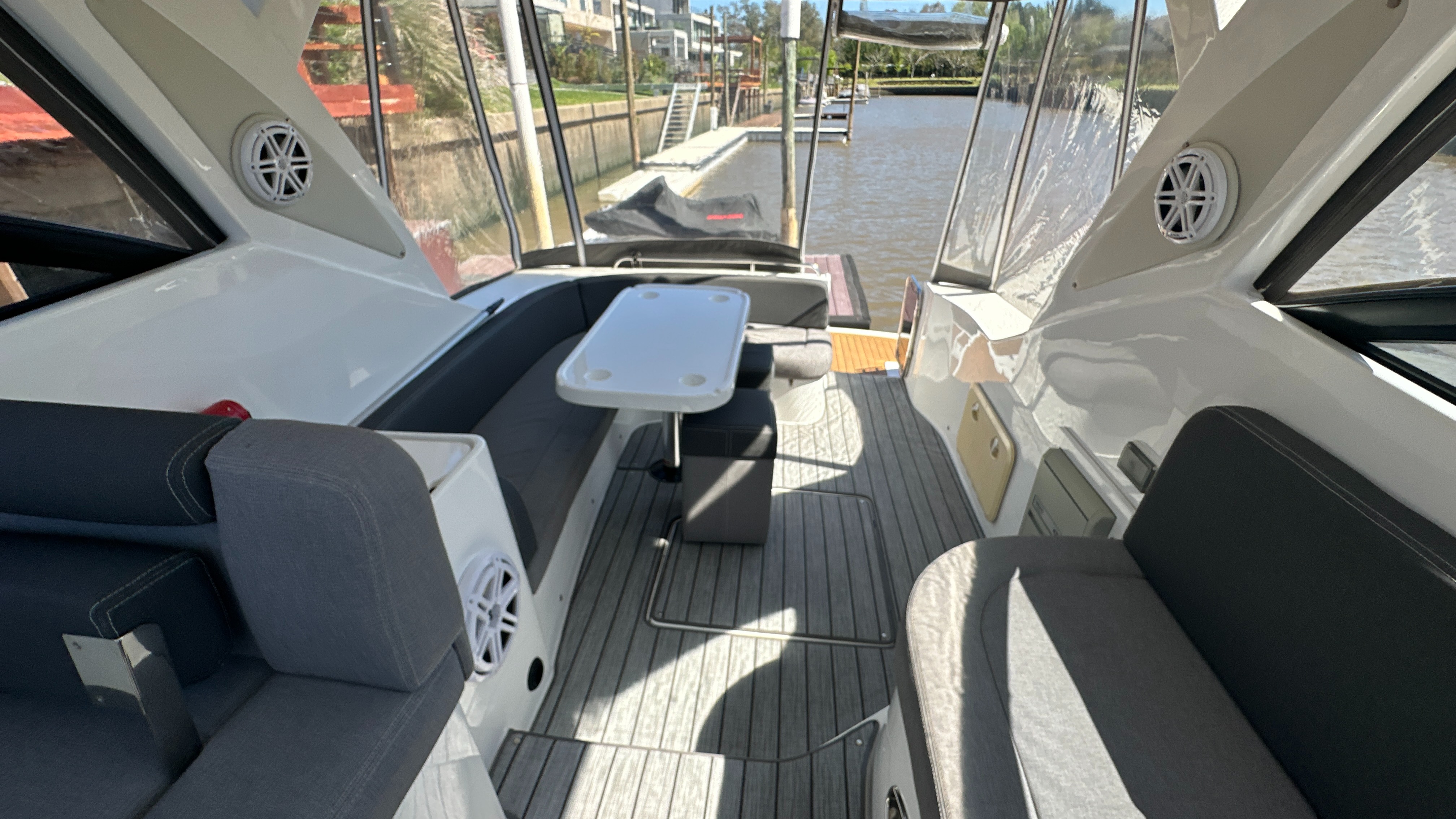Amplio cockpit con comando sobre estribor, asientos hacia popa con mesa central y planchada de popa.