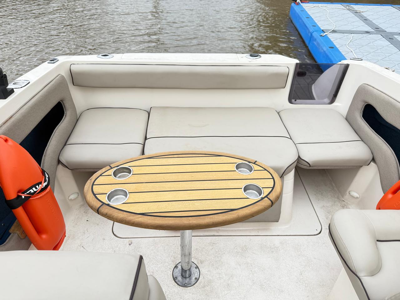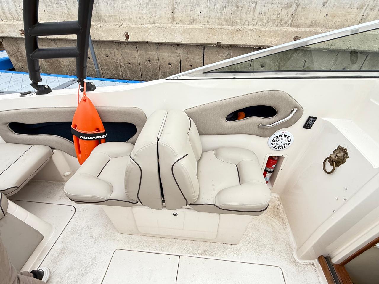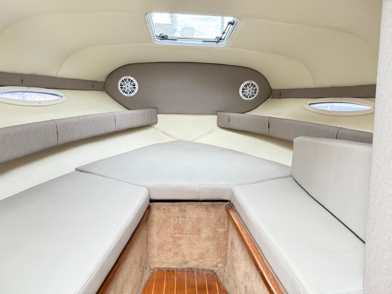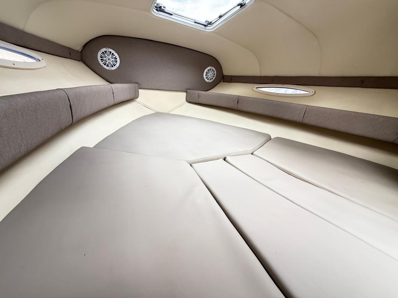 Lancha CUDDY, cucheta doble bajo la cubierta de proa, baño semi compartimentado parabrisas curvo de cristal templado, timonera sobre estribor, asiento butacón para el timonel, asiento entero de popa, guardamancebo y malacate de proa.