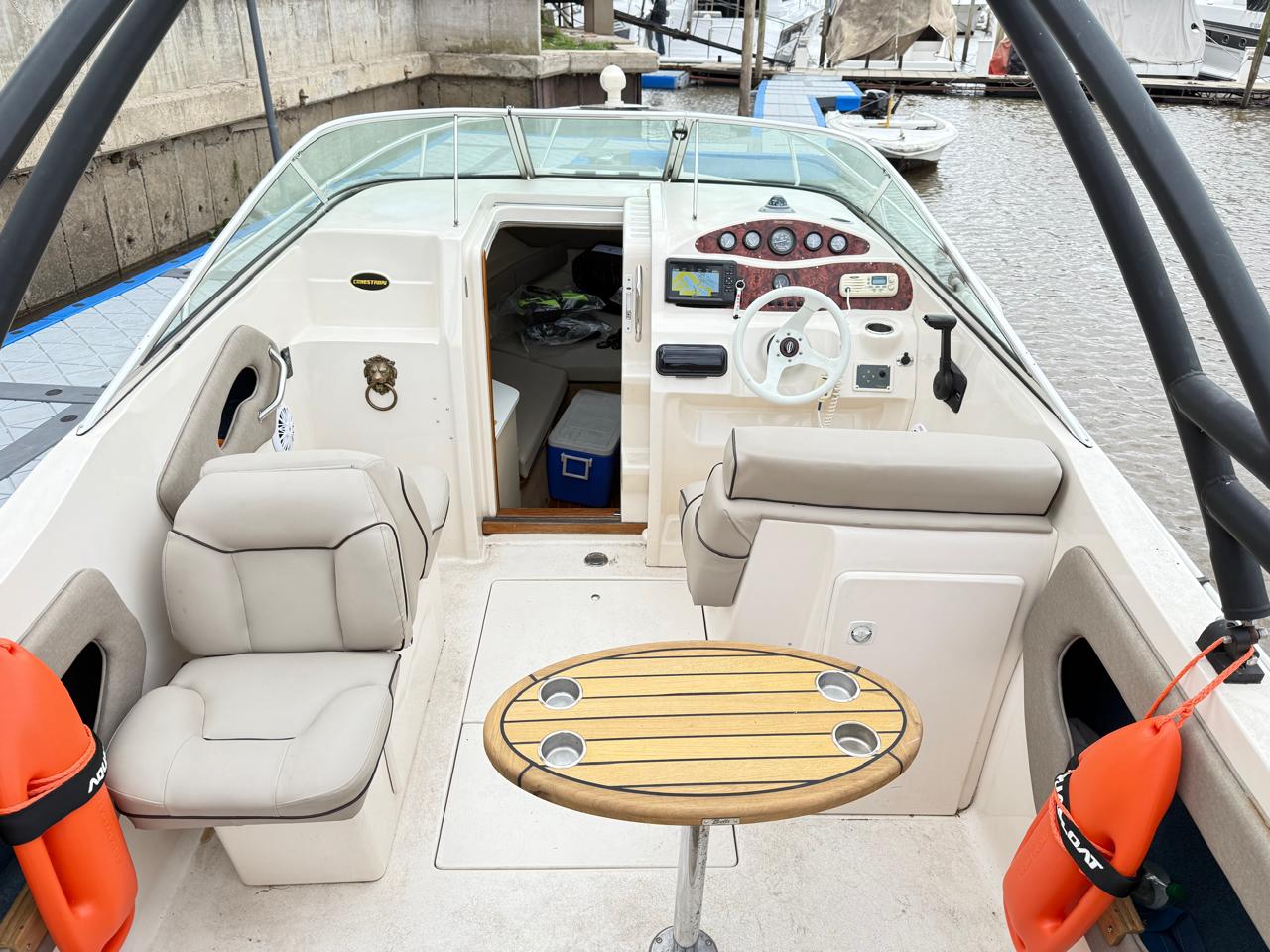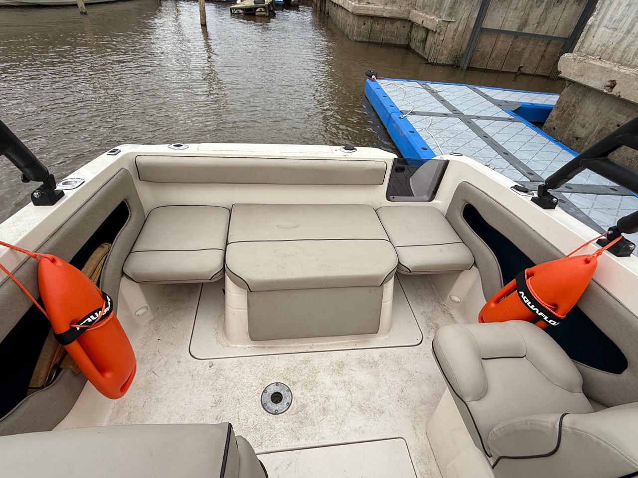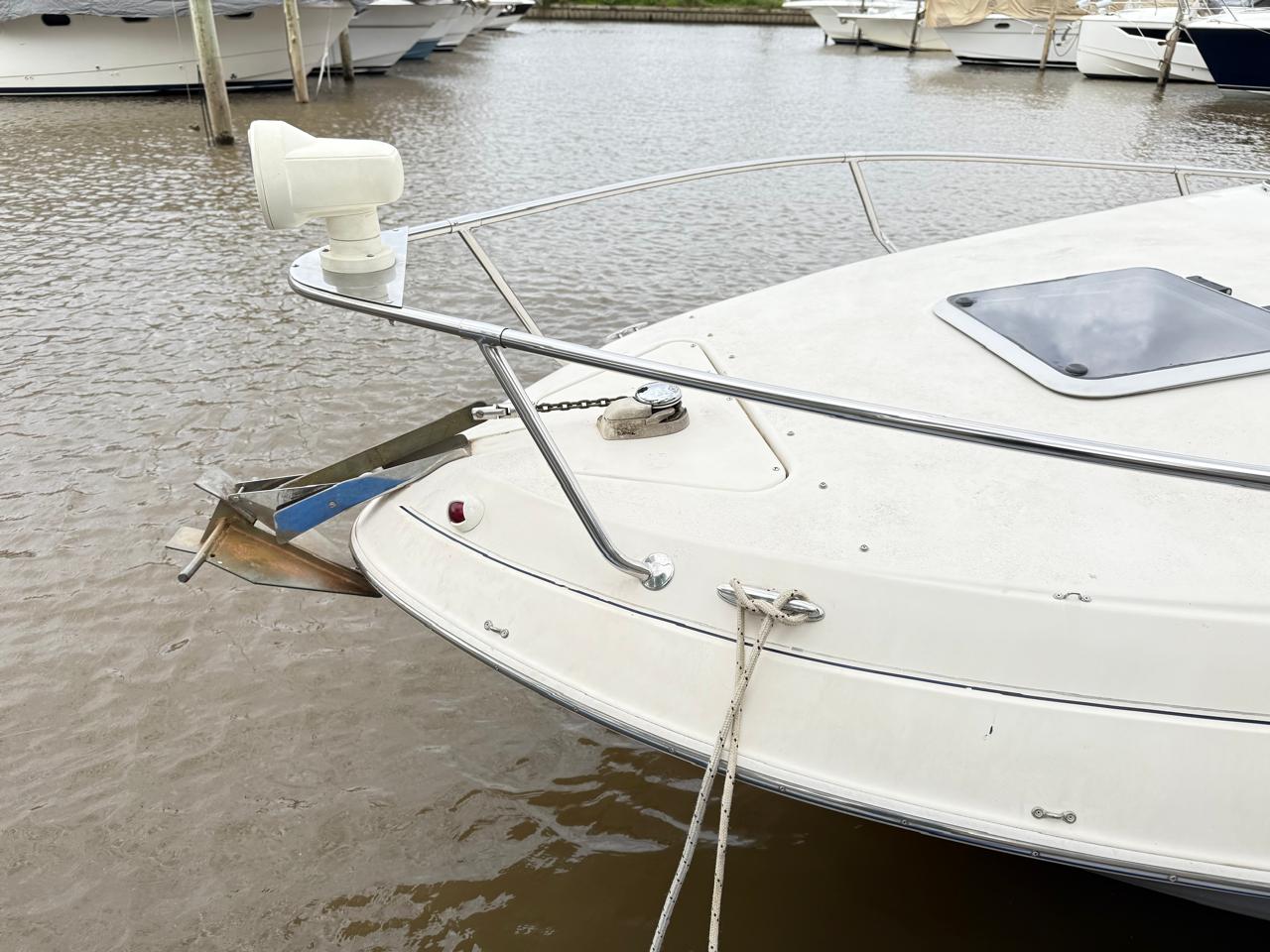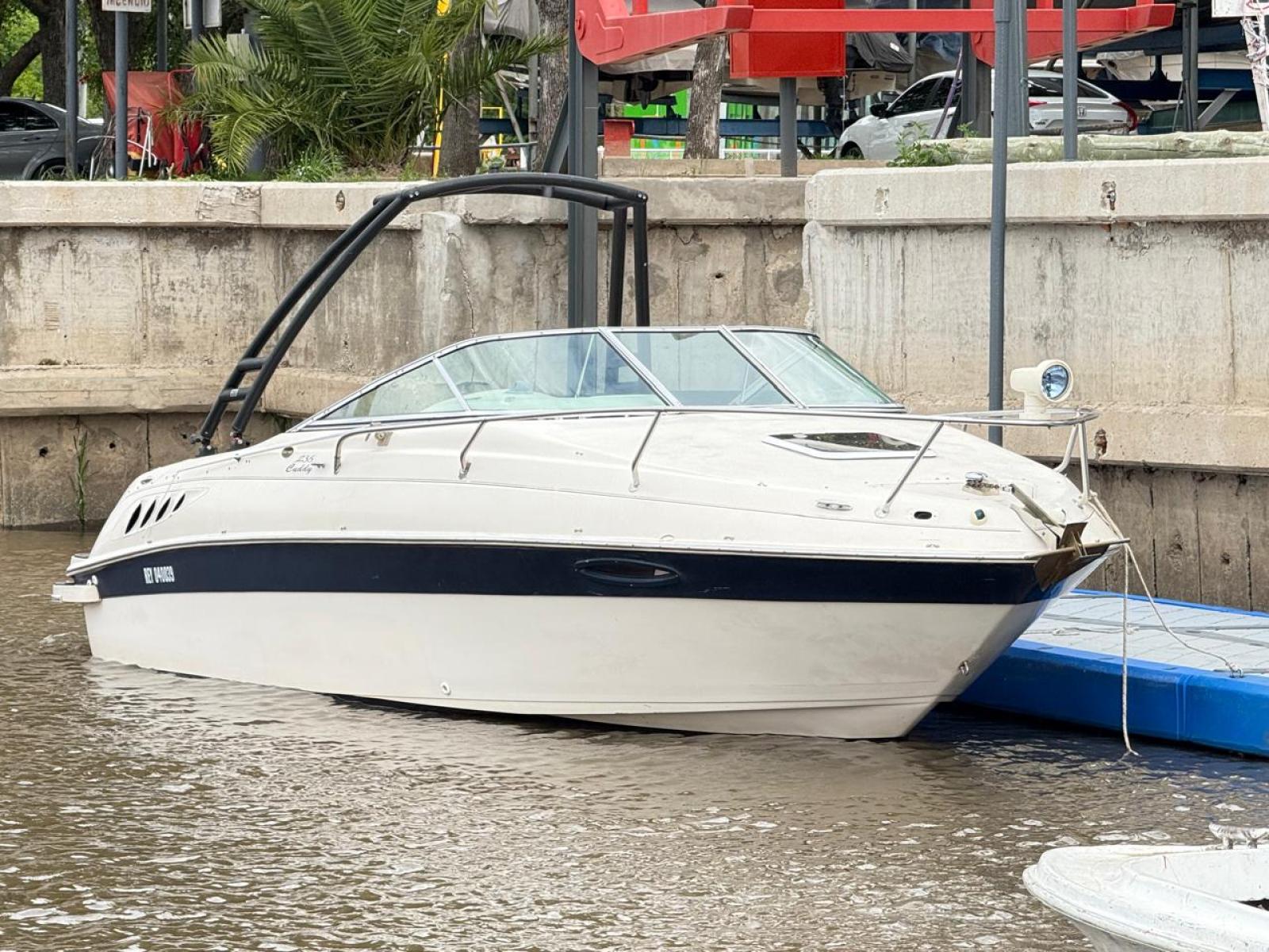 Lancha CUDDY, cucheta doble bajo la cubierta de proa, baño semi compartimentado parabrisas curvo de cristal templado, timonera sobre estribor, asiento butacón para el timonel, asiento entero de popa, guardamancebo y malacate de proa.
