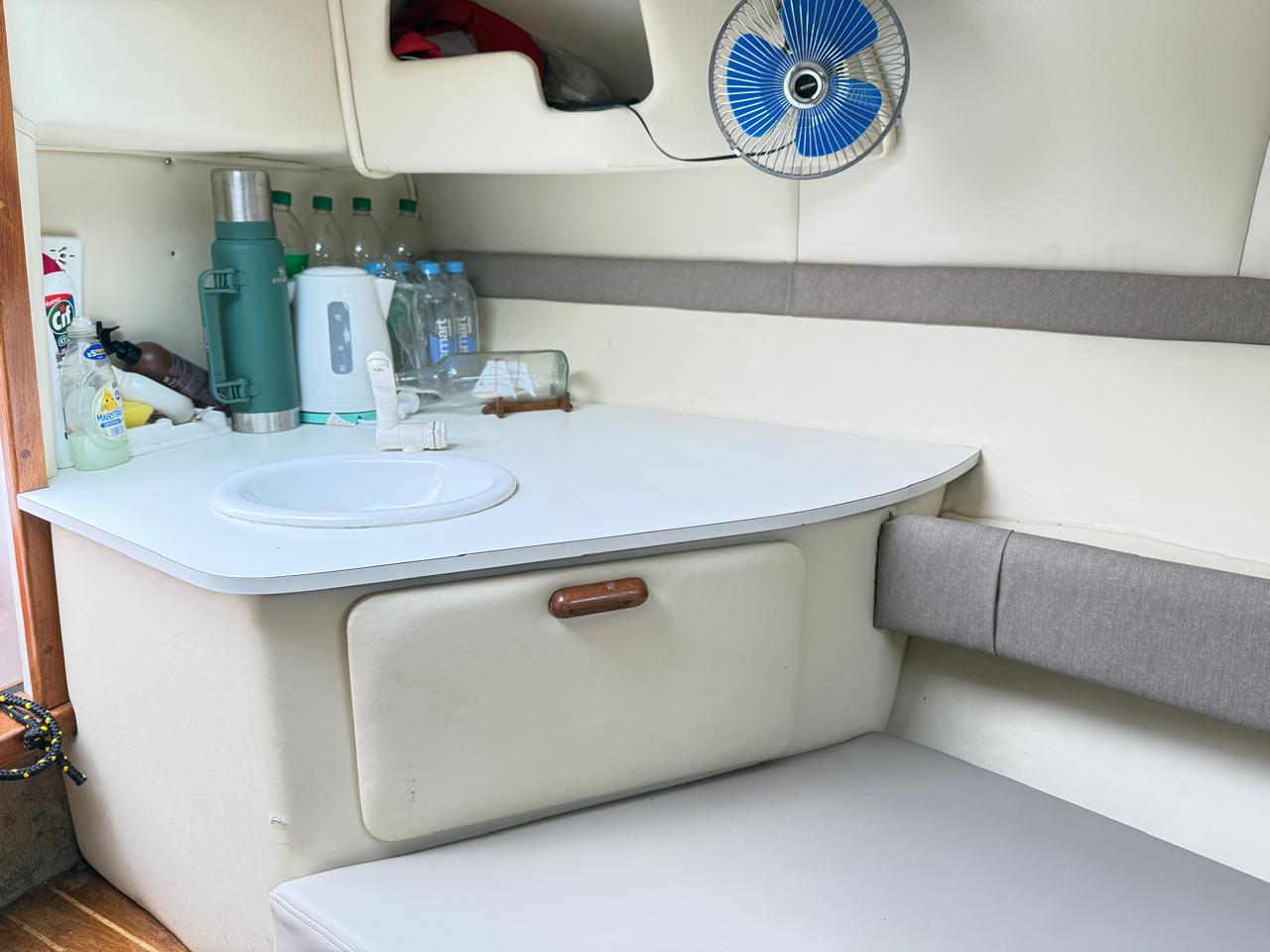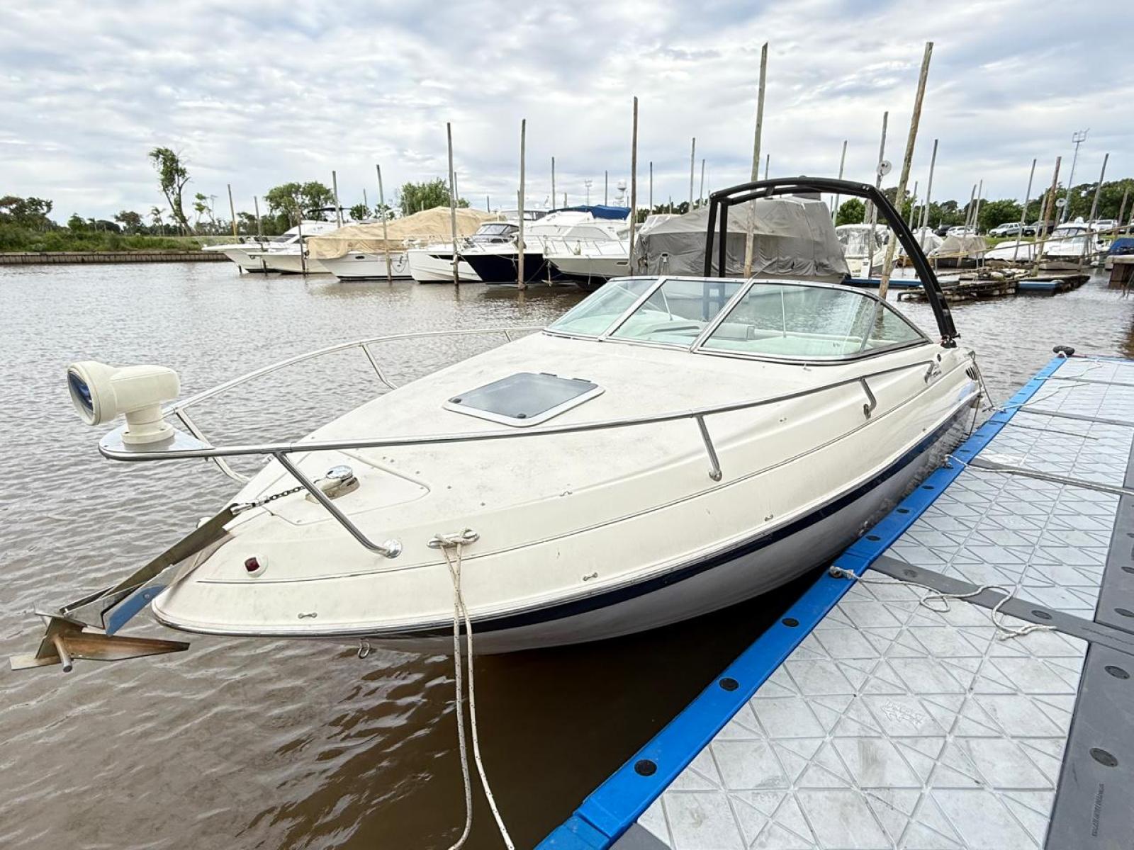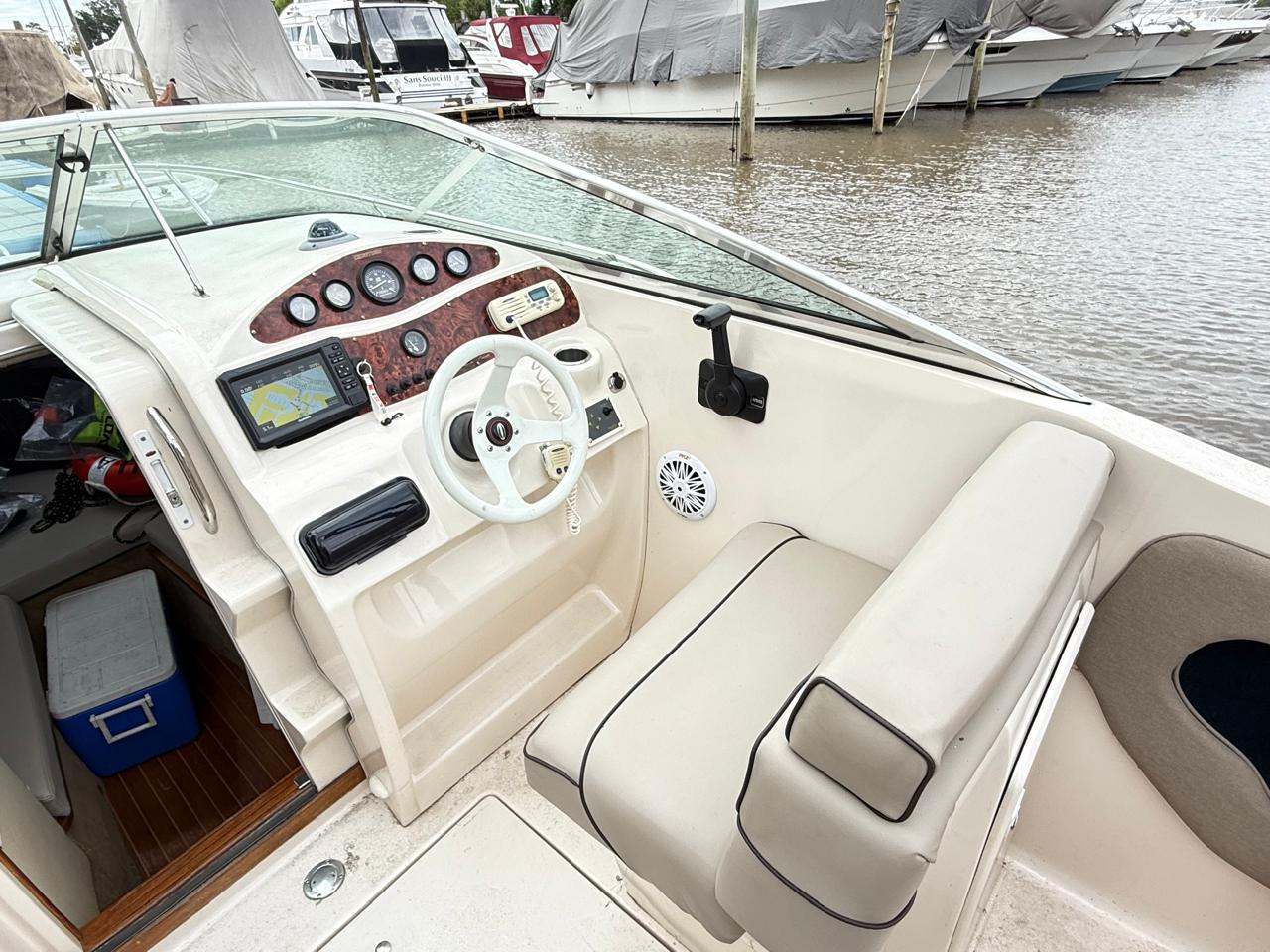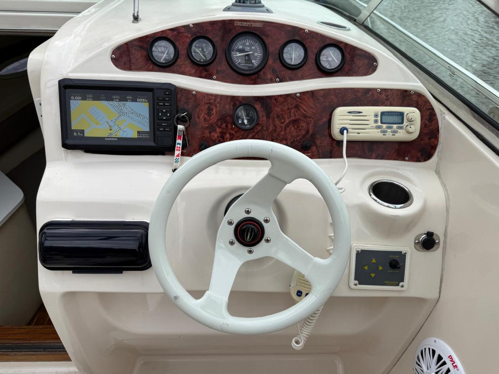 Lancha CUDDY, cucheta doble bajo la cubierta de proa, baño semi compartimentado parabrisas curvo de cristal templado, timonera sobre estribor, asiento butacón para el timonel, asiento entero de popa, guardamancebo y malacate de proa.