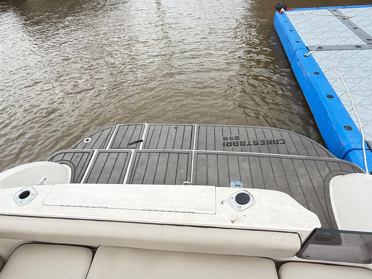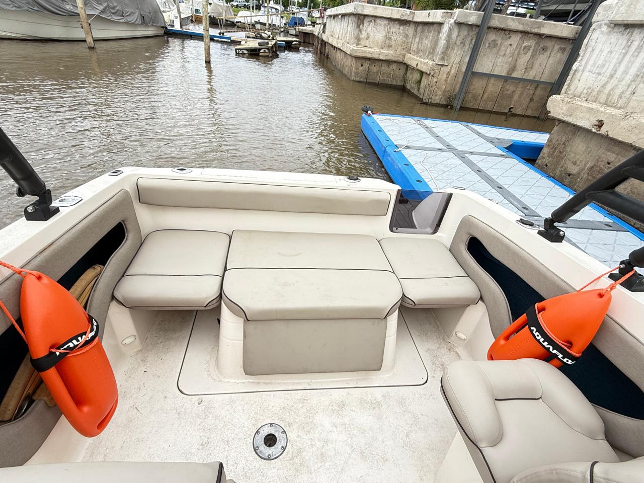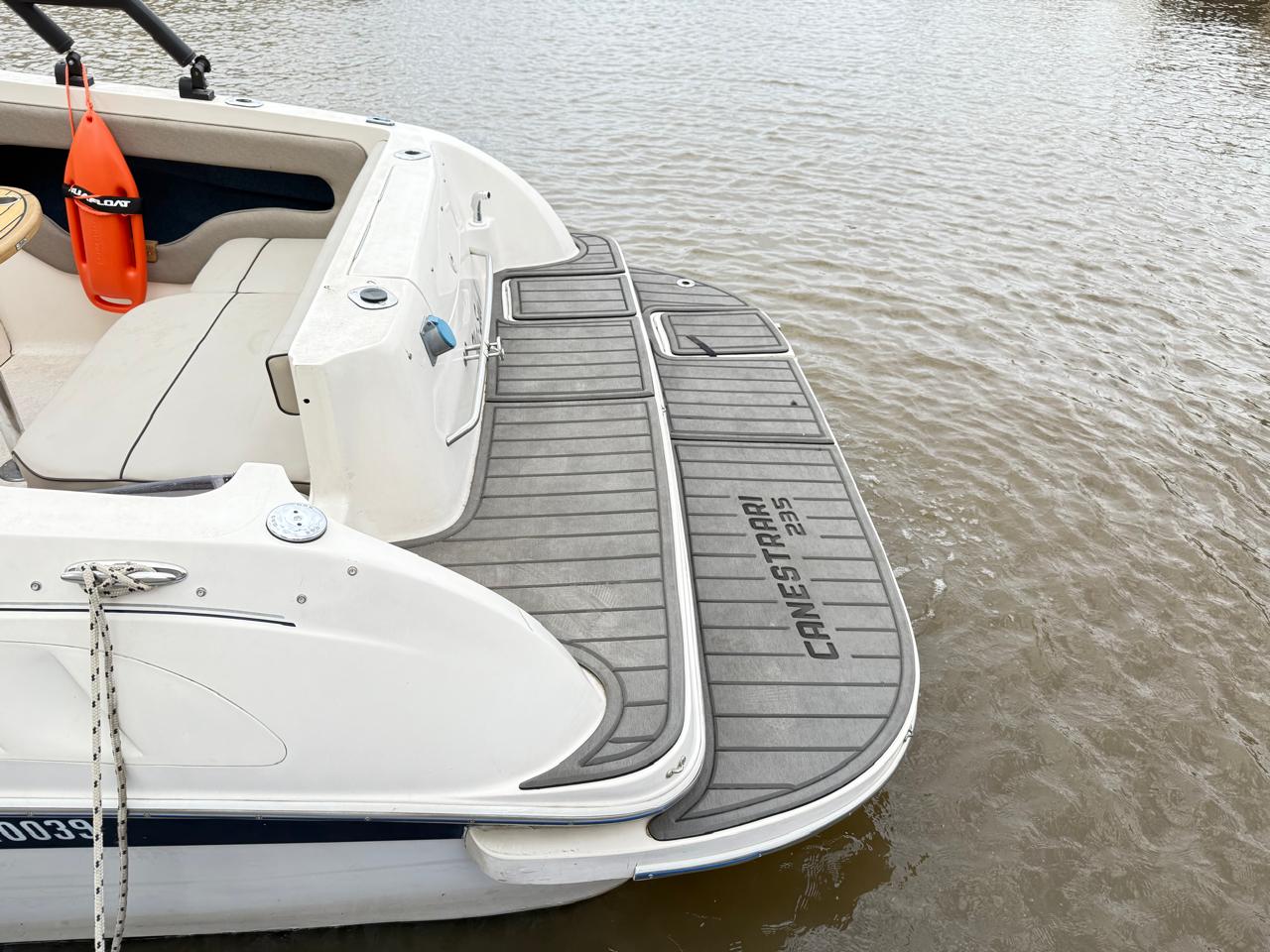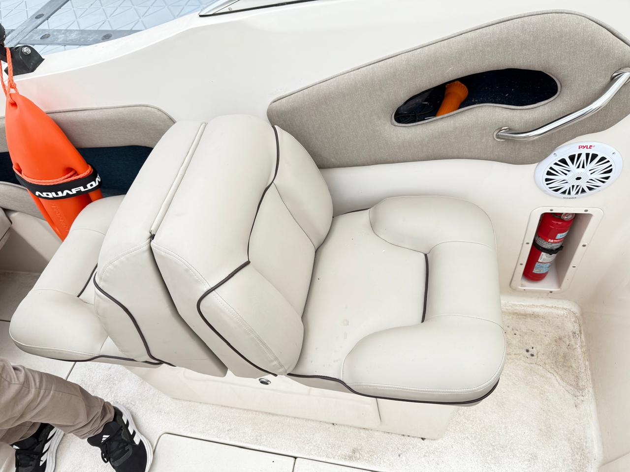 Lancha CUDDY, cucheta doble bajo la cubierta de proa, baño semi compartimentado parabrisas curvo de cristal templado, timonera sobre estribor, asiento butacón para el timonel, asiento entero de popa, guardamancebo y malacate de proa.