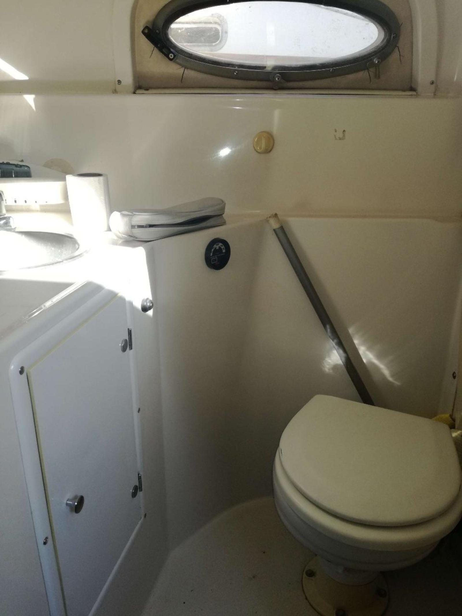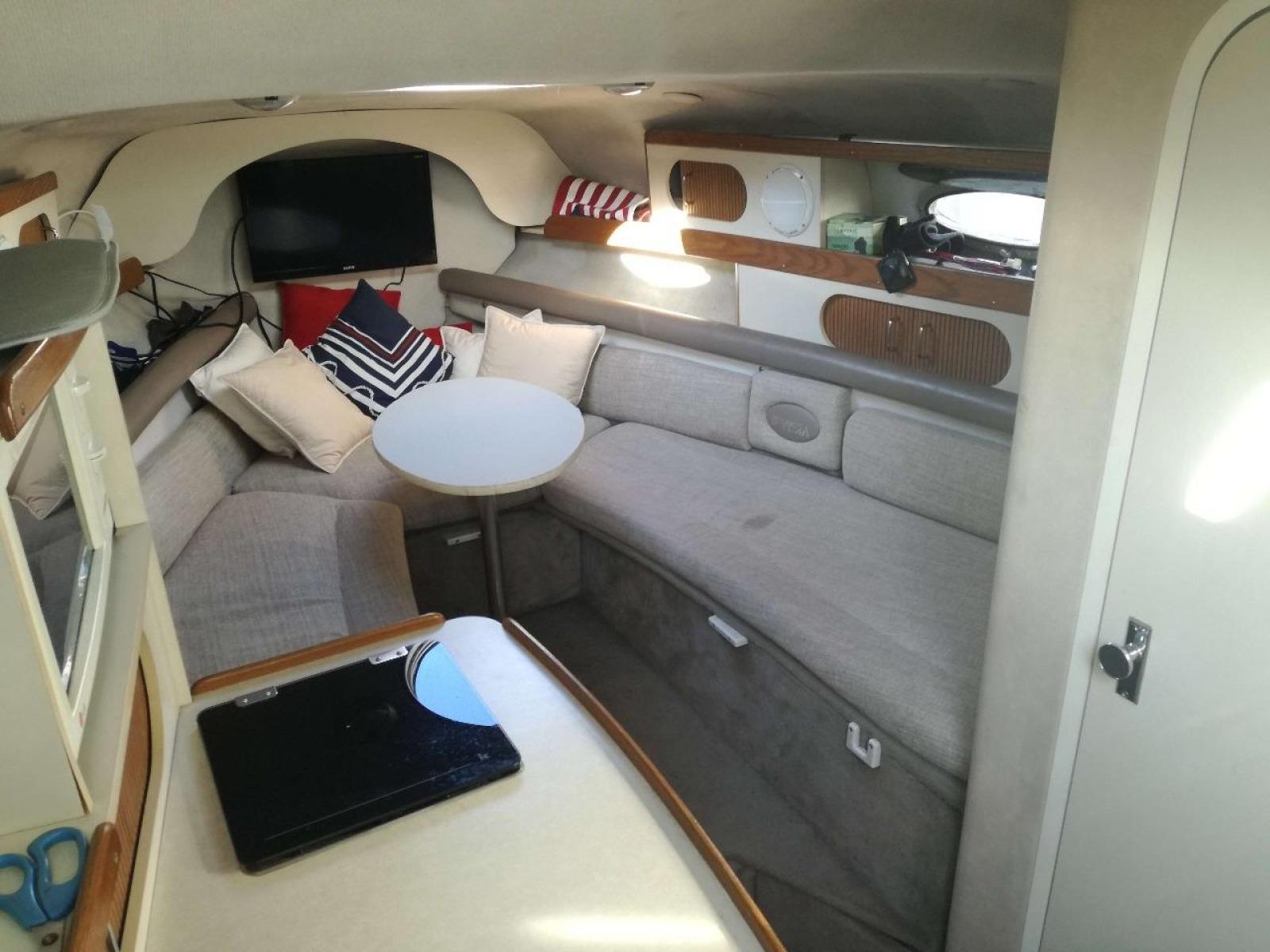 Cama doble a proa de muy buenas dimensiones convertible en Dinette con mesa. Baño completo con circuito de agua
