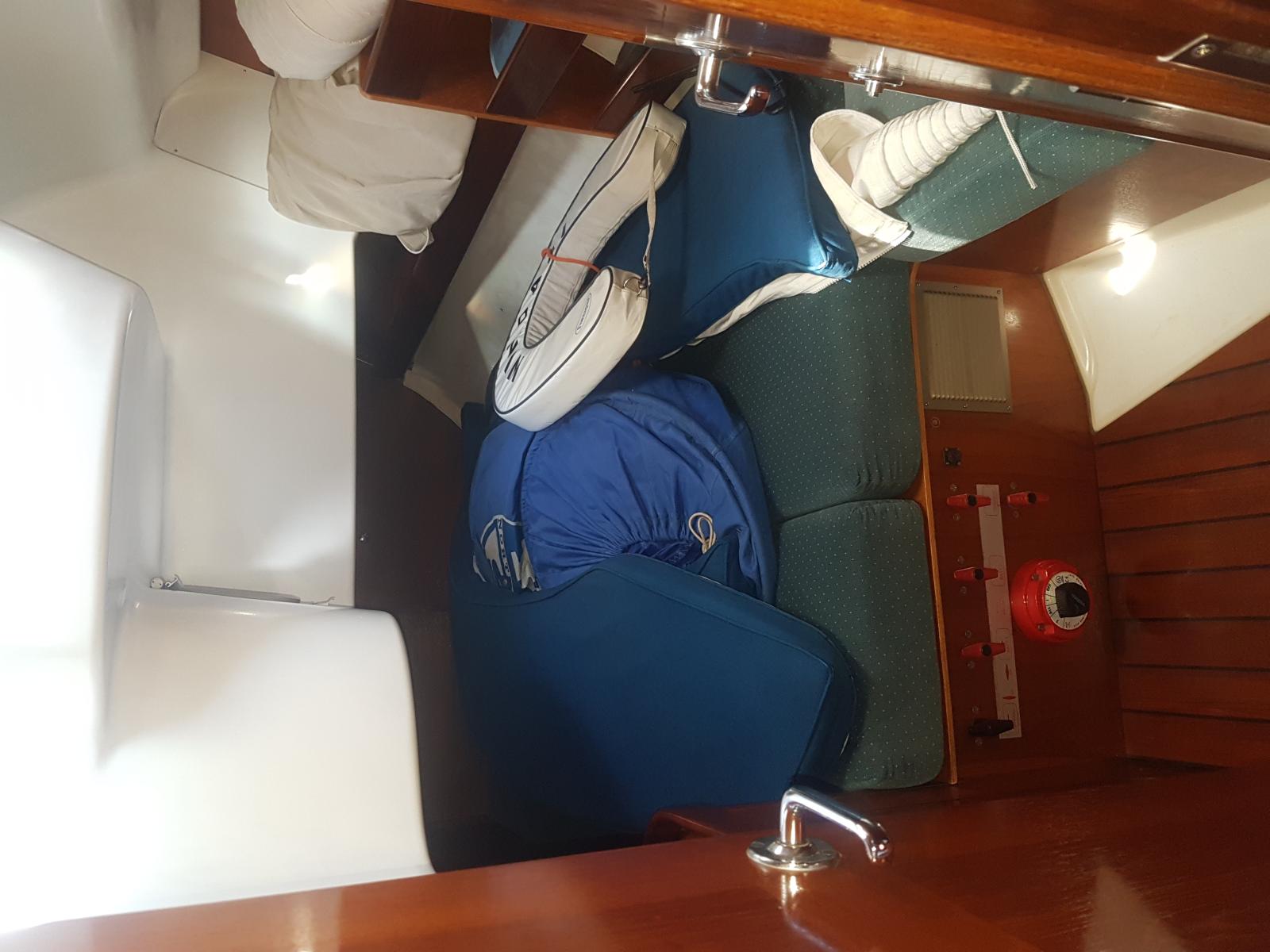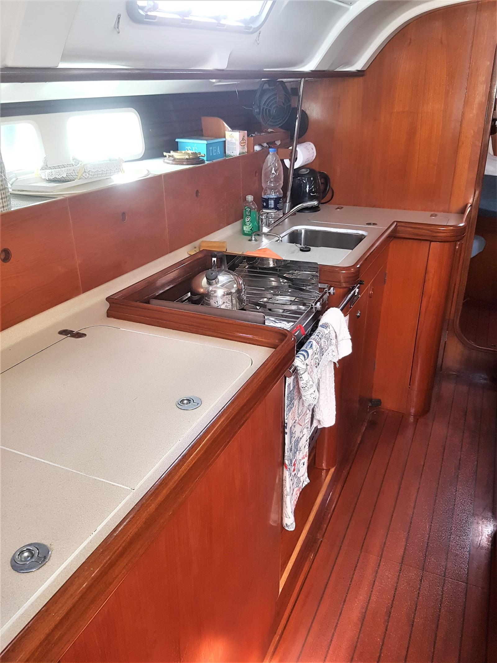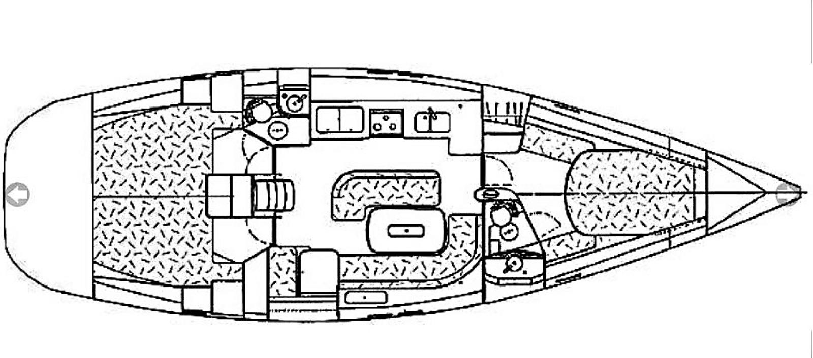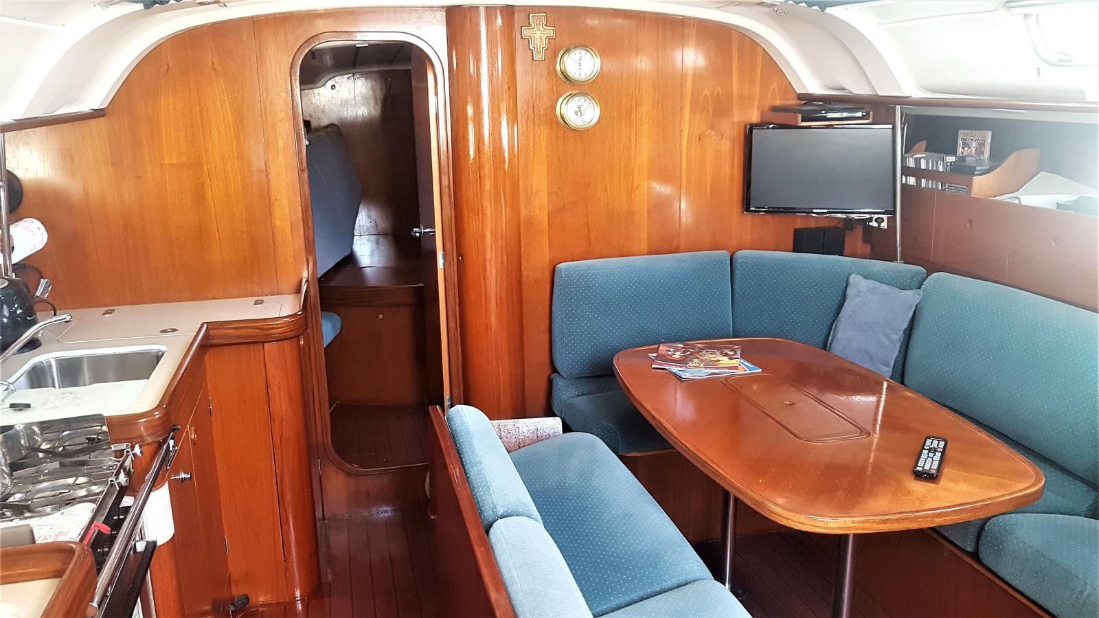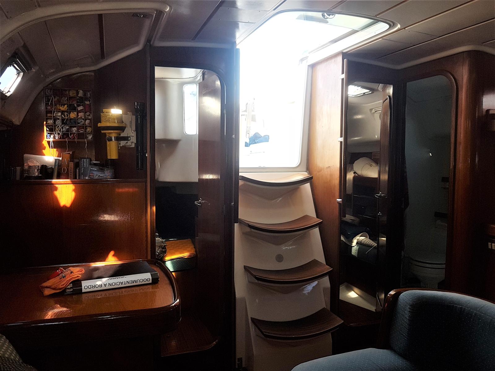 Camarote a proa con baño, dos camarotes a popa con un baño, amplia dinet en salón con mesada con pileta y cocina enfrentada, mesa de navegación. Amplio cockpit con mesa integrada y plataforma de baño.