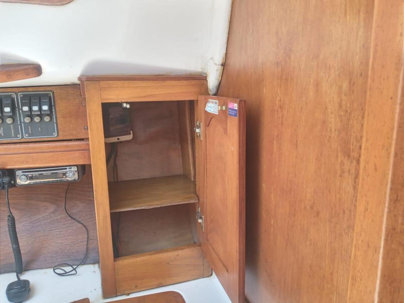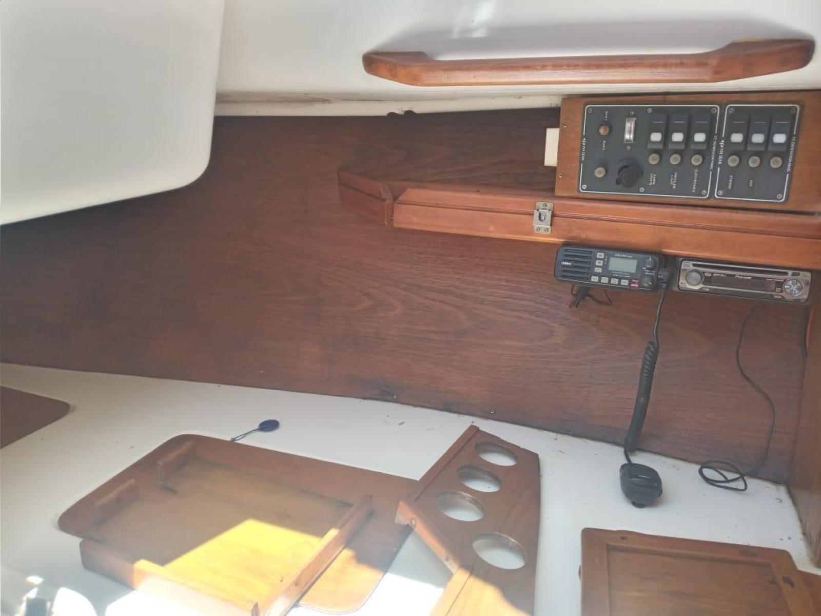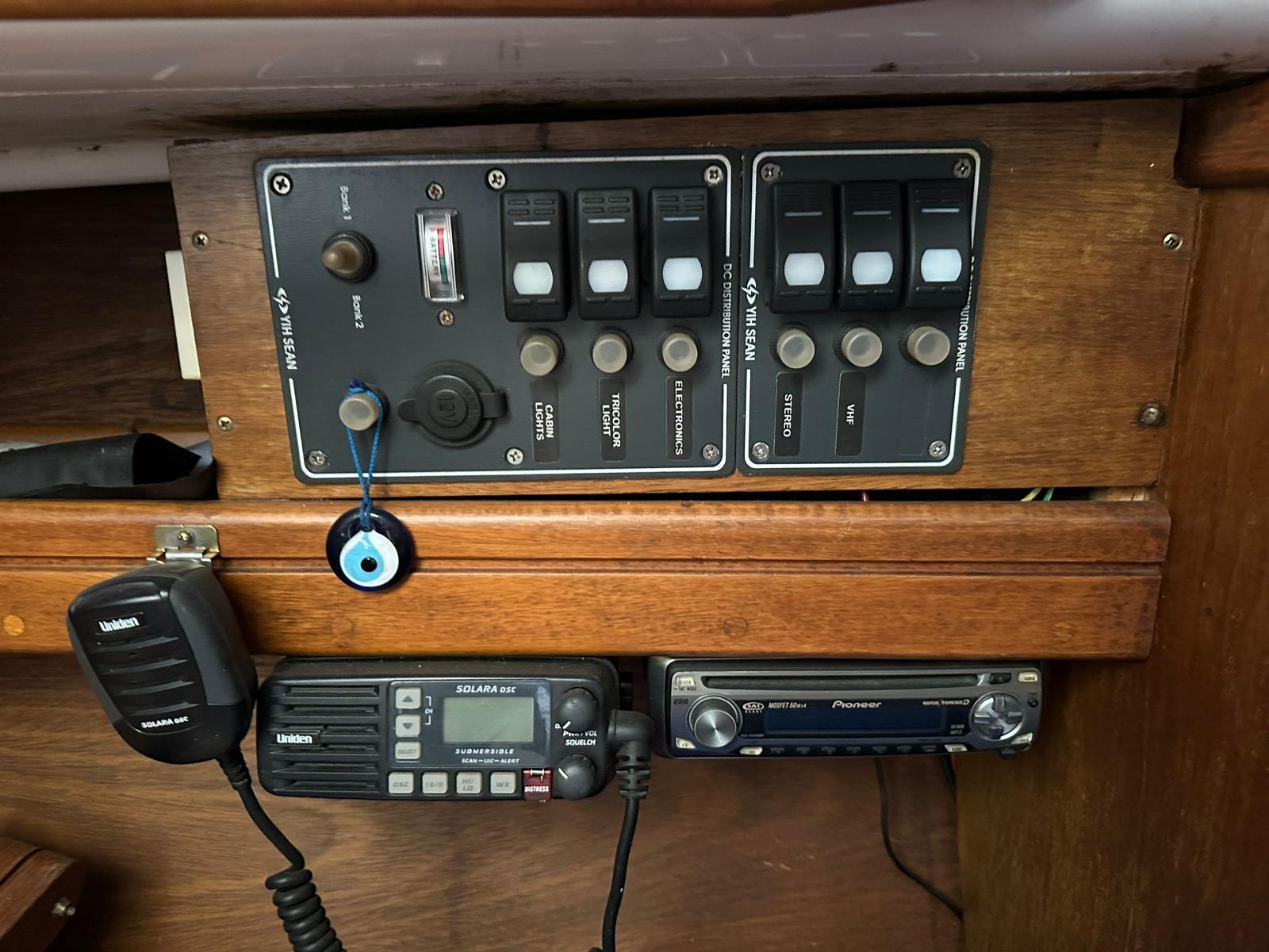 Tablero eléctrico con indicador de estado de las dos baterías que se alojan en proa. Llaves para luces con fusibles. Cargador de baterías 220vac a 12vcc. En cubierta tiene una sonda Northstar Explorer M310 con corredera de rueda en el fondo y Viento Navman wind 3150s. Compás Plastimo Conquest.
