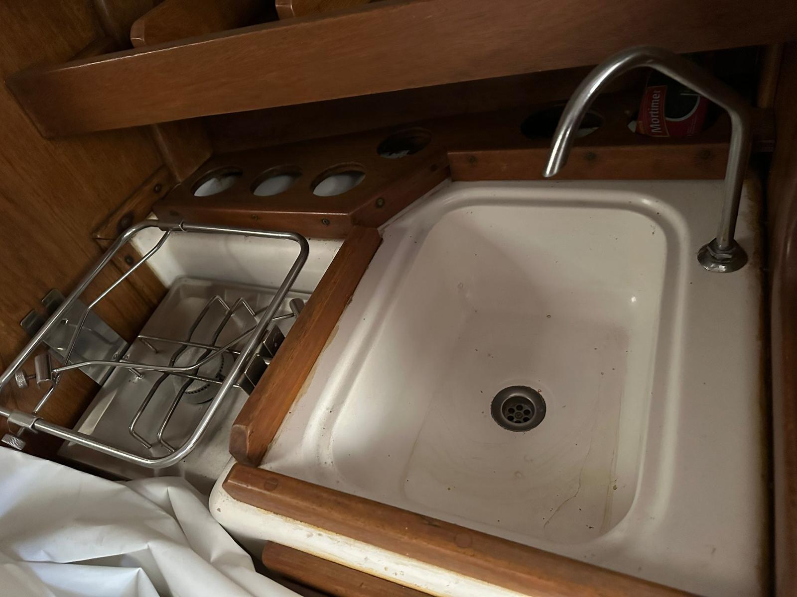 La cabina es muy cómoda, tiene una cocina cardánica de dos fuegos y garrafa en popa. Pileta contigua con bomba de pie. Baño independiente con puerta y con inodoro con bomba manual.