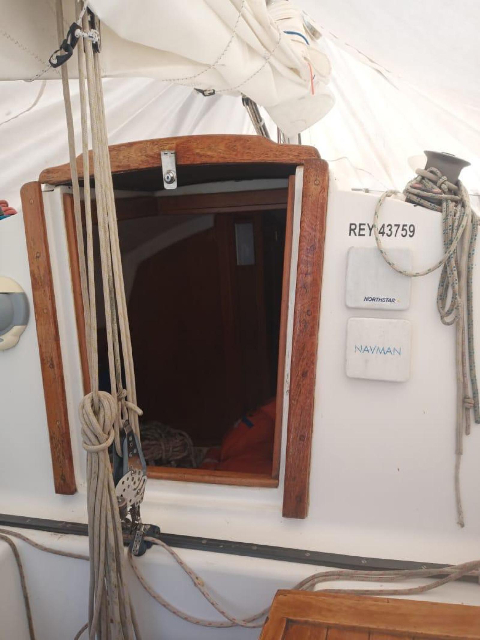 La cubierta dispone de andariveles amplios. Guarda mancebos de inoxidable, púlpito. En proa tiene un tambucho que cae sobre la cama doble. En popa el espejo es abierto parcialmente con tiene dos salidas de agua grandes. Timón de pala fijado sobre el espejo con herrajes de inoxidable muy firmes. la caña de madera natural y extensor.