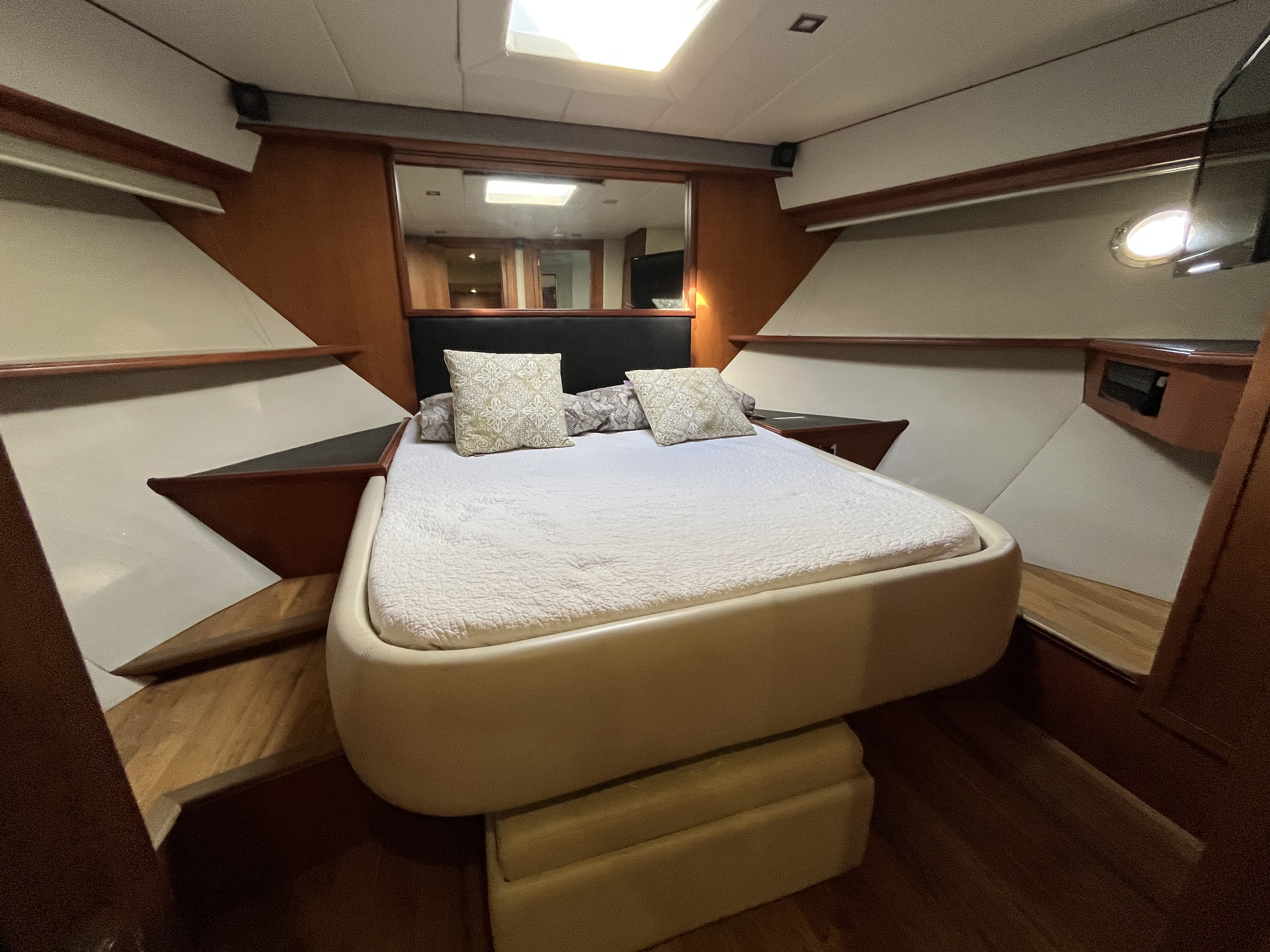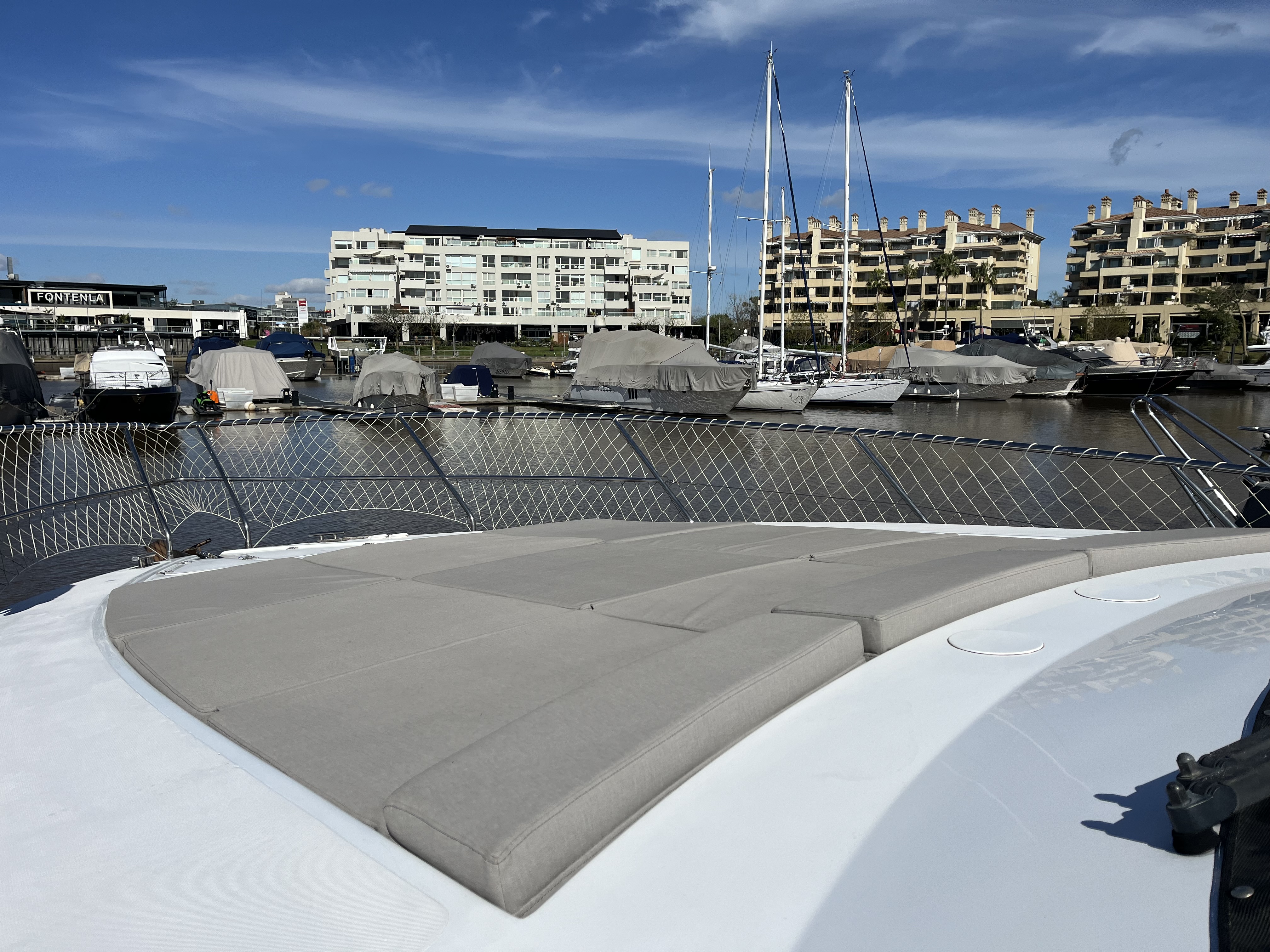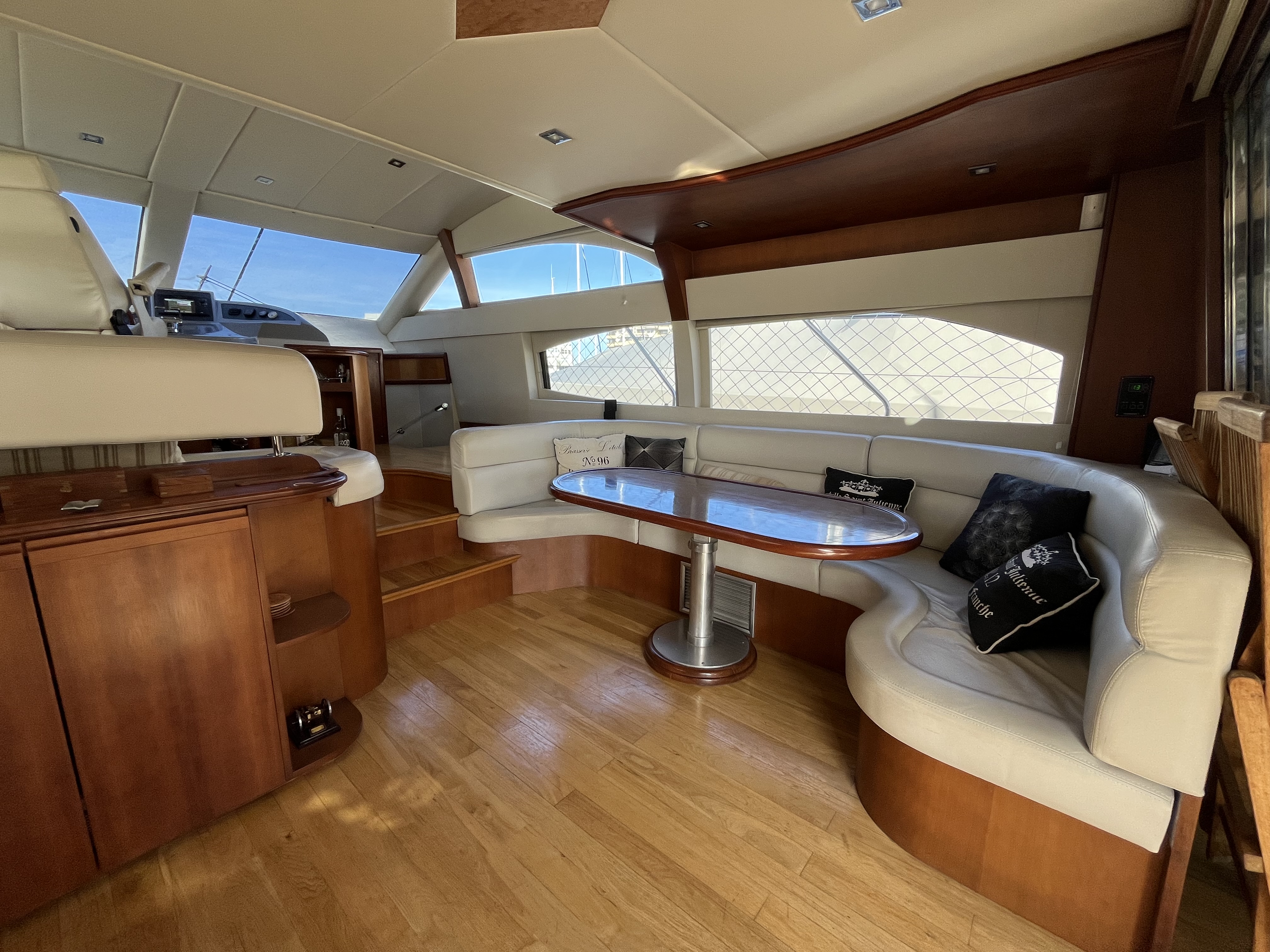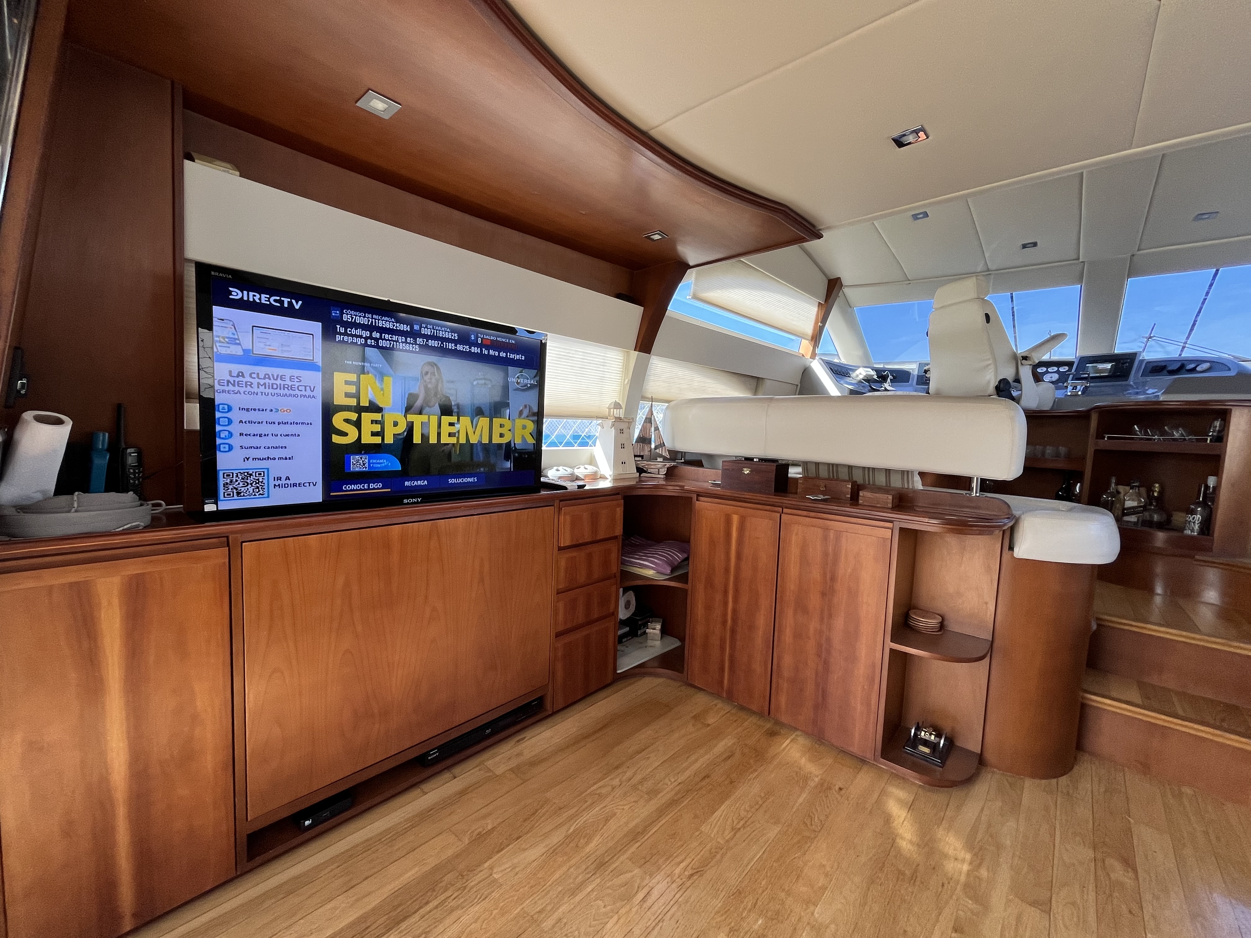 En nivel inferior cocina completa y acceso a camarotes. Camarote doble en proa y camarote principal en popa, cada uno con baño en suite + 3er camarote + baño + camarote marinero con baño, ducha aire y calefacción. Flybridge con área de asientos, solarium.