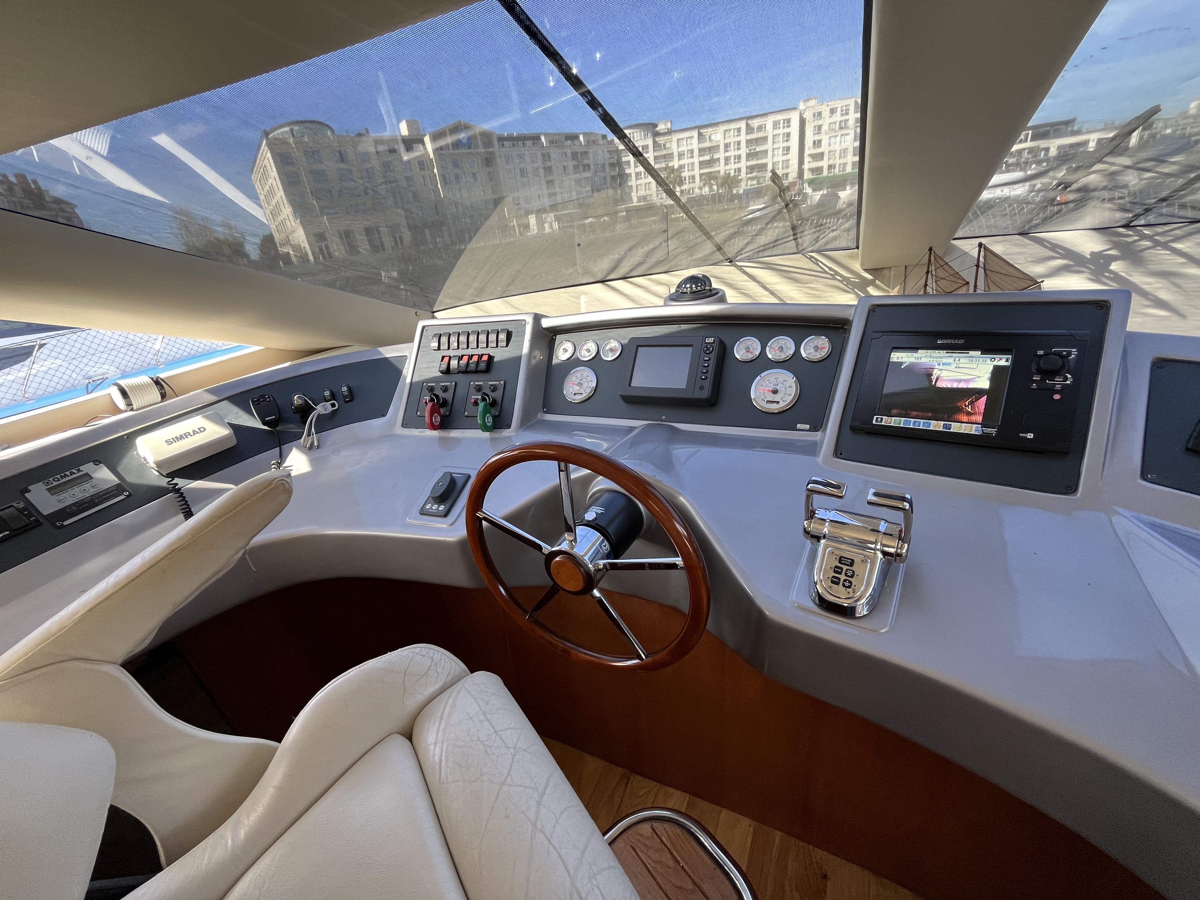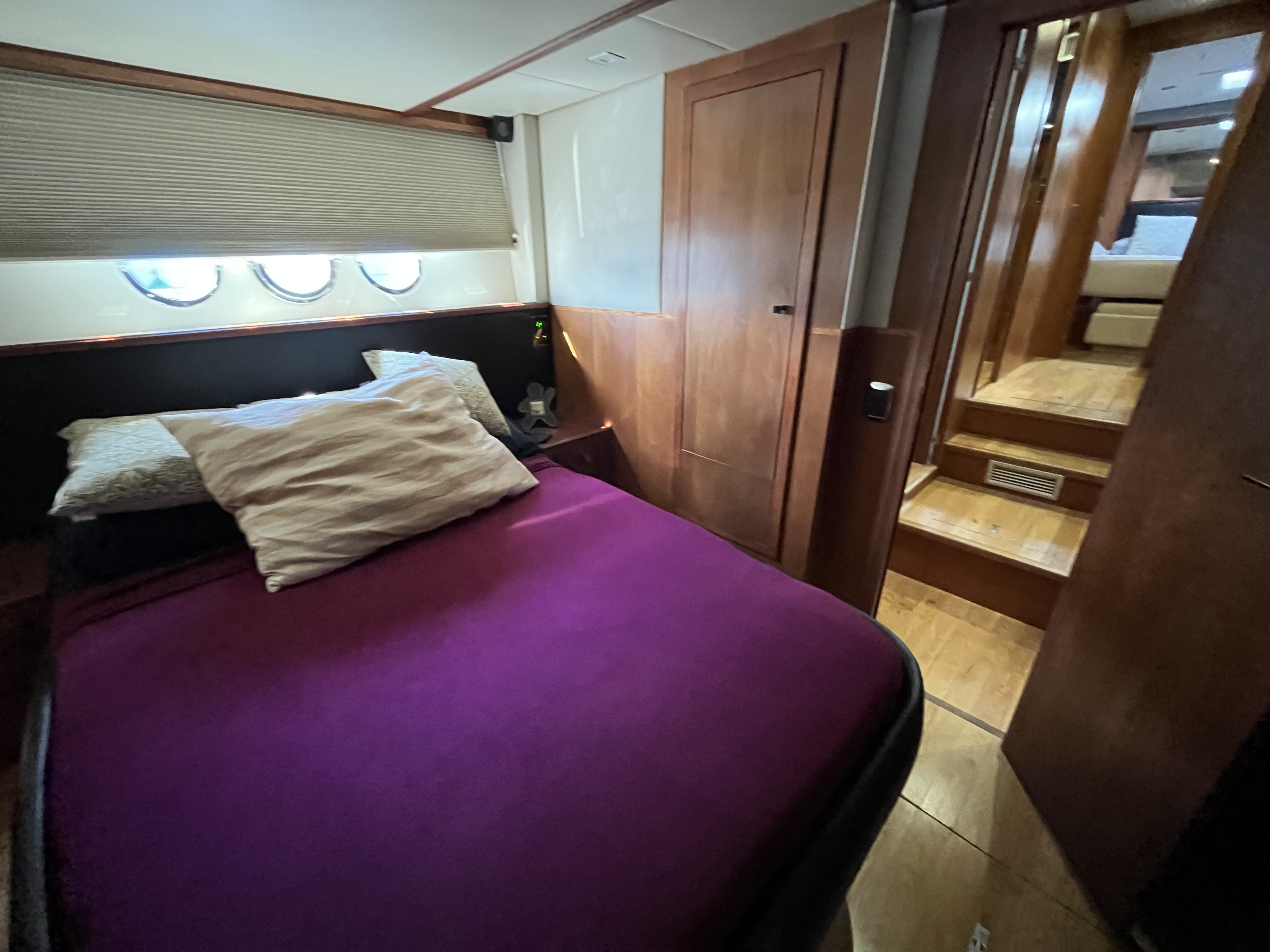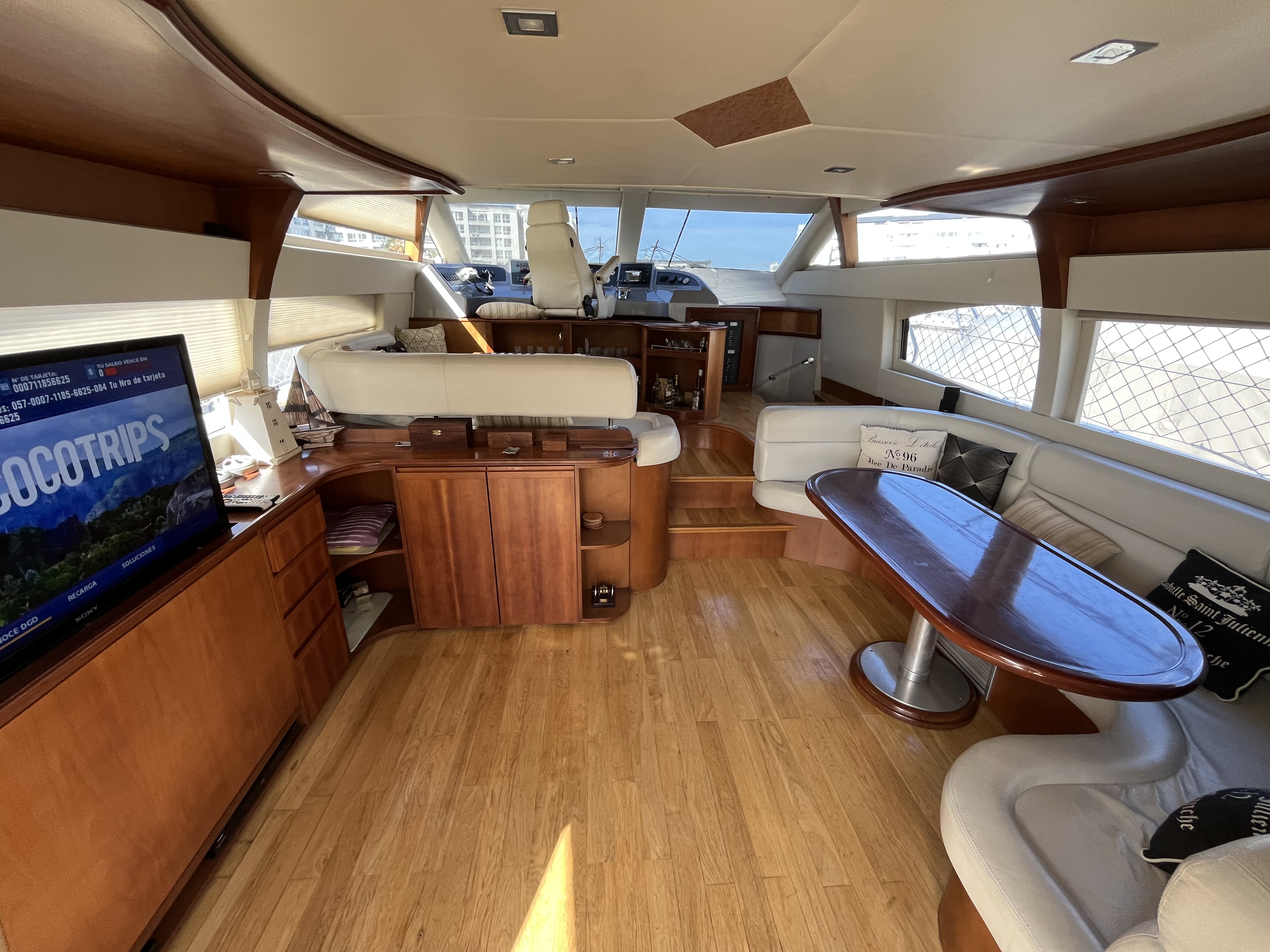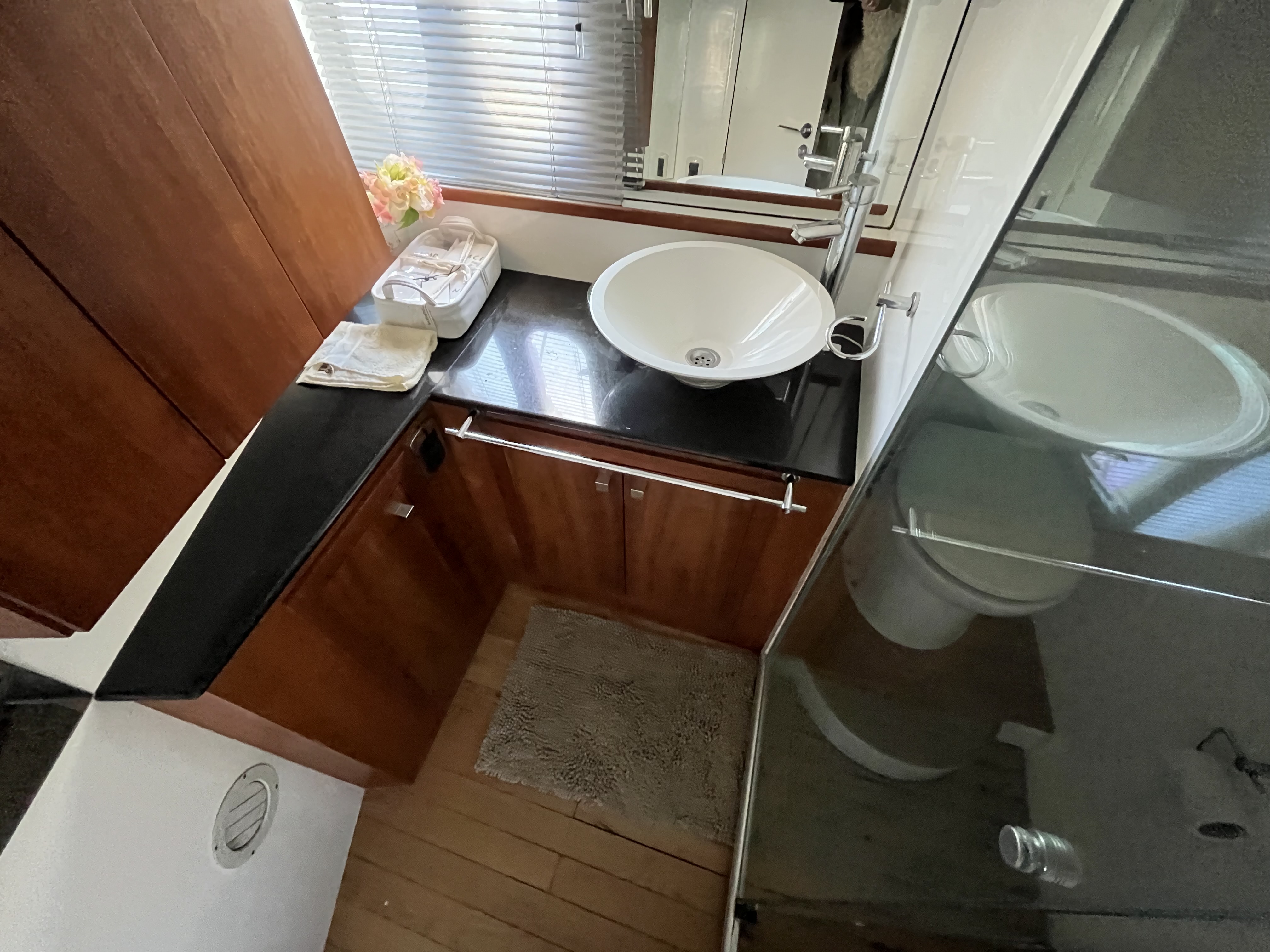 En nivel inferior cocina completa y acceso a camarotes. Camarote doble en proa y camarote principal en popa, cada uno con baño en suite + 3er camarote + baño + camarote marinero con baño, ducha aire y calefacción. Flybridge con área de asientos, solarium.