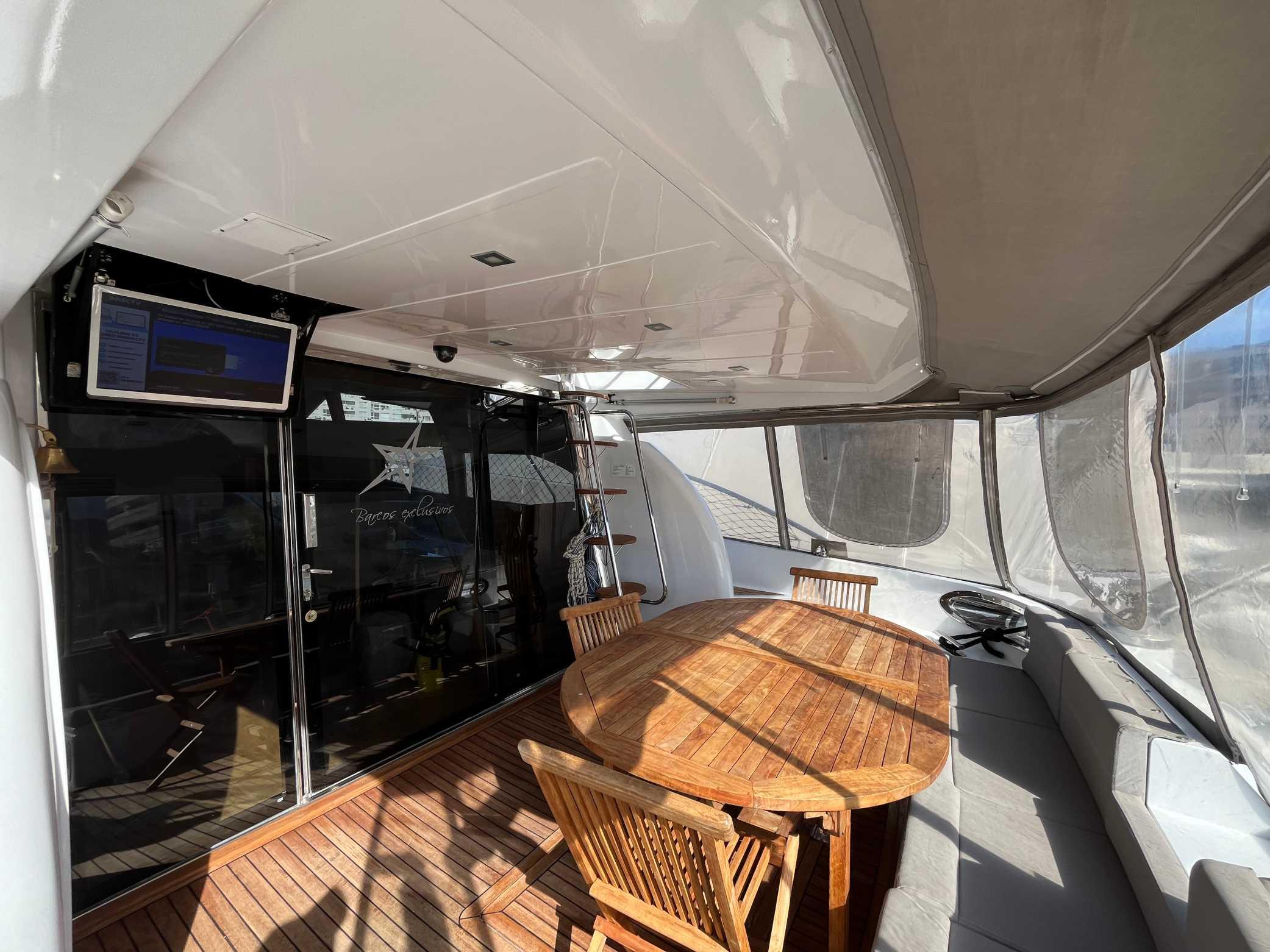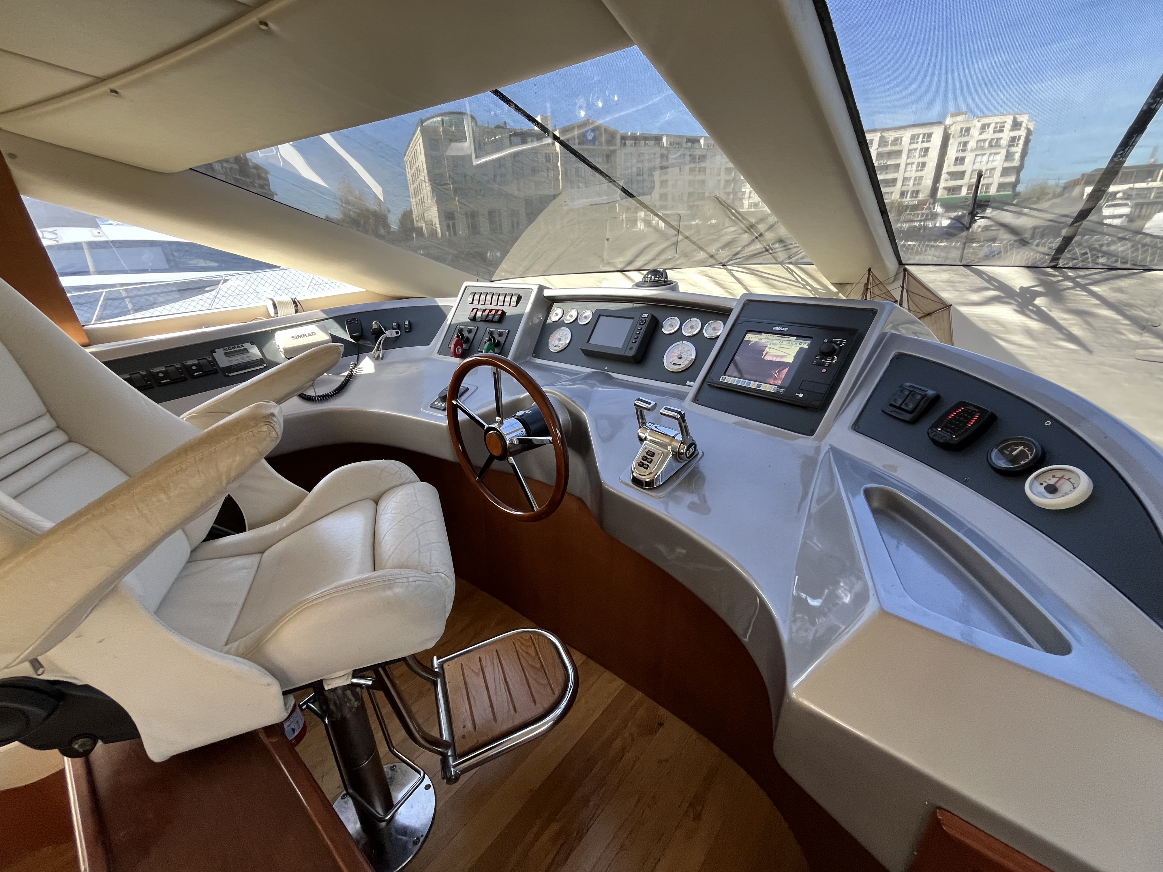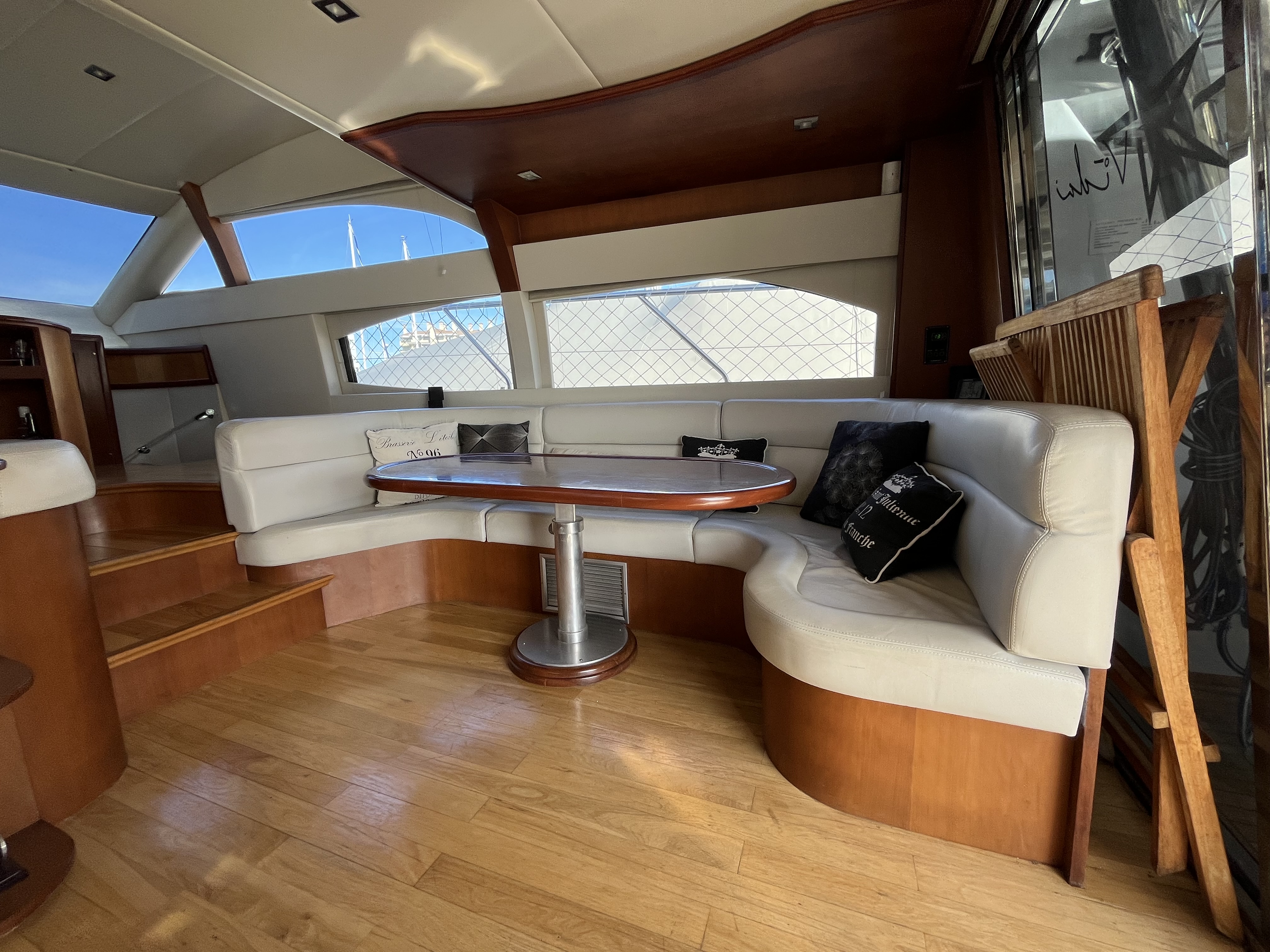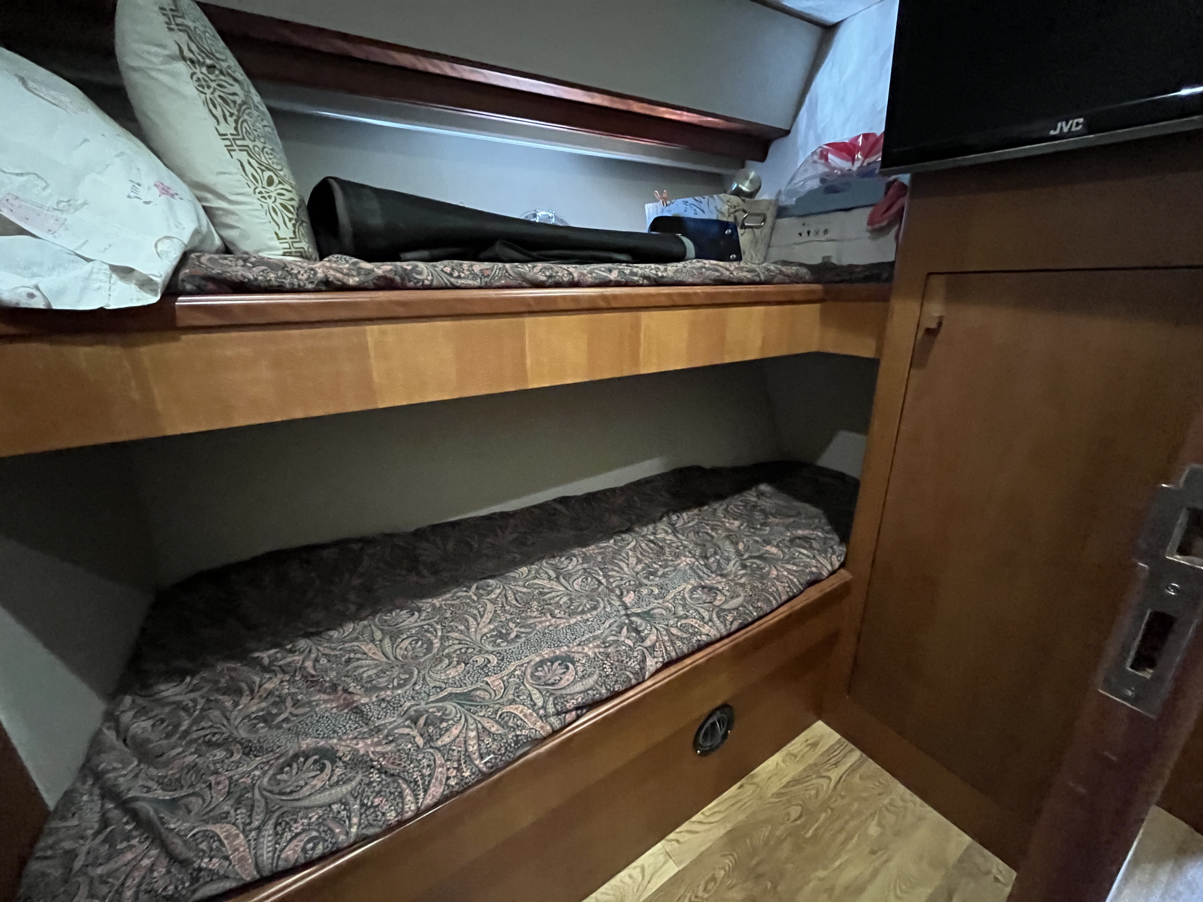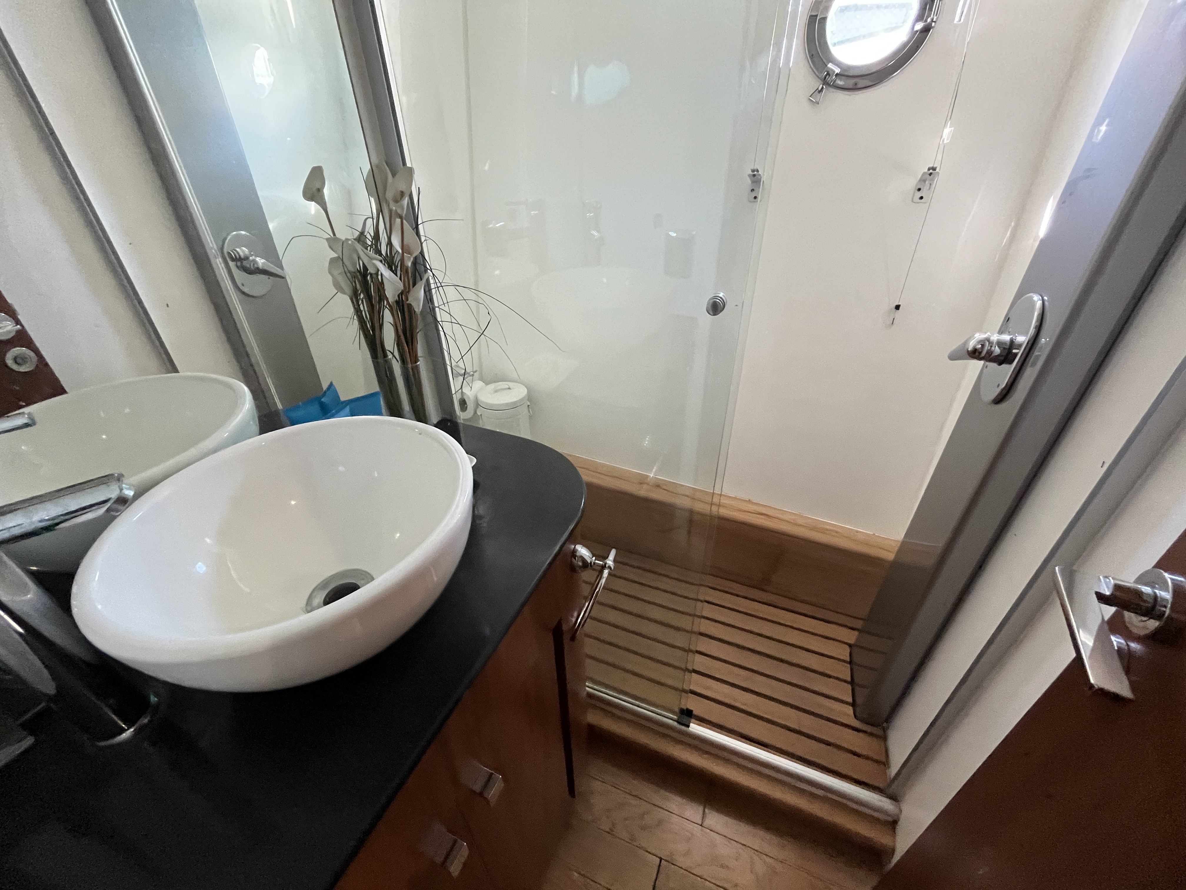 En nivel inferior cocina completa y acceso a camarotes. Camarote doble en proa y camarote principal en popa, cada uno con baño en suite + 3er camarote + baño + camarote marinero con baño, ducha aire y calefacción. Flybridge con área de asientos, solarium.
