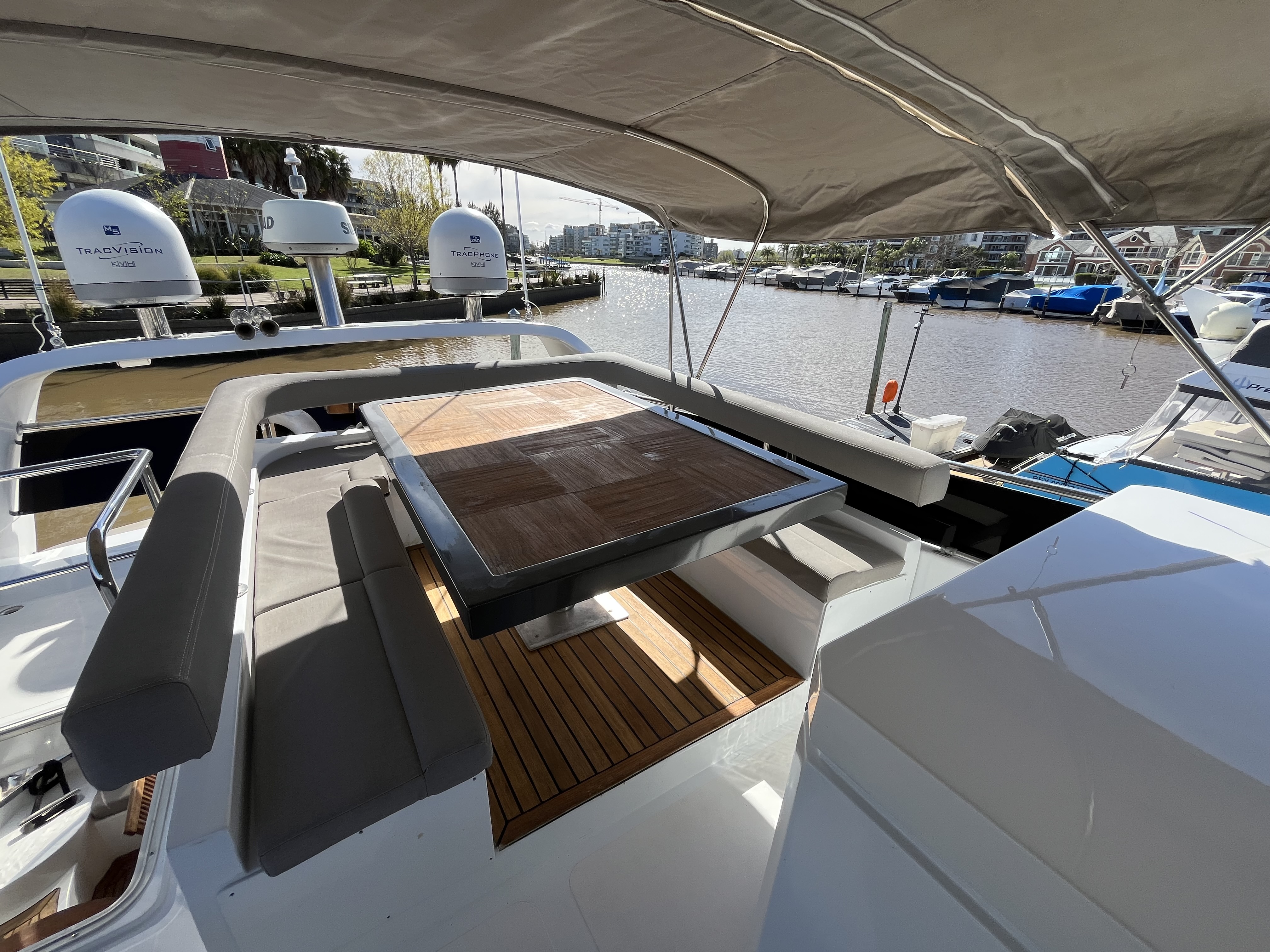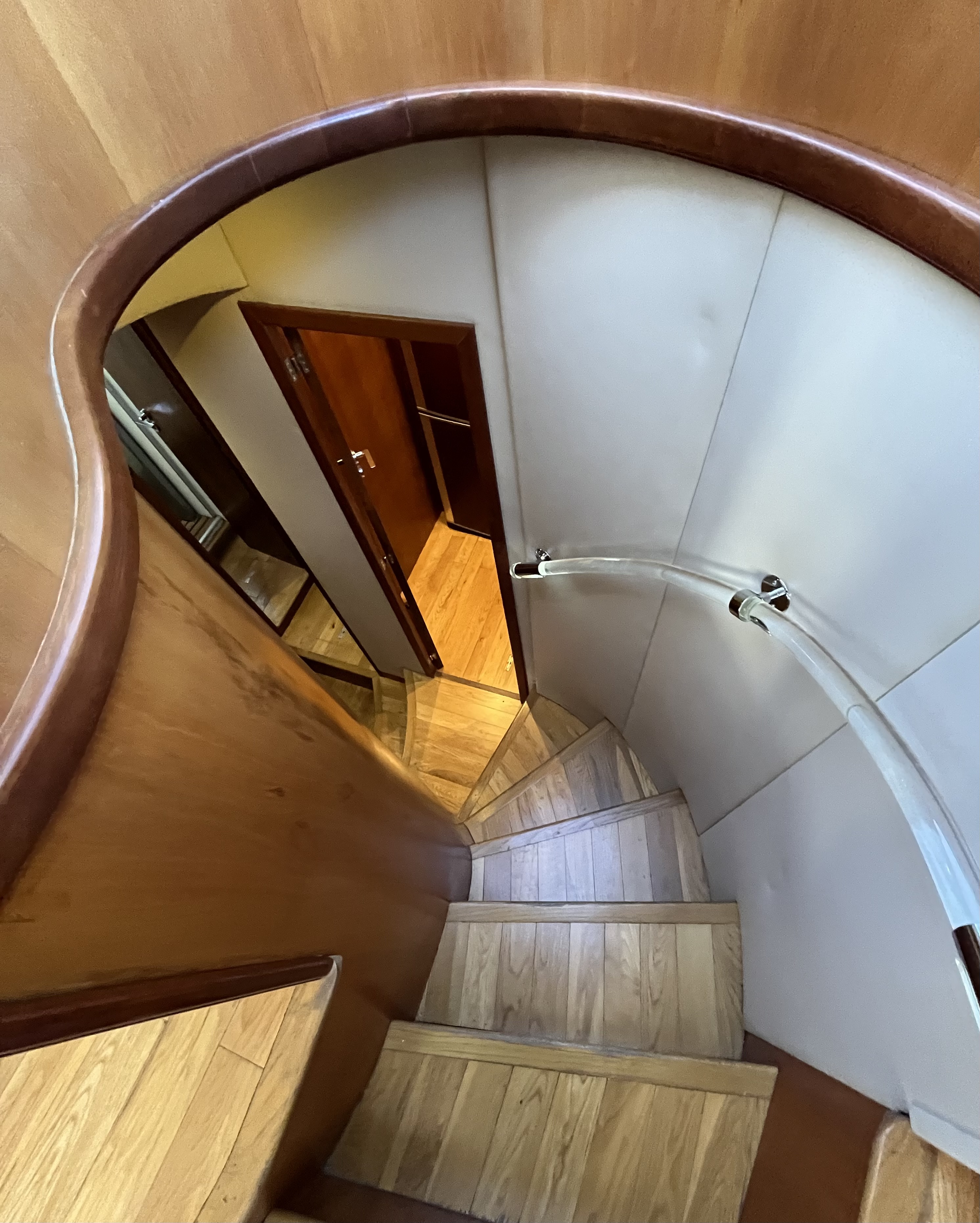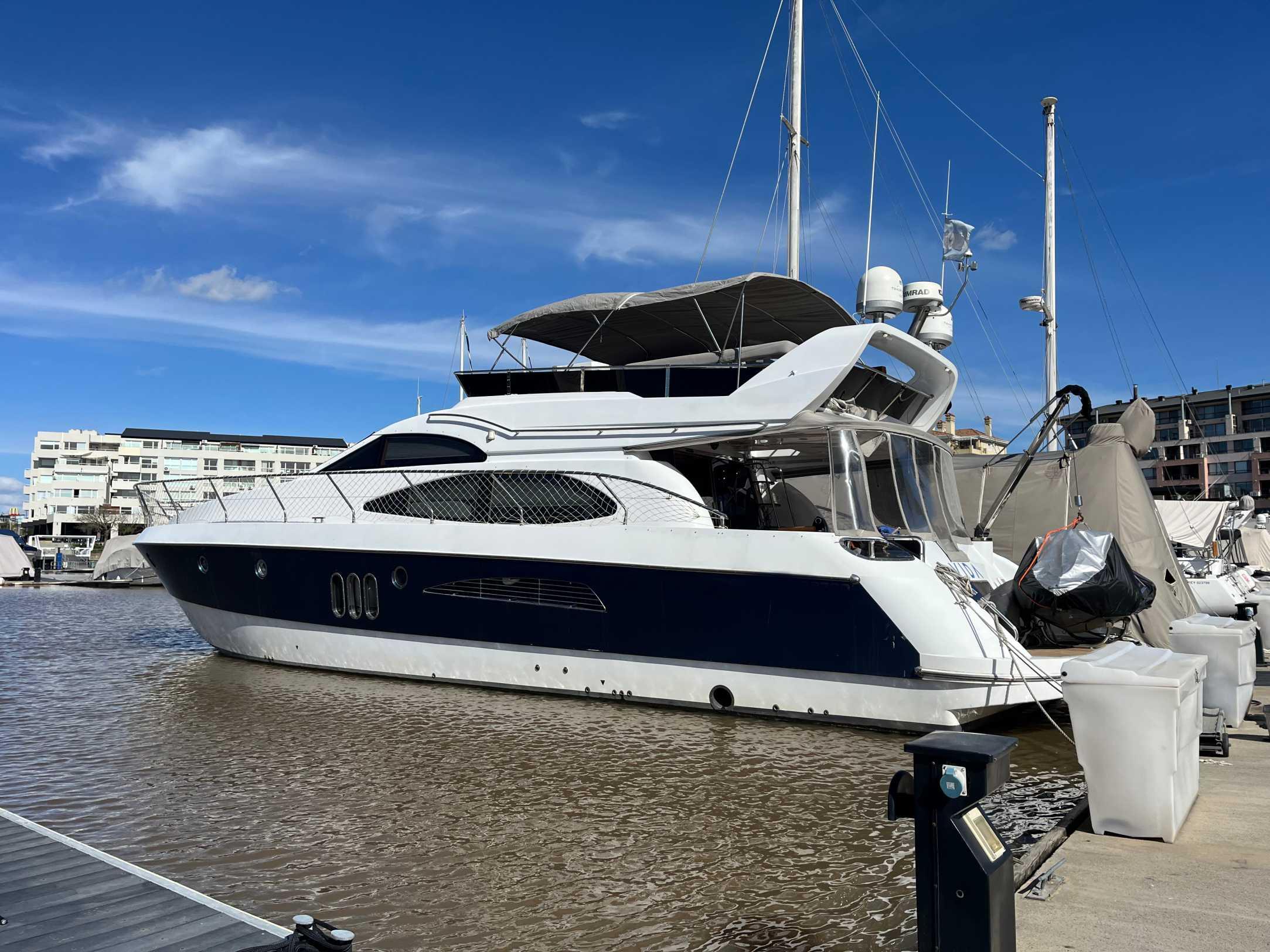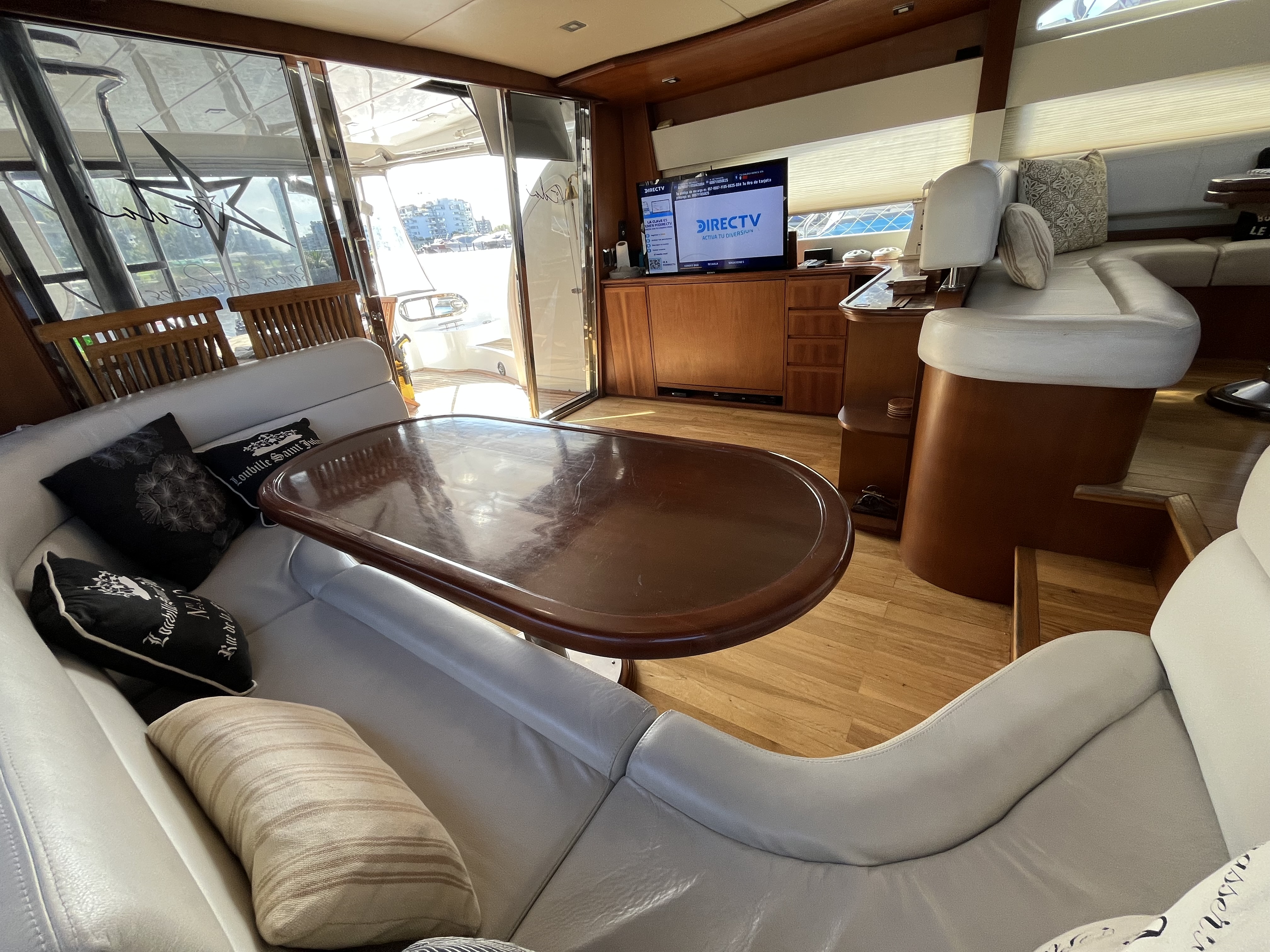 En nivel inferior cocina completa y acceso a camarotes. Camarote doble en proa y camarote principal en popa, cada uno con baño en suite + 3er camarote + baño + camarote marinero con baño, ducha aire y calefacción. Flybridge con área de asientos, solarium.