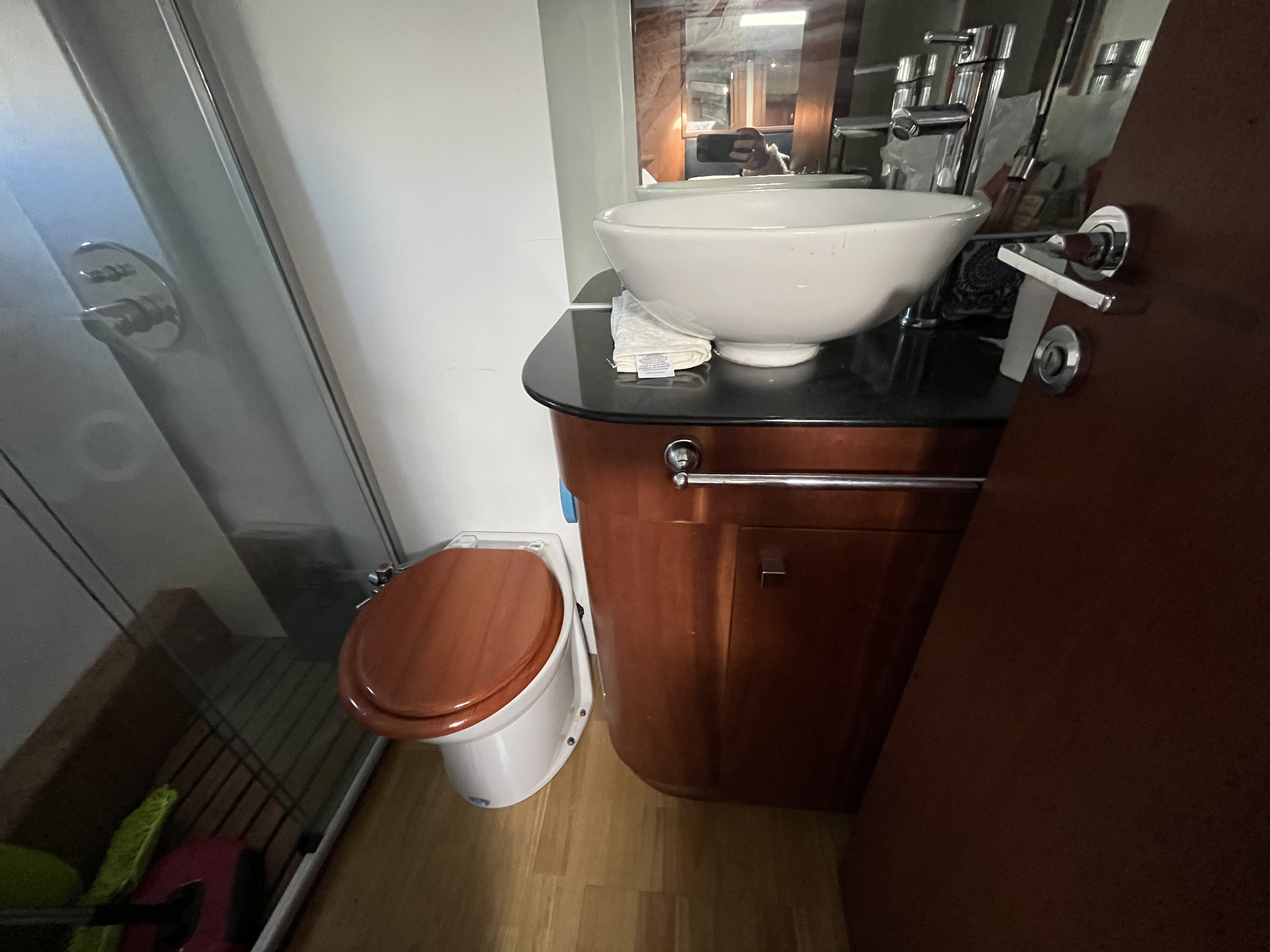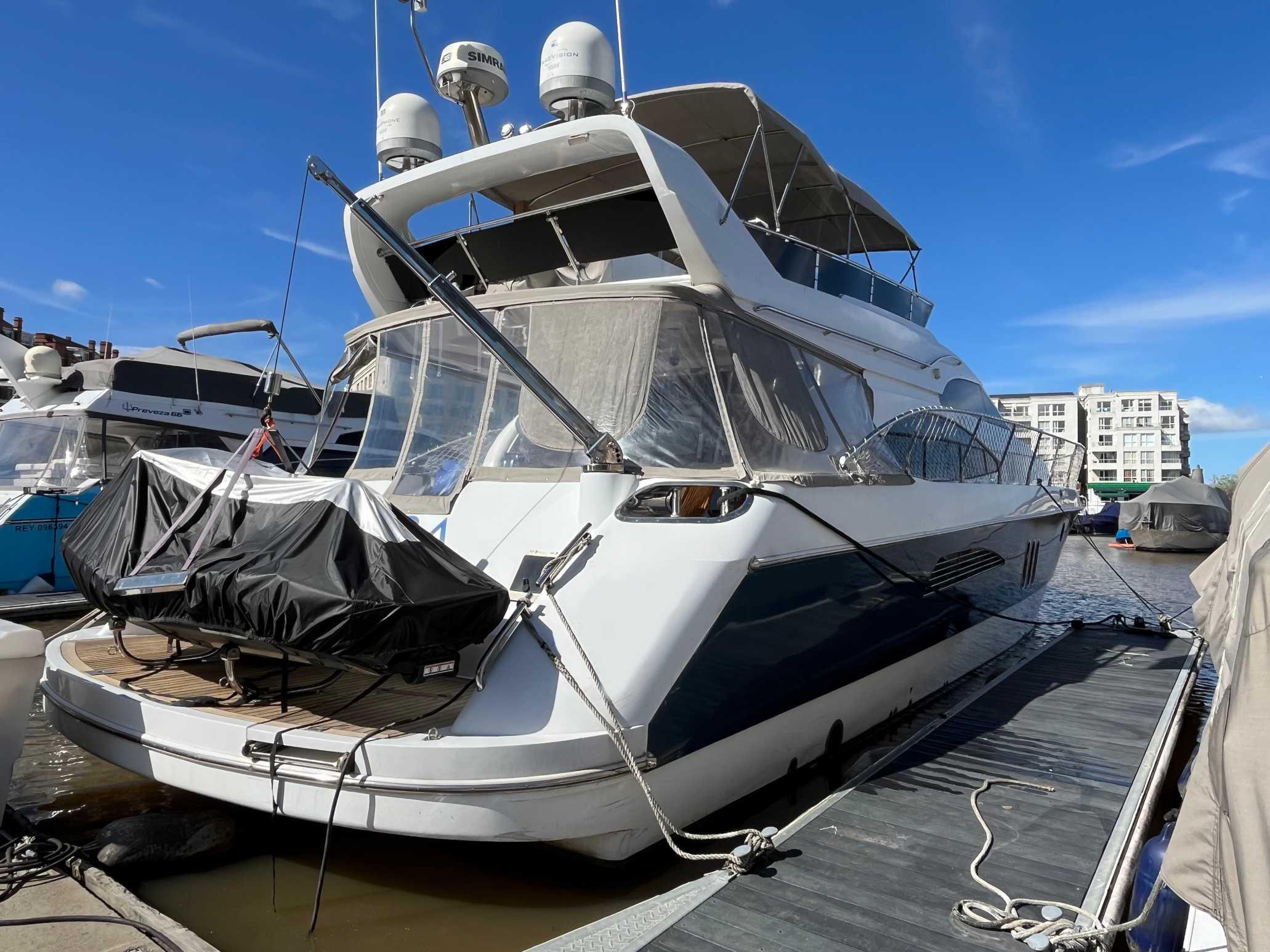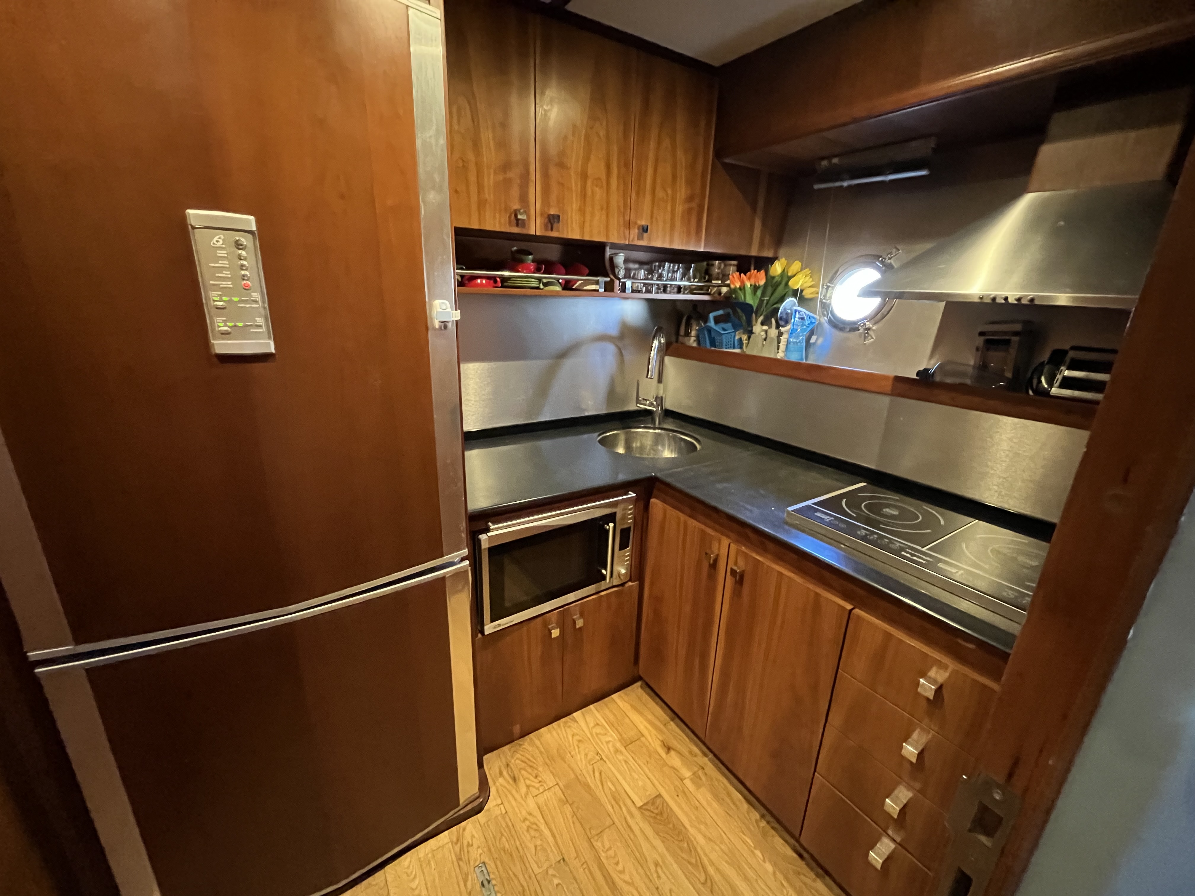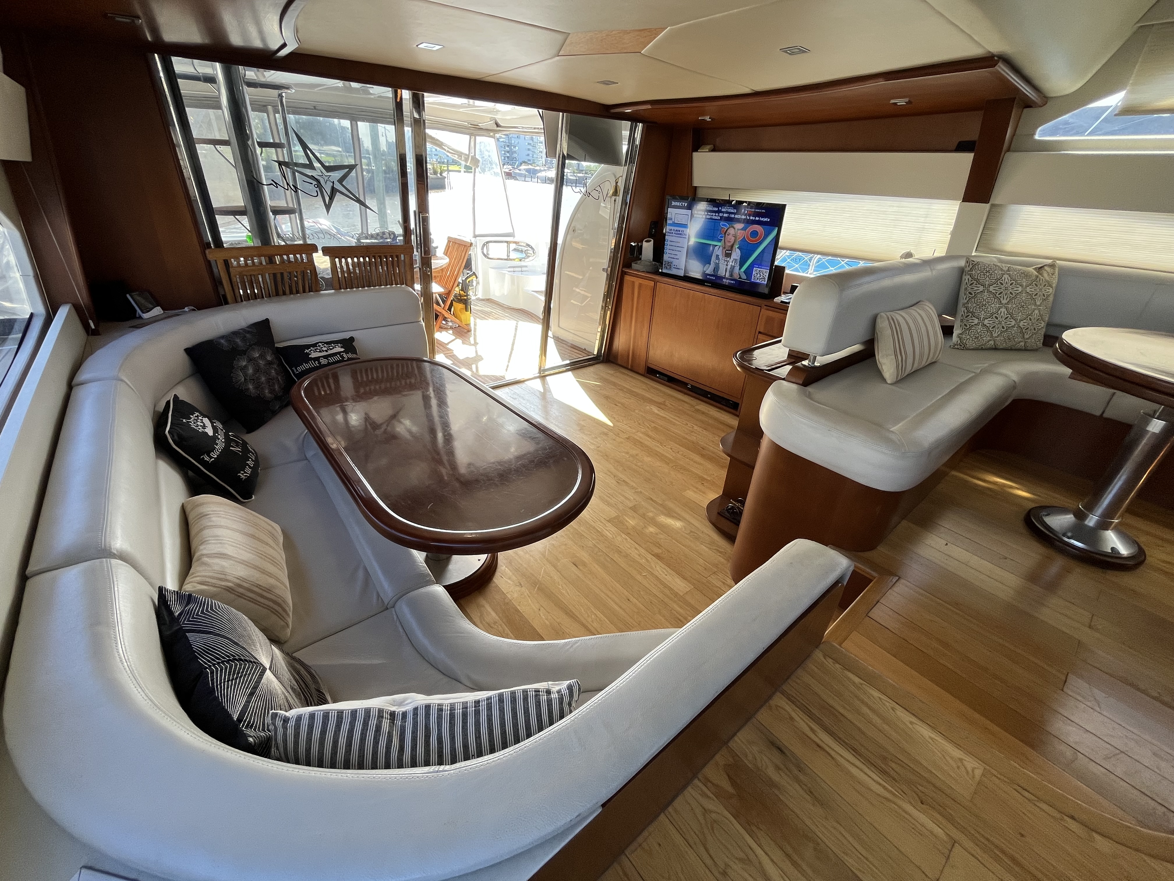 En nivel inferior cocina completa y acceso a camarotes. Camarote doble en proa y camarote principal en popa, cada uno con baño en suite + 3er camarote + baño + camarote marinero con baño, ducha aire y calefacción. Flybridge con área de asientos, solarium.