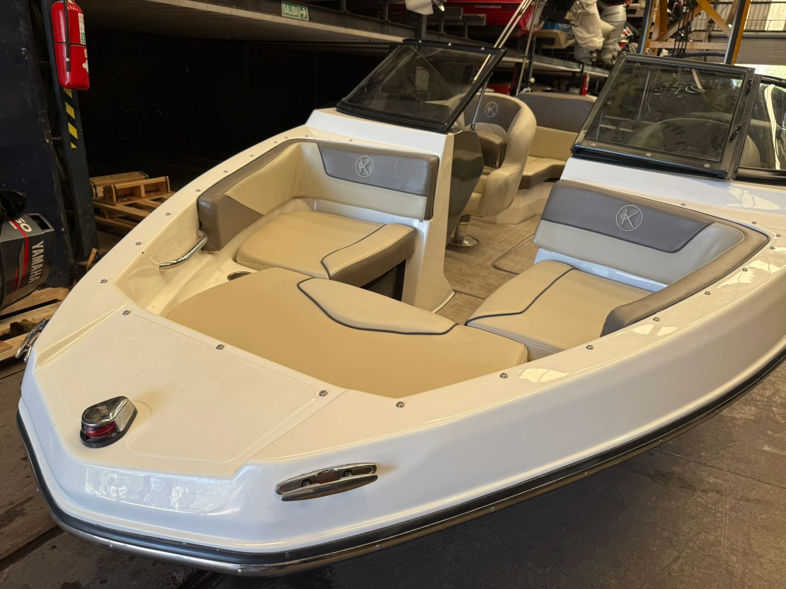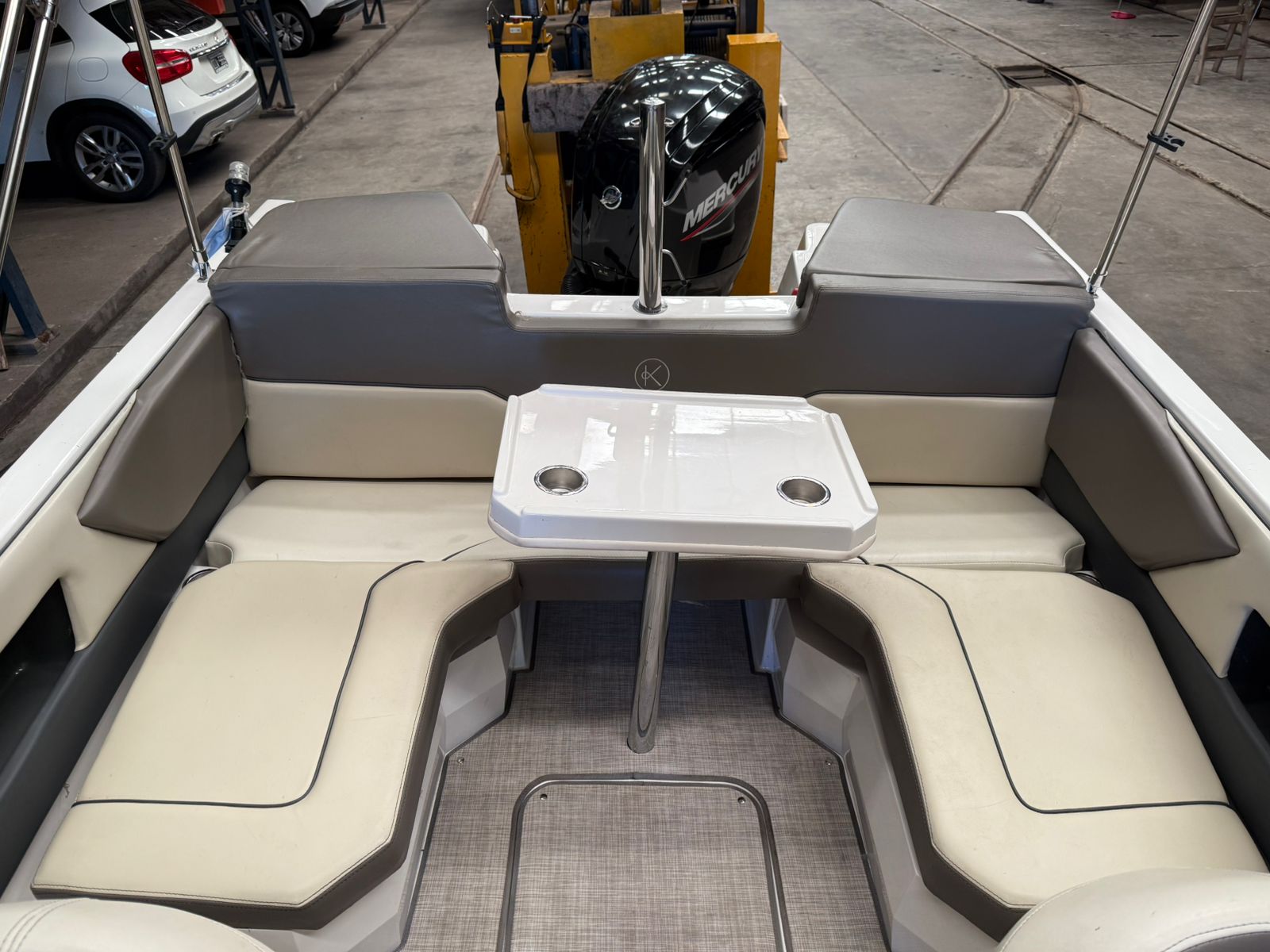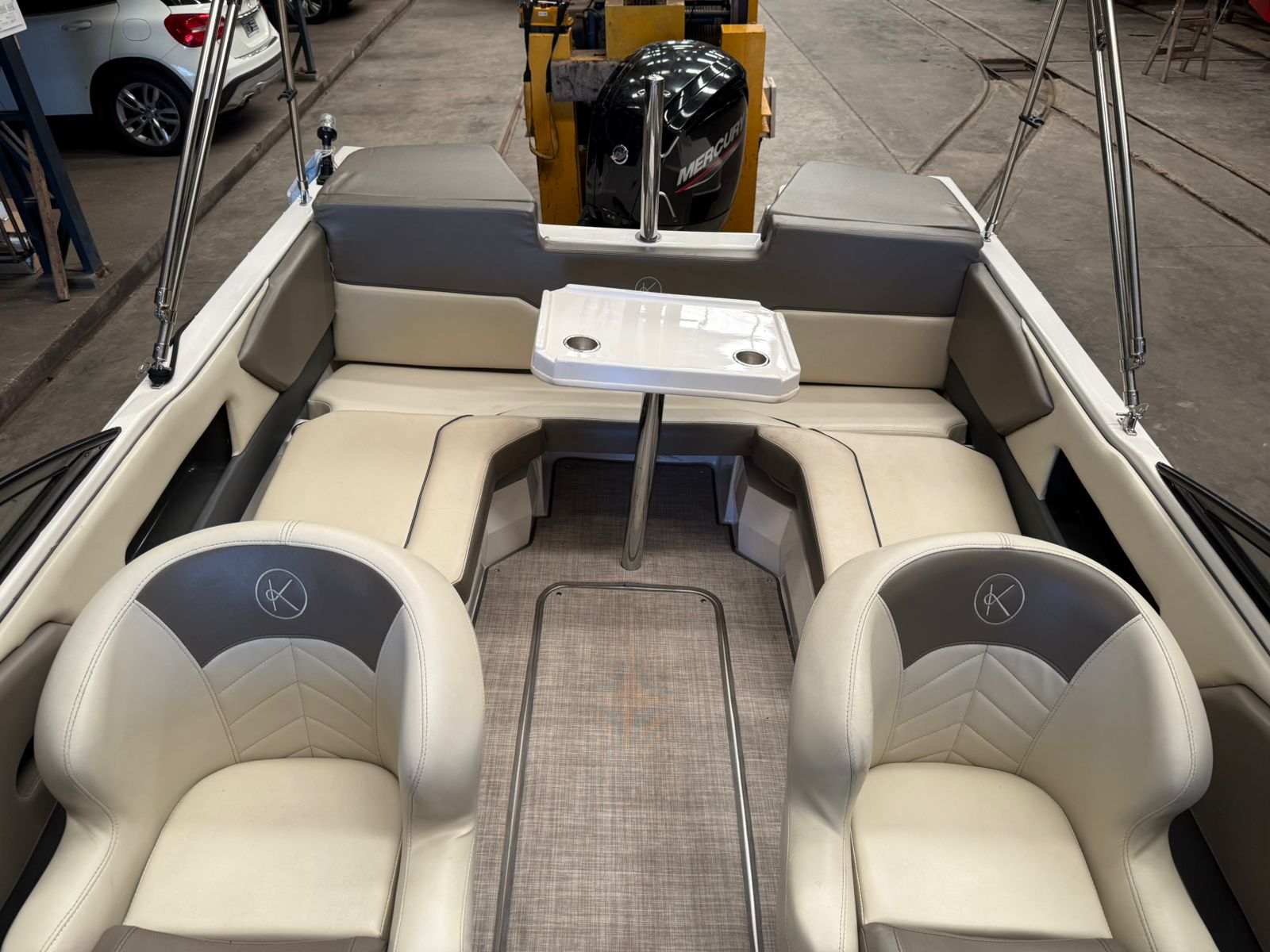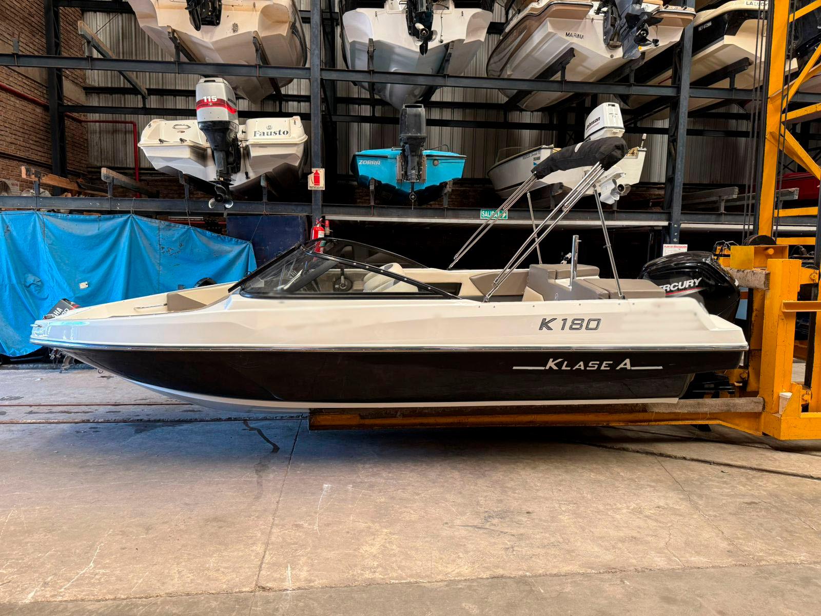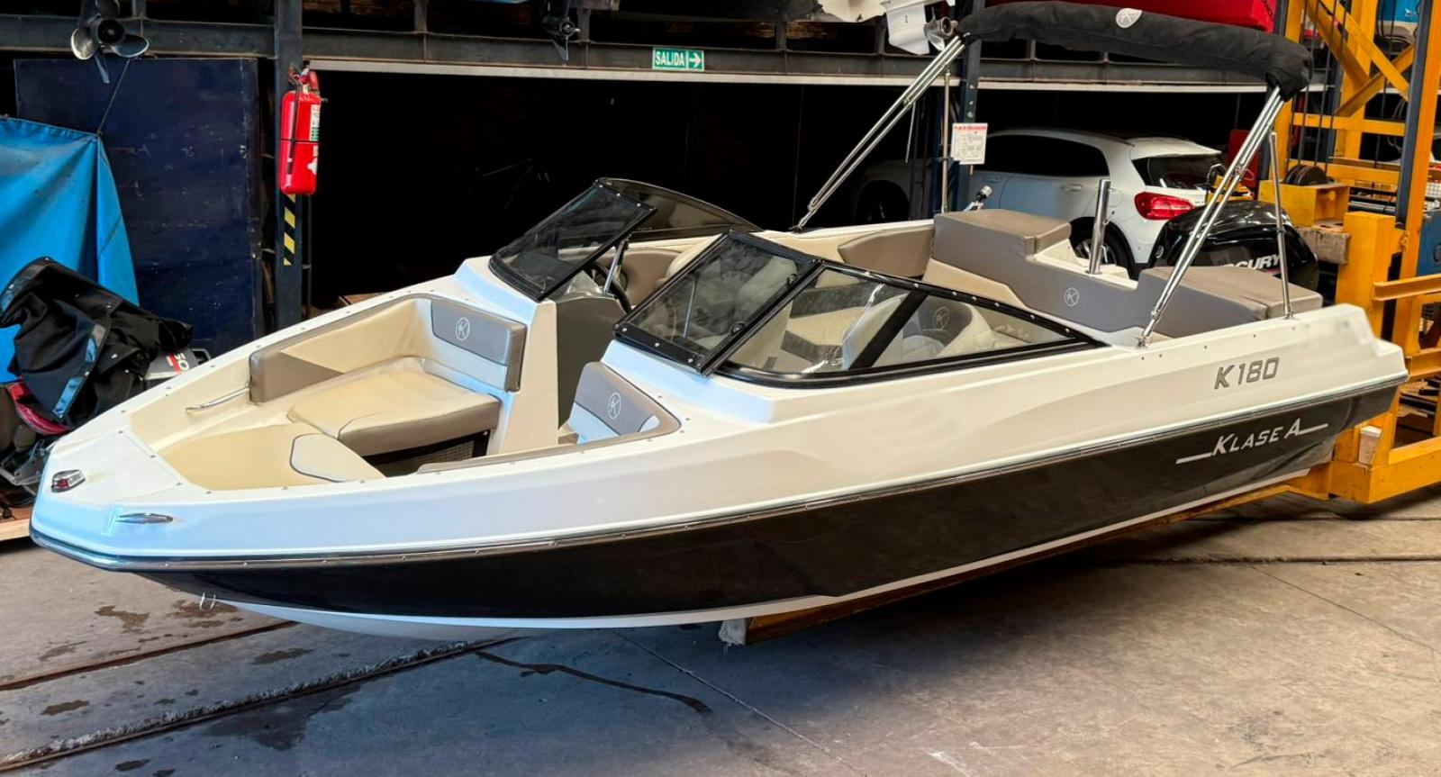 La Klase A K180 es una lancha open que presenta una disposición muy funcional, pensada para el uso recreativo y familiar, priorizando la circulación a bordo, el confort y la versatilidad. En la proa dispone asientos en U, cómodo para dos o tres personas, ideal para descanso, sociabilización o tomar sol, con espacio libre que facilita el movimiento y el acceso. A estribor, ofrece una consola con buena visibilidad del instrumental, acompañado por un asiento individual para el timonel. En el cockpit central se desarrolla el área social principal, con asientos enfrentados que permiten acomodar a varios pasajeros, generando un espacio amplio y bien integrado para compartir la navegación y otra butaca del acompañante. Hacia popa, la embarcación cuenta con una plataforma de baño baja a cada lado del motor, de fácil acceso al agua, ideal para actividades recreativas. Escalera de baño en popa. Toda la lancha tiene amplios espacios de guardado bajo los asientos, pensados para alojar elementos de seguridad y equipamiento, manteniendo la cubierta ordenada.