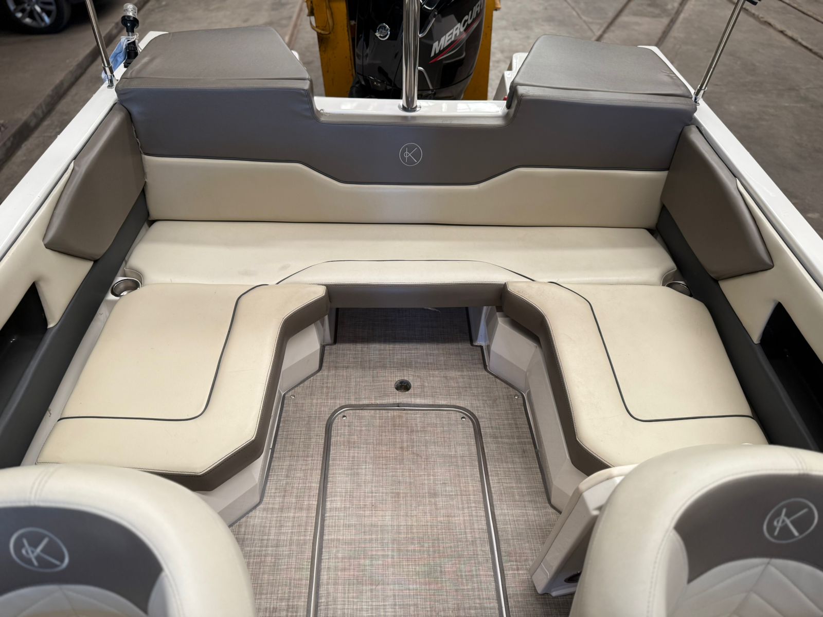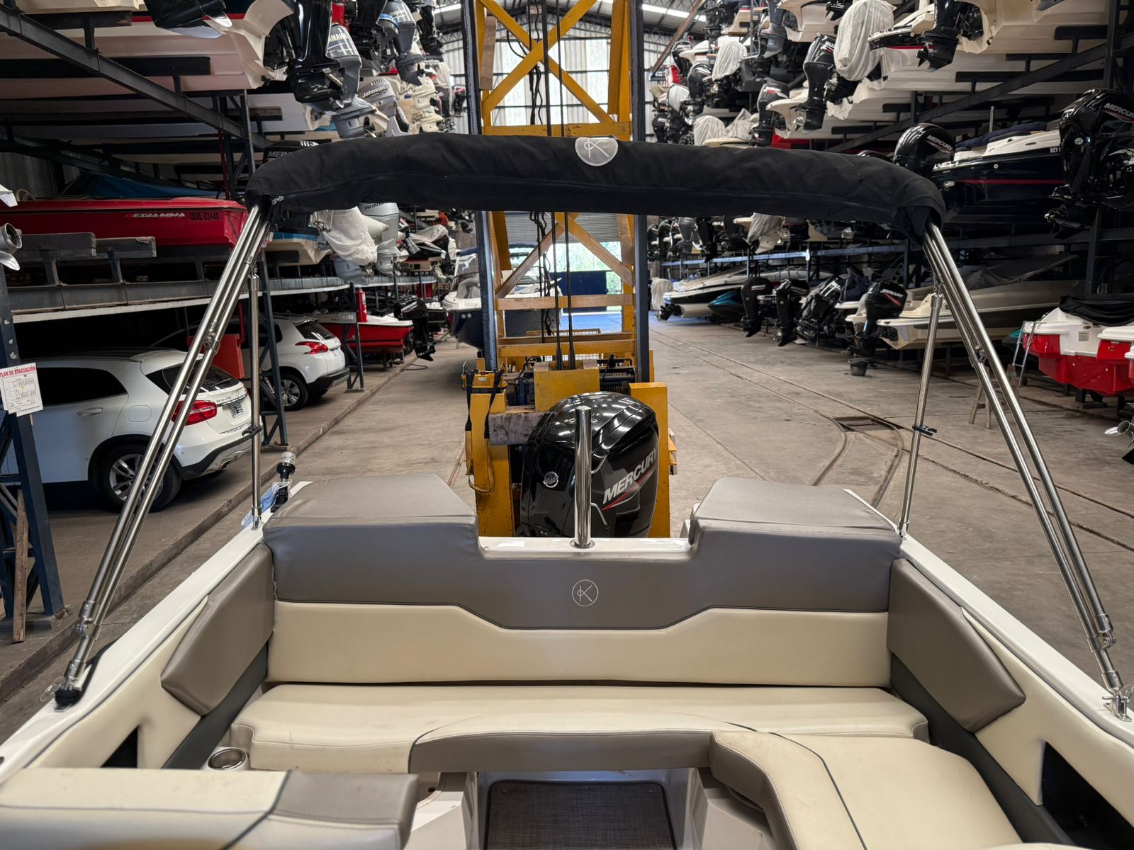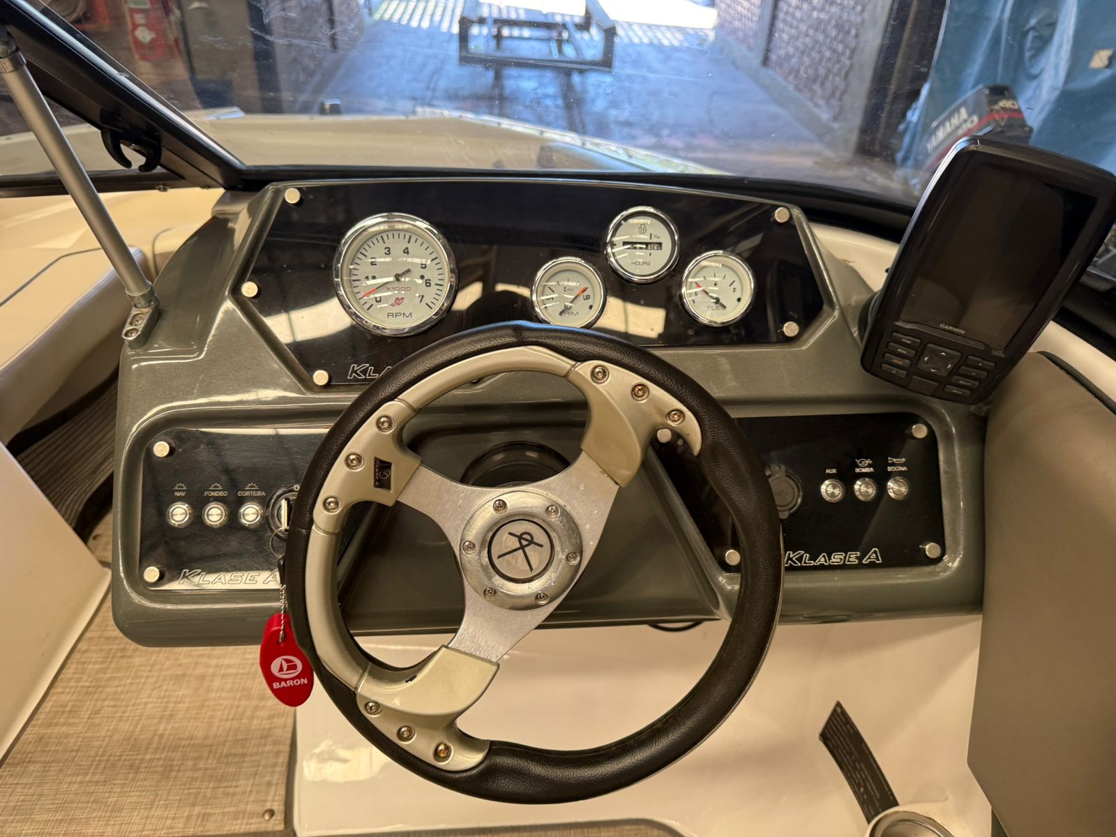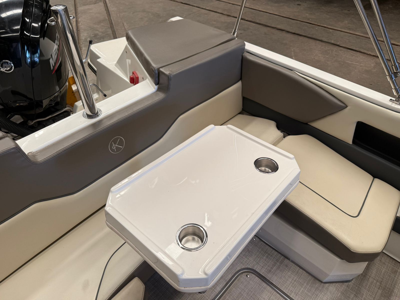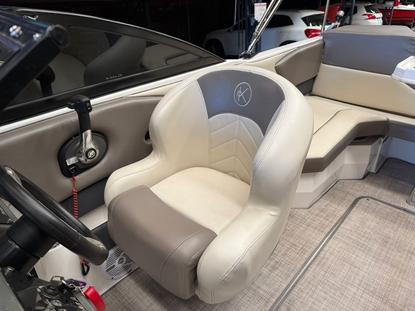 La Klase A K180 es una lancha open que presenta una disposición muy funcional, pensada para el uso recreativo y familiar, priorizando la circulación a bordo, el confort y la versatilidad. En la proa dispone asientos en U, cómodo para dos o tres personas, ideal para descanso, sociabilización o tomar sol, con espacio libre que facilita el movimiento y el acceso. A estribor, ofrece una consola con buena visibilidad del instrumental, acompañado por un asiento individual para el timonel. En el cockpit central se desarrolla el área social principal, con asientos enfrentados que permiten acomodar a varios pasajeros, generando un espacio amplio y bien integrado para compartir la navegación y otra butaca del acompañante. Hacia popa, la embarcación cuenta con una plataforma de baño baja a cada lado del motor, de fácil acceso al agua, ideal para actividades recreativas. Escalera de baño en popa. Toda la lancha tiene amplios espacios de guardado bajo los asientos, pensados para alojar elementos de seguridad y equipamiento, manteniendo la cubierta ordenada.