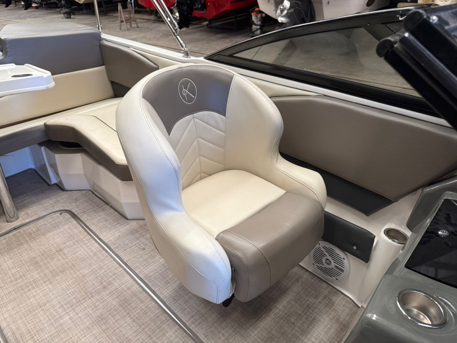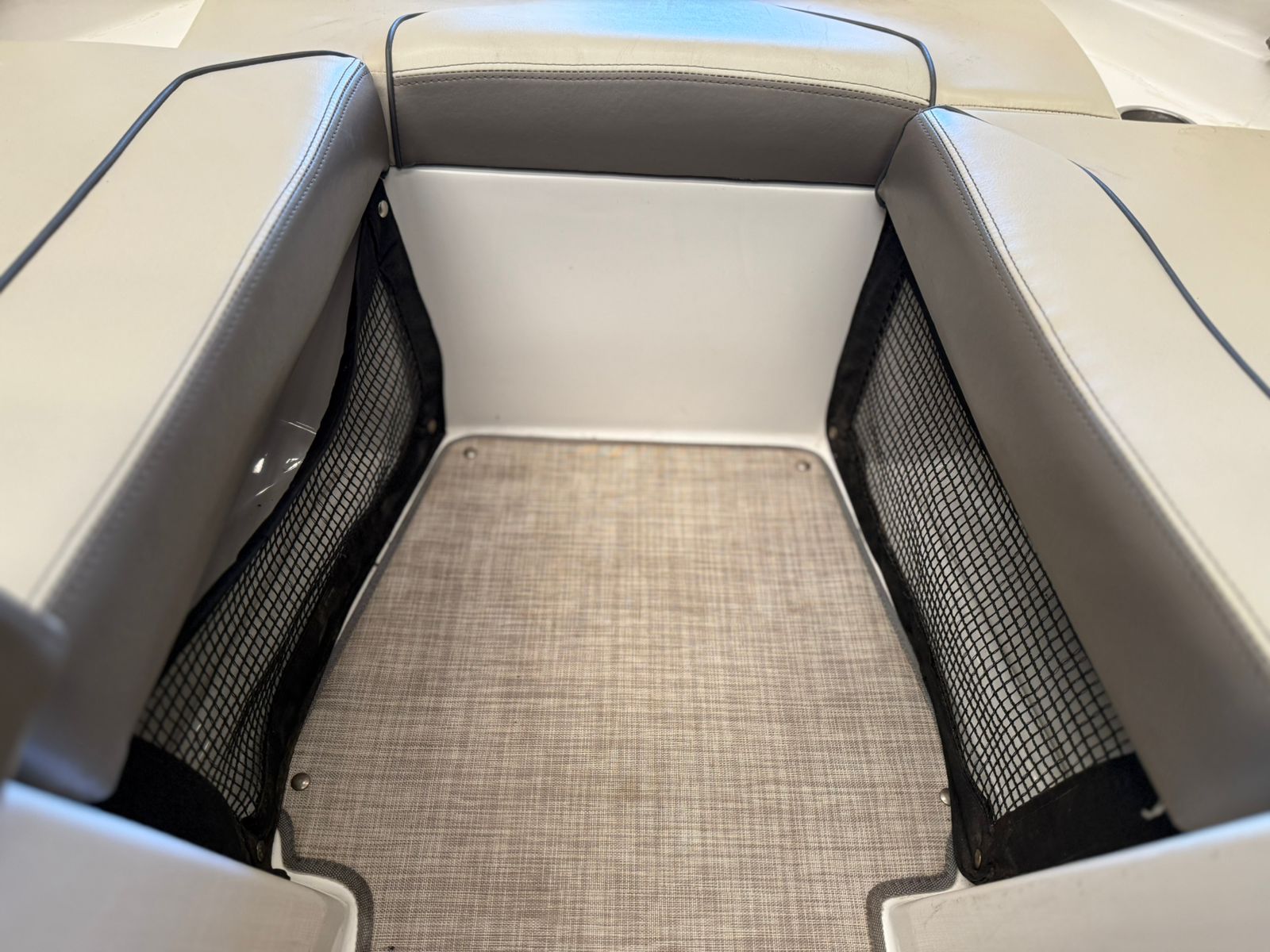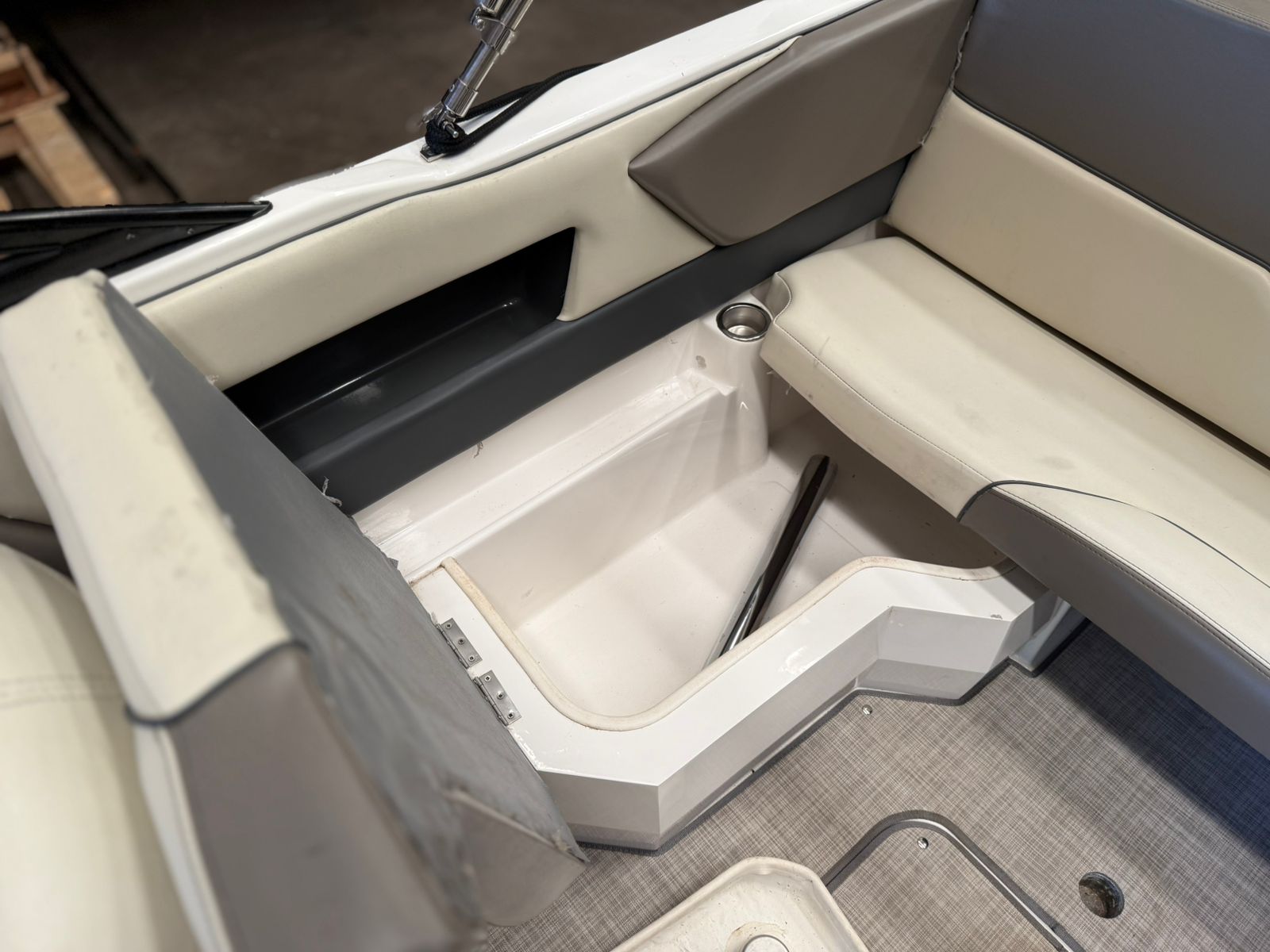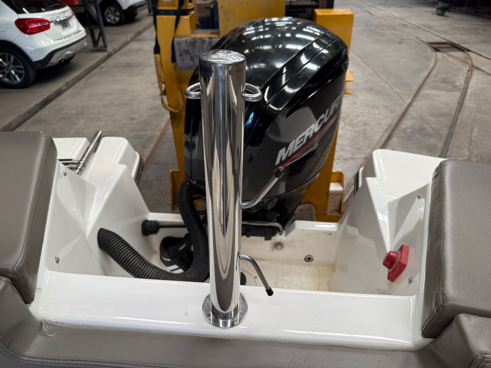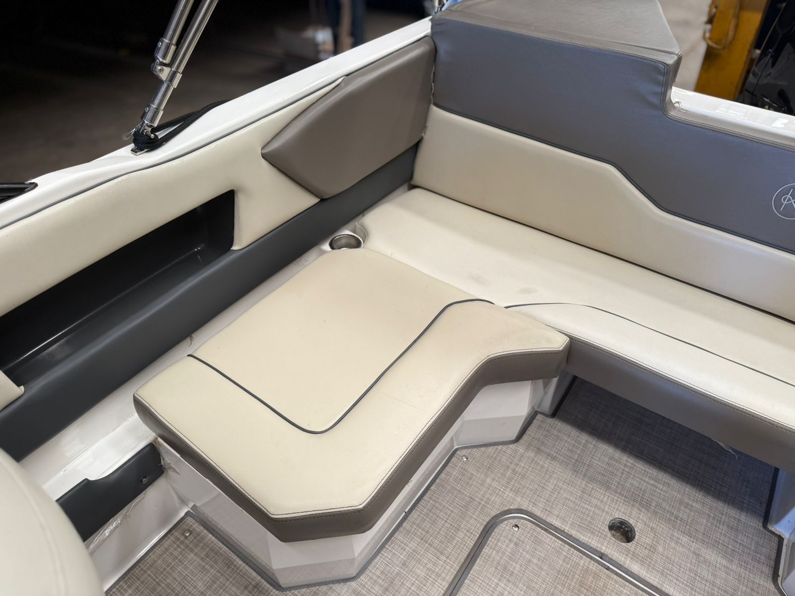 La Klase A K180 es una lancha open que presenta una disposición muy funcional, pensada para el uso recreativo y familiar, priorizando la circulación a bordo, el confort y la versatilidad. En la proa dispone asientos en U, cómodo para dos o tres personas, ideal para descanso, sociabilización o tomar sol, con espacio libre que facilita el movimiento y el acceso. A estribor, ofrece una consola con buena visibilidad del instrumental, acompañado por un asiento individual para el timonel. En el cockpit central se desarrolla el área social principal, con asientos enfrentados que permiten acomodar a varios pasajeros, generando un espacio amplio y bien integrado para compartir la navegación y otra butaca del acompañante. Hacia popa, la embarcación cuenta con una plataforma de baño baja a cada lado del motor, de fácil acceso al agua, ideal para actividades recreativas. Escalera de baño en popa. Toda la lancha tiene amplios espacios de guardado bajo los asientos, pensados para alojar elementos de seguridad y equipamiento, manteniendo la cubierta ordenada.